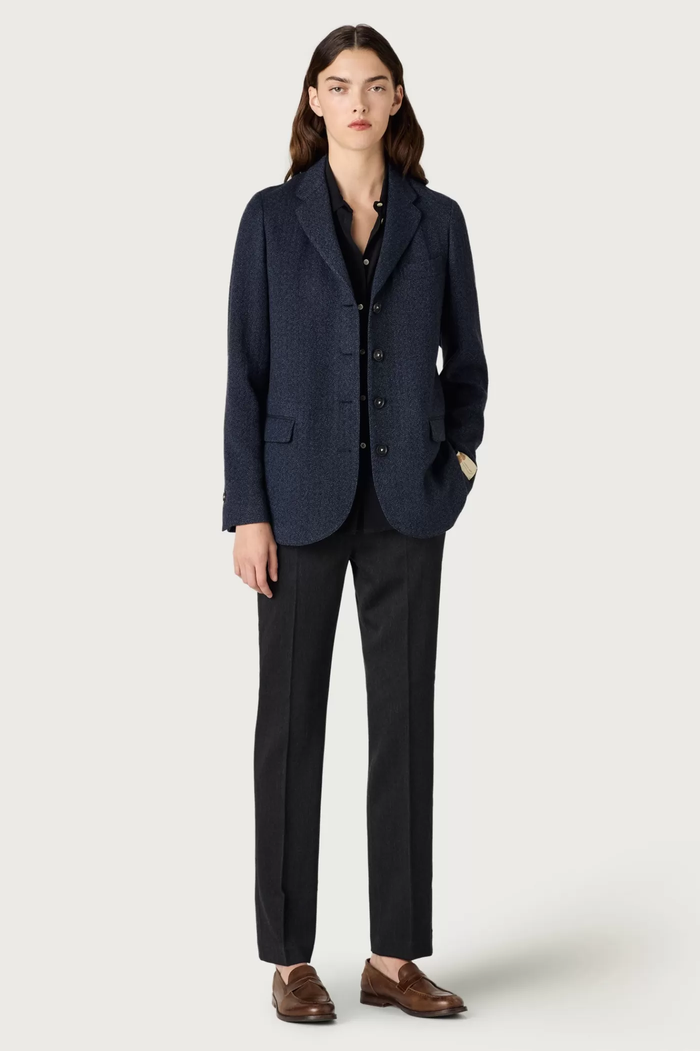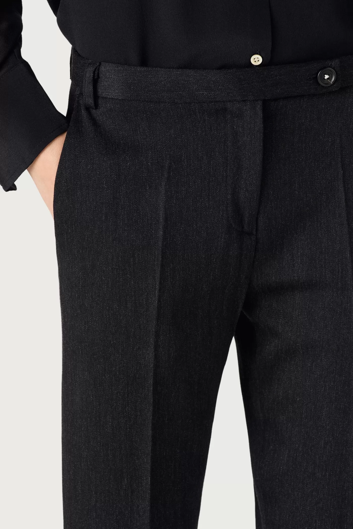 Medium-rise pants with flat front, skinny fit, slanted pockets, zip closure with tab and button, made of comfort wool satin.