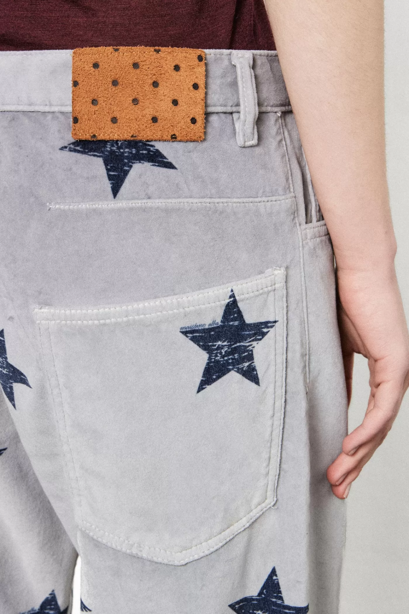 Five-pocket pants, straight leg, cropped at the ankle with frayed hem, relaxed fit, zip and button closure, made of printed pure cotton velvet.