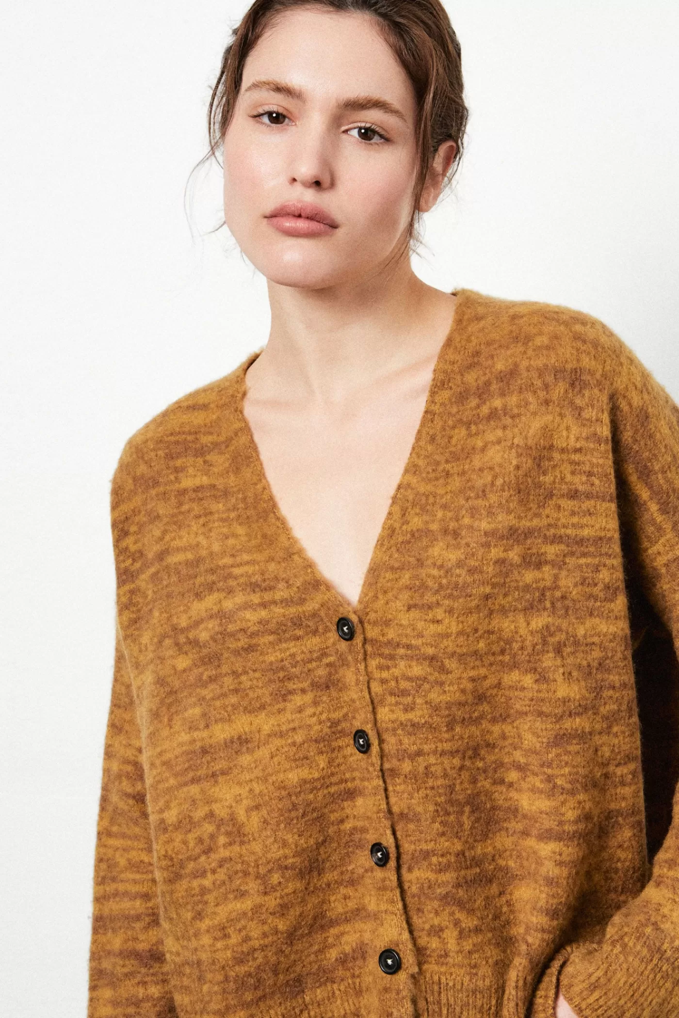 Overfit V-neck cardigan with five buttons and ribbed edges, made from soft moulin brushed cashmere in G.8 stocking stitch.