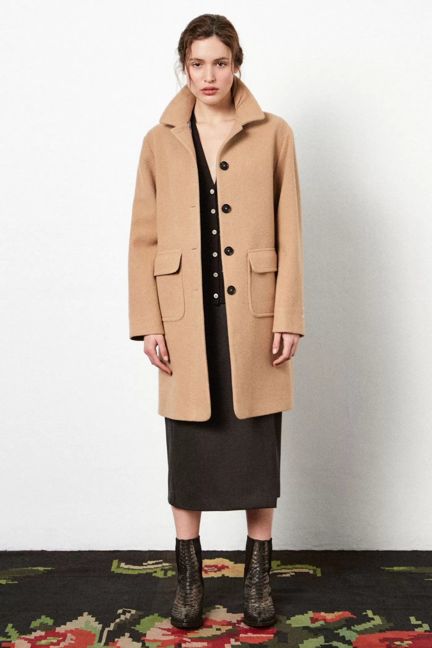 Single-breasted coat with five horn buttons, small collar, flap pockets, made of cashmere wool.