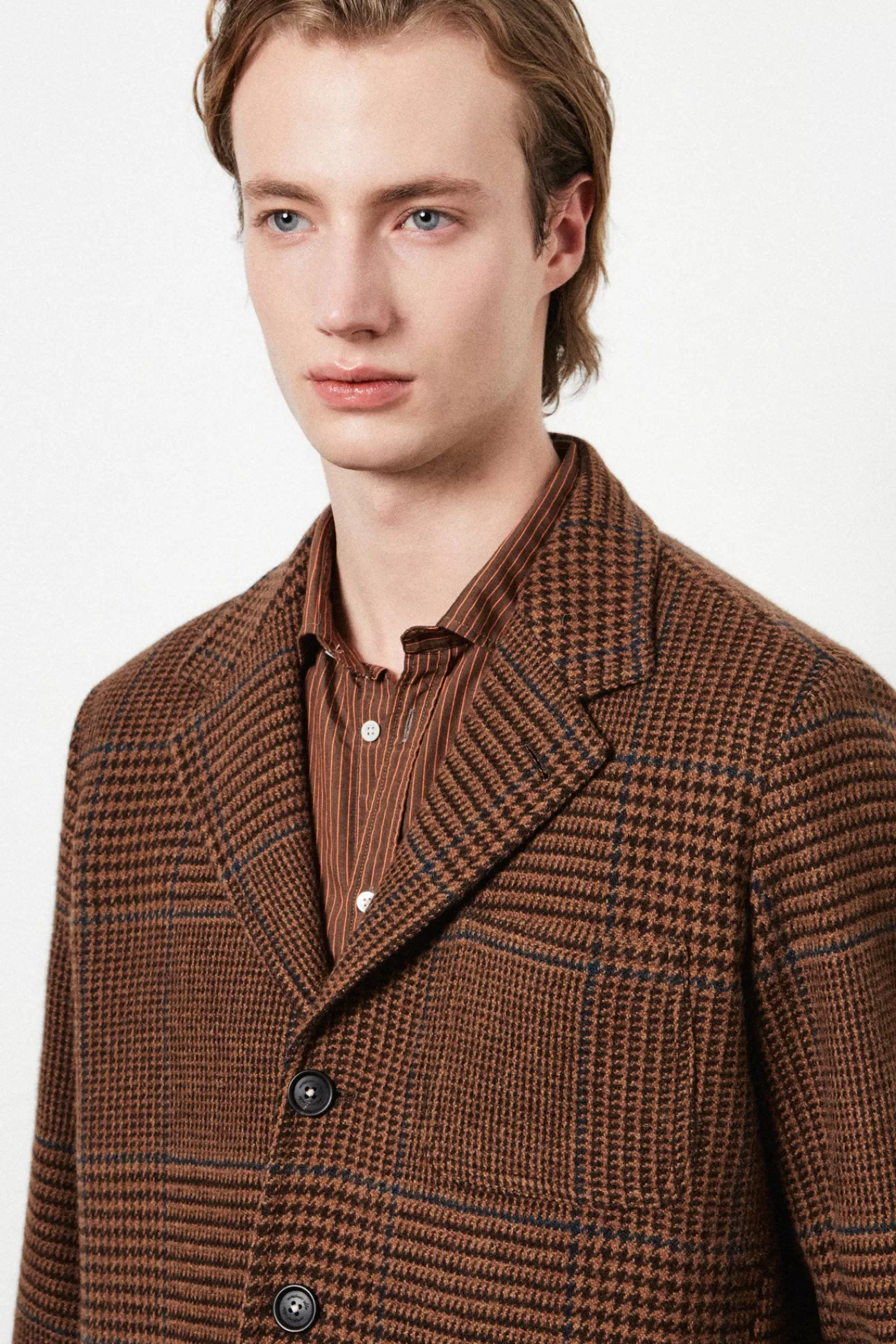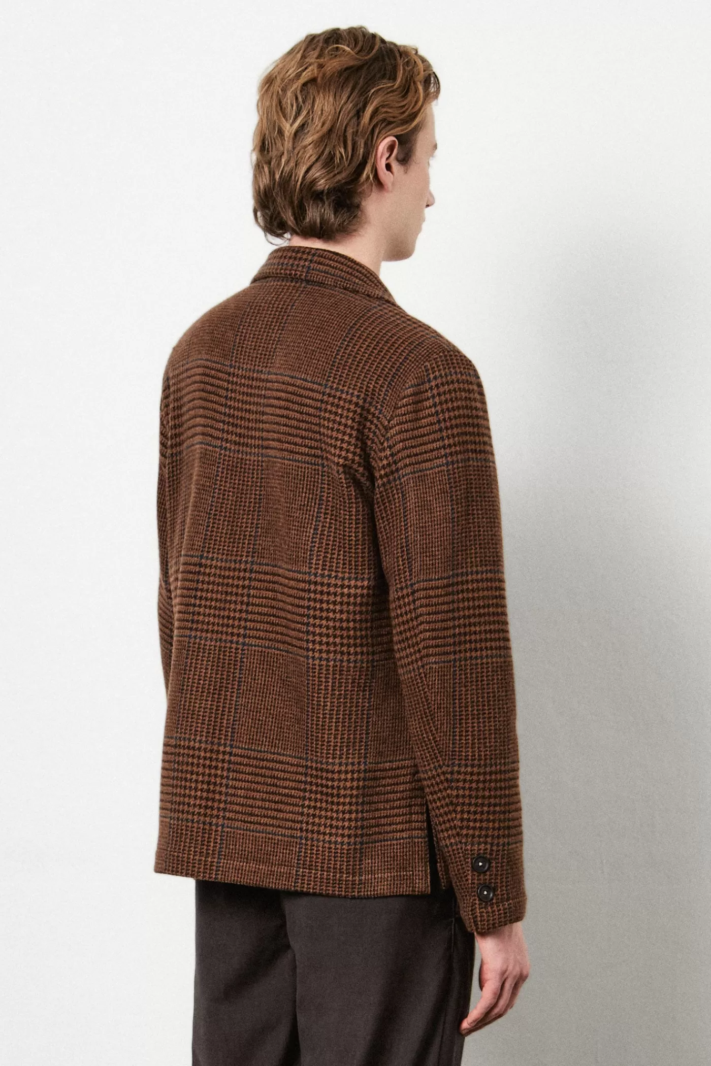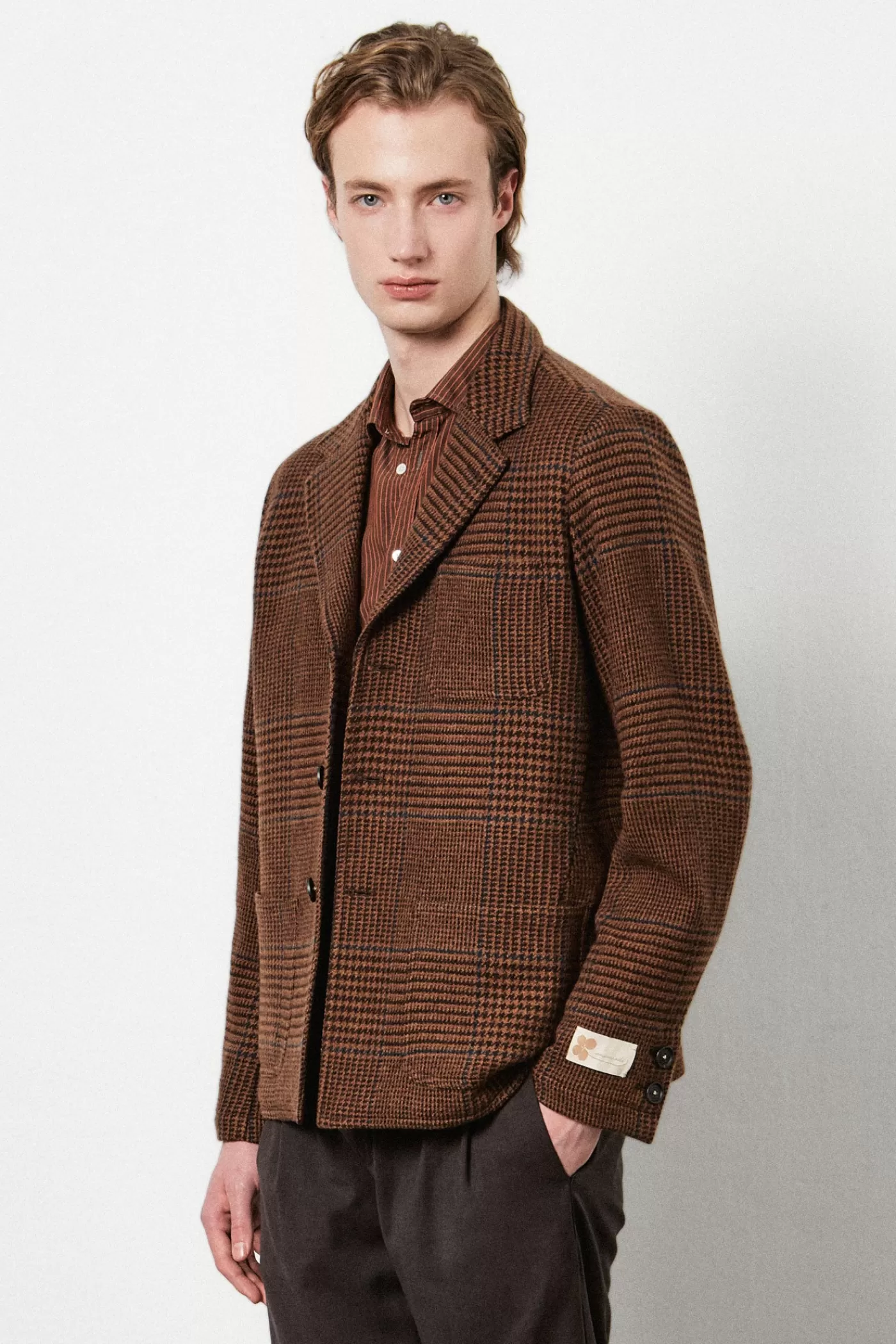 Informal jacket with four buttons, three patch pockets, and side vents, made of pure wool.