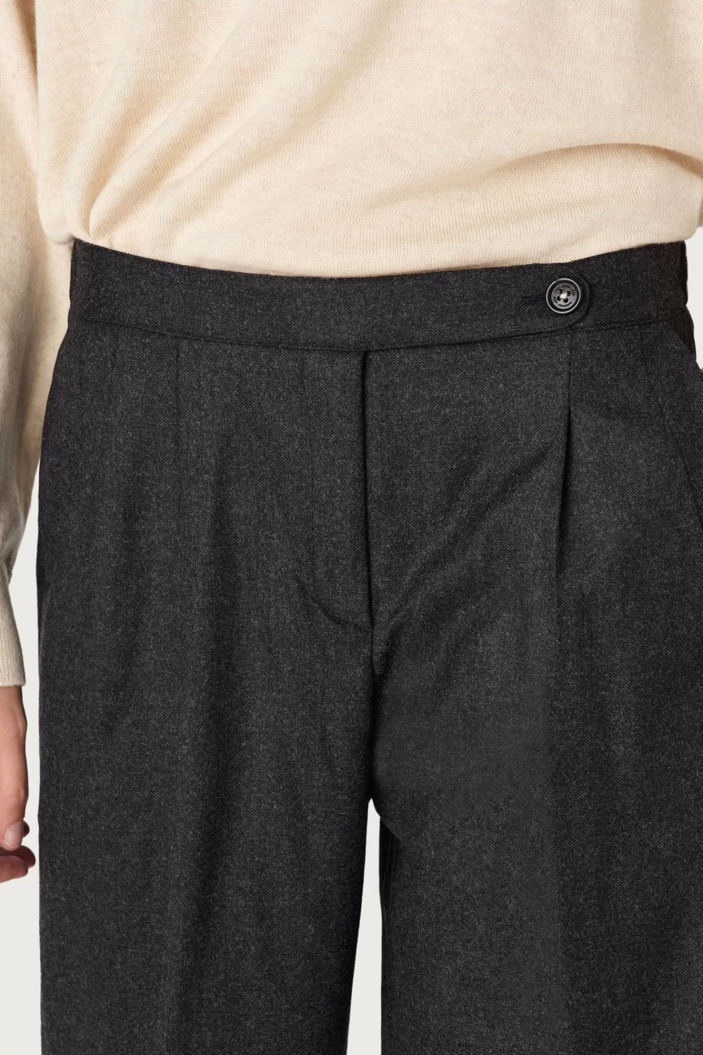 Medium-rise pants with comfort fit, double pleats, cuffs at the hem, zip and horn button closure with side tab, made of cashmere wool flannel.