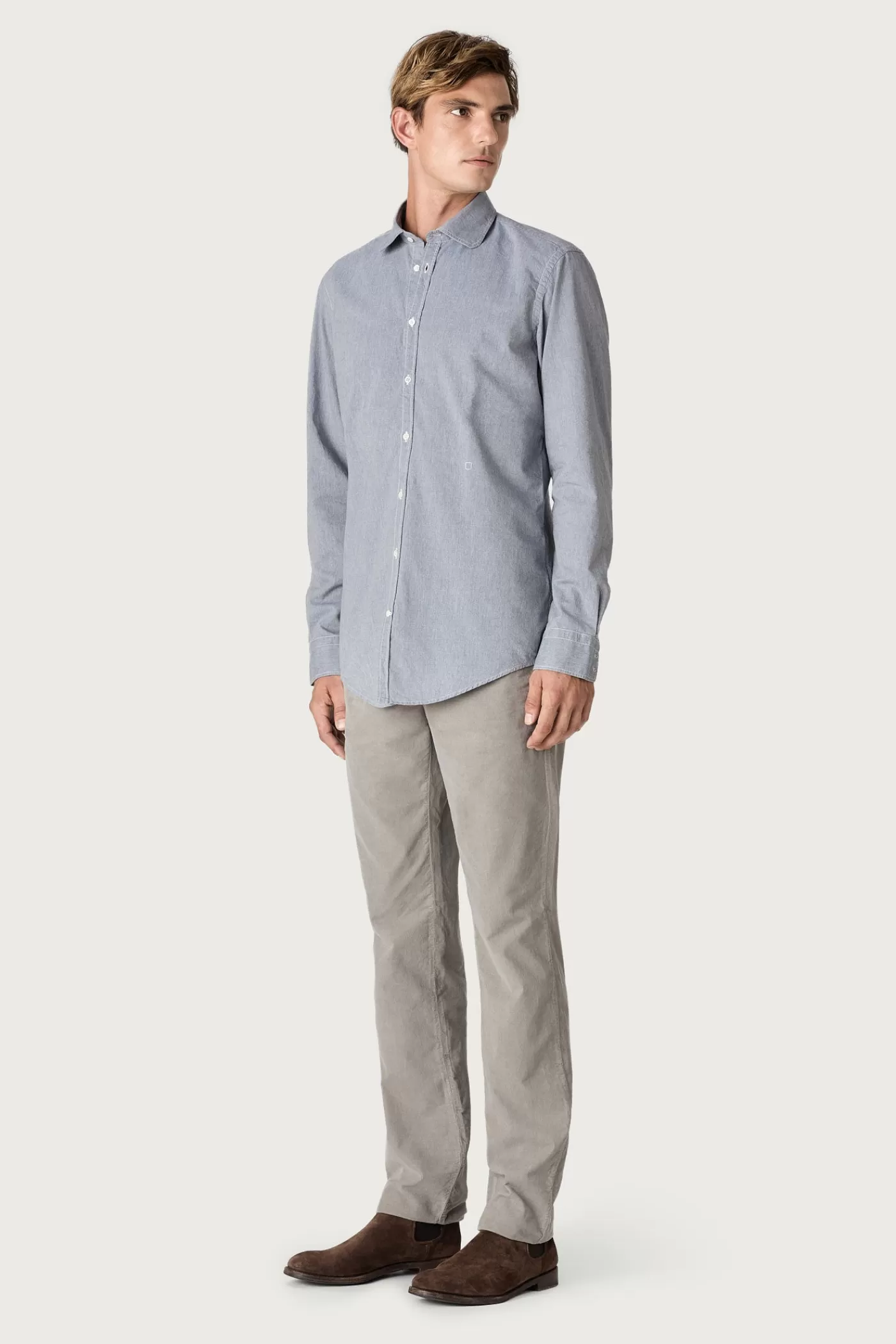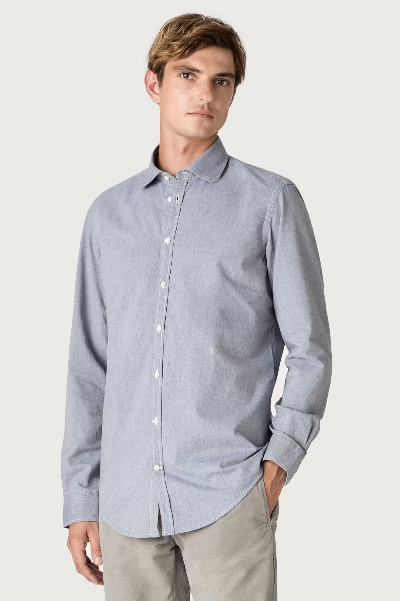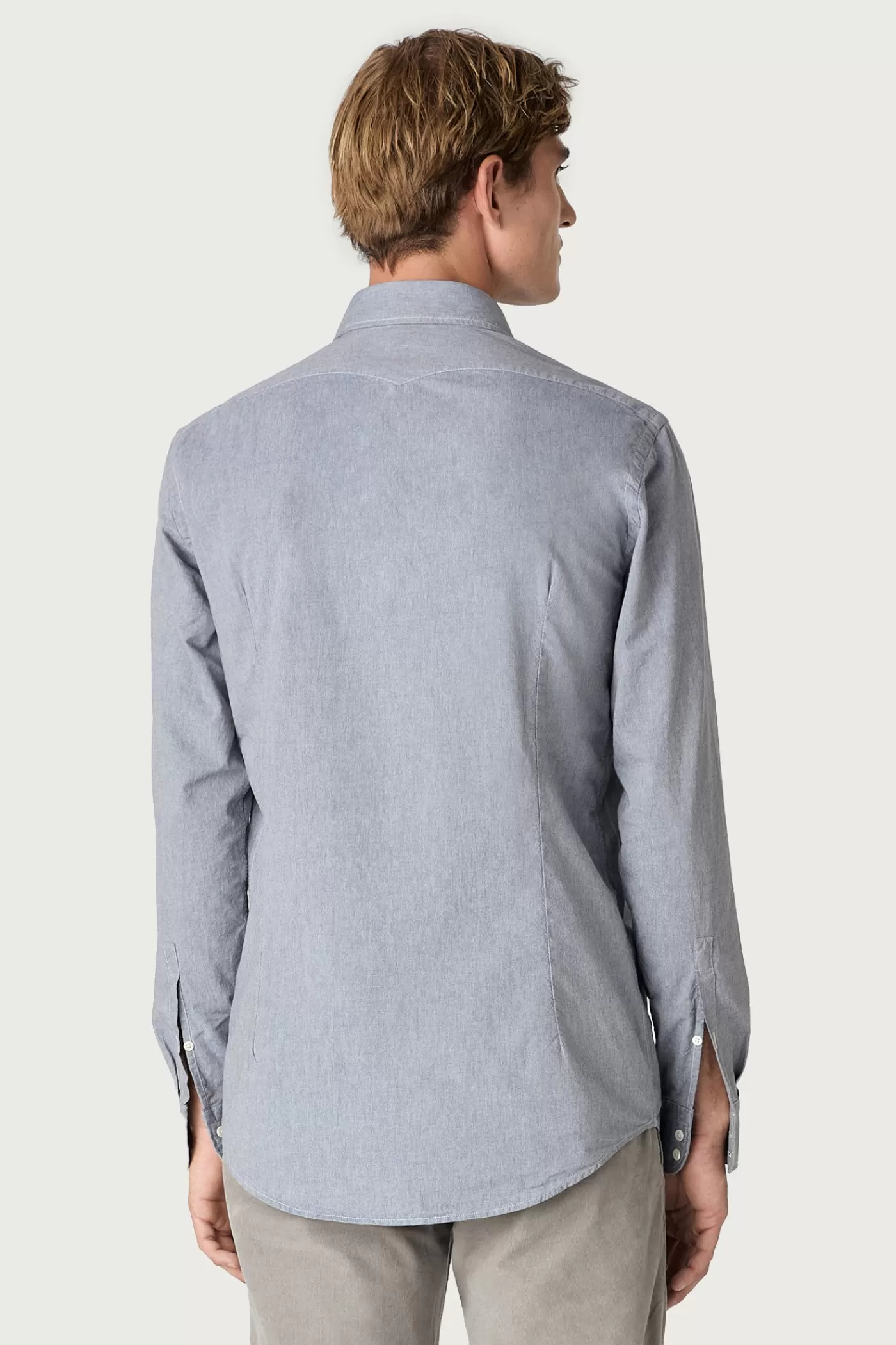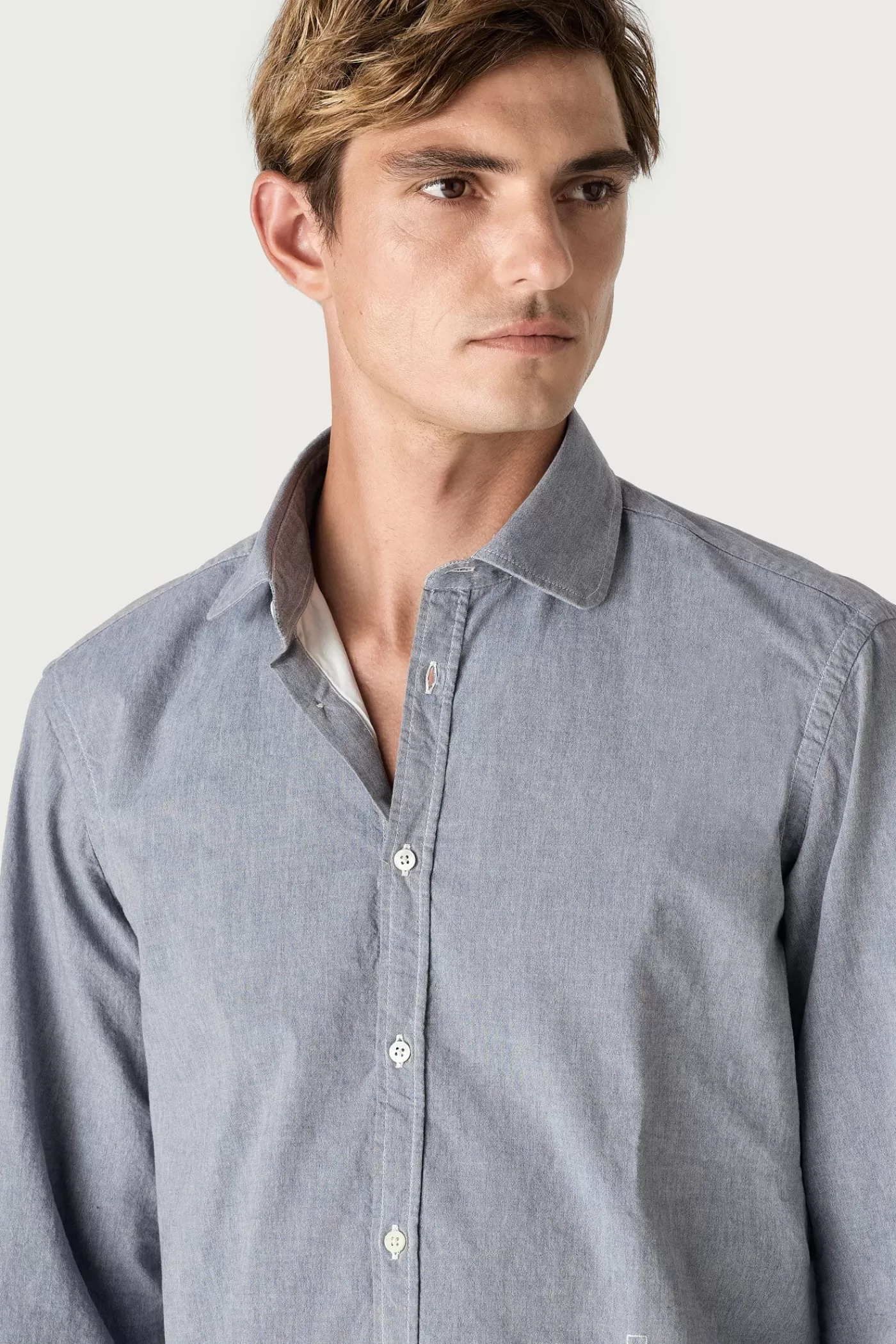 Regular fit shirt with a rounded collar. Classic soft front placket, cotton voile inner bib, badge embroidery for the customers initials, pointed rear yoke. Made from chambray cotton.