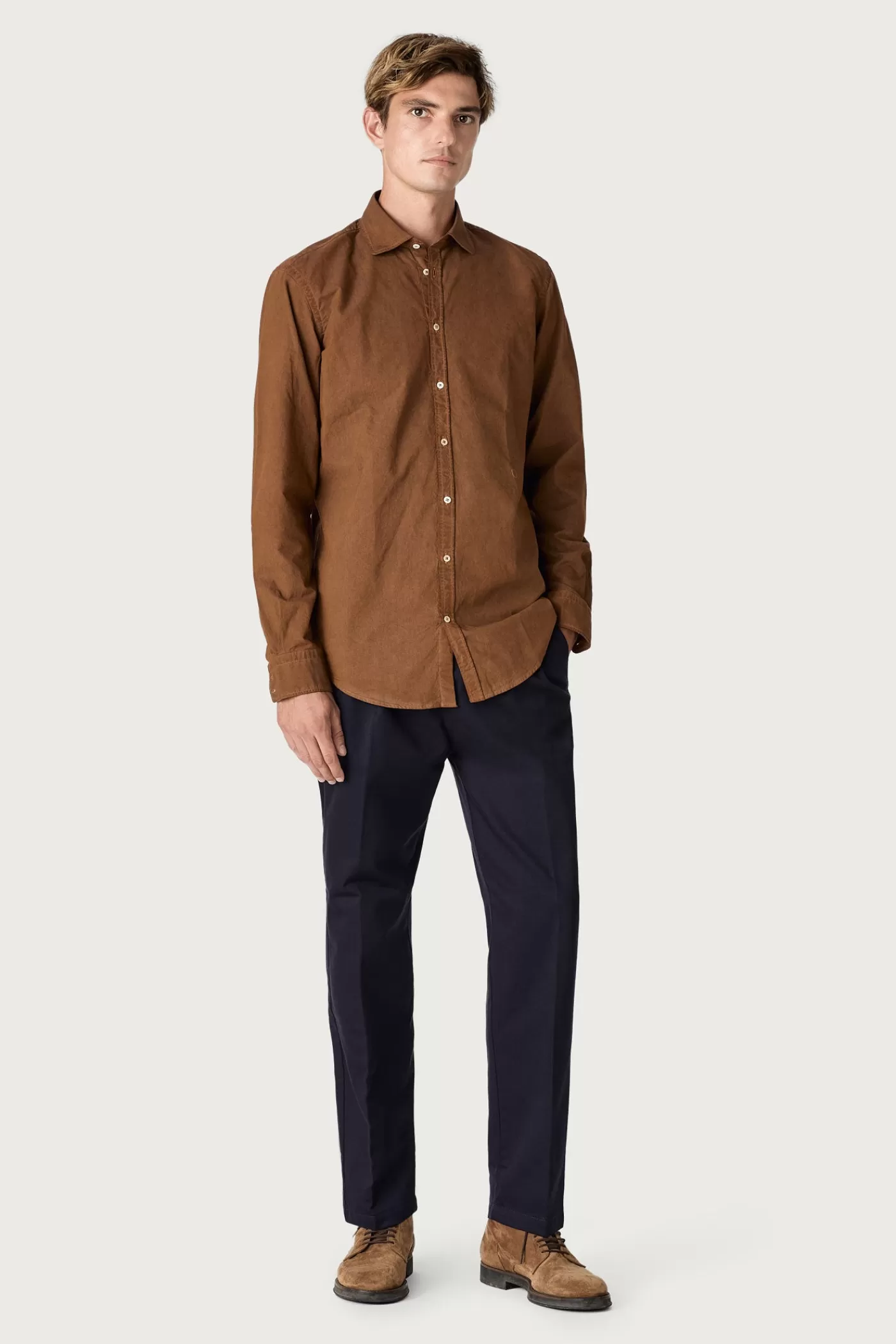 Regular fit shirt with a rounded collar. Classic soft front placket, cotton voile inner bib, badge embroidery for the customers initials, pointed rear yoke. Made from chambray cotton.
