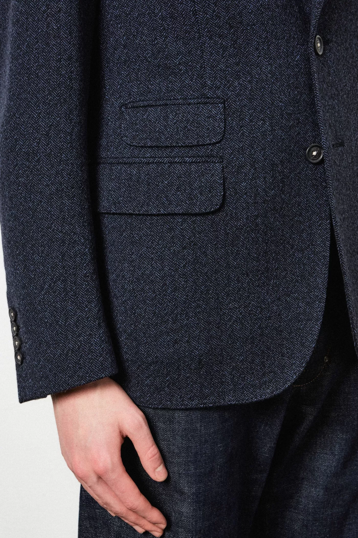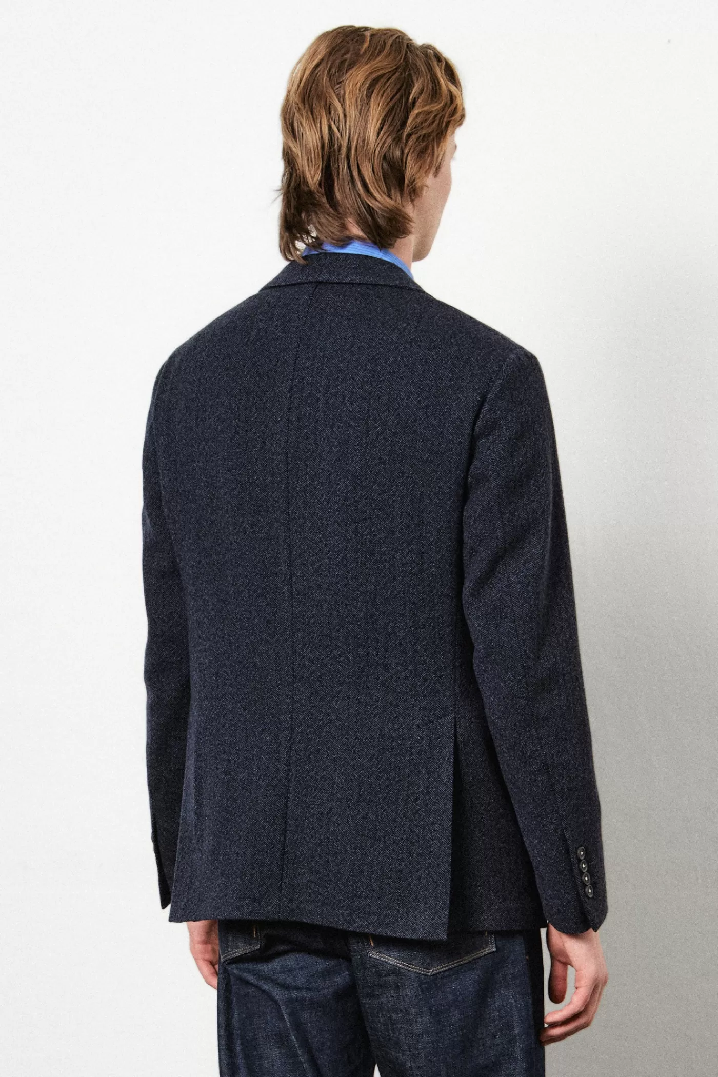 Deconstructed informal jacket with three buttons, classic lapels with stitching, flap pockets, dark horn buttons, internal padding with two pockets, two back vents, made of cashmere spun wool.