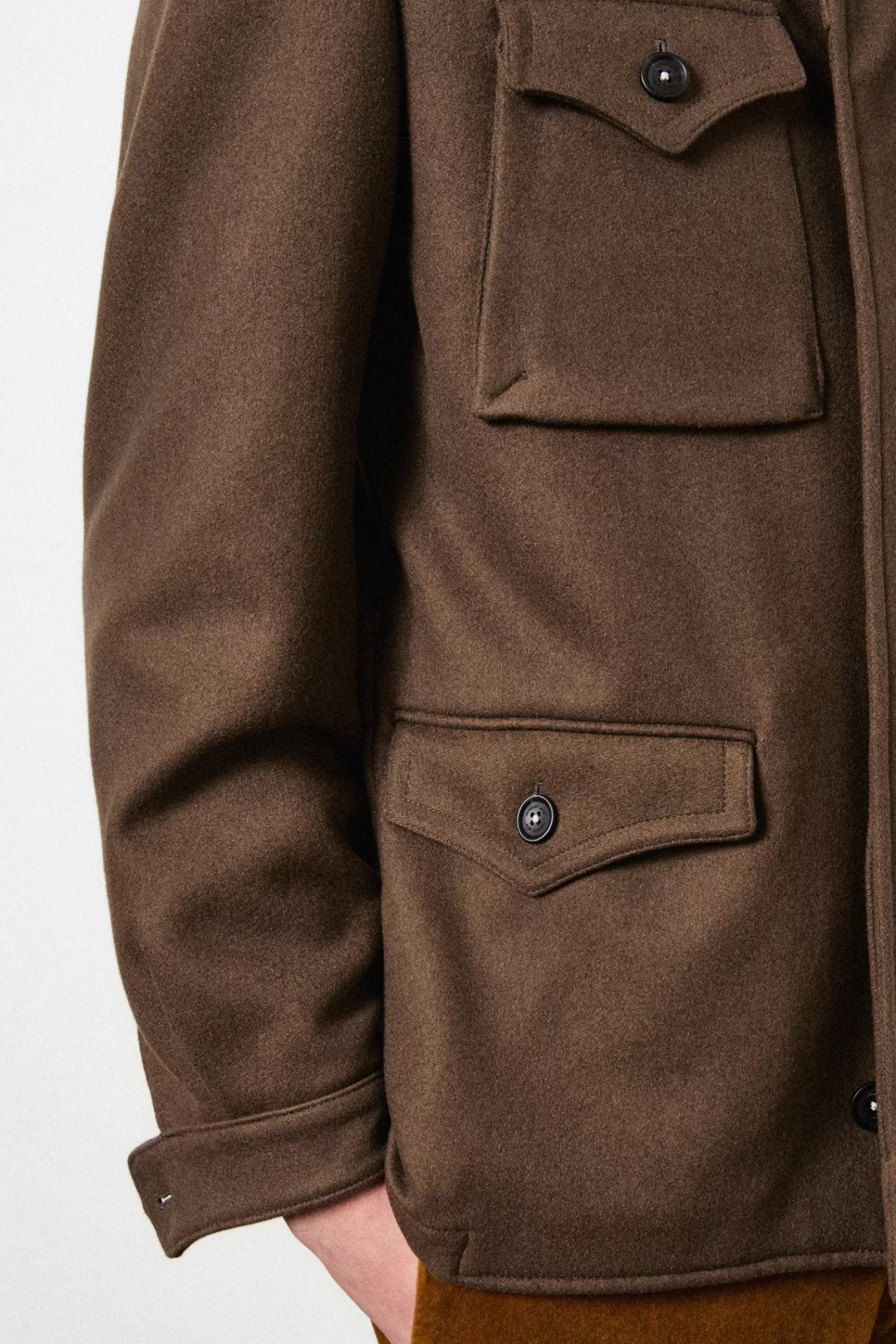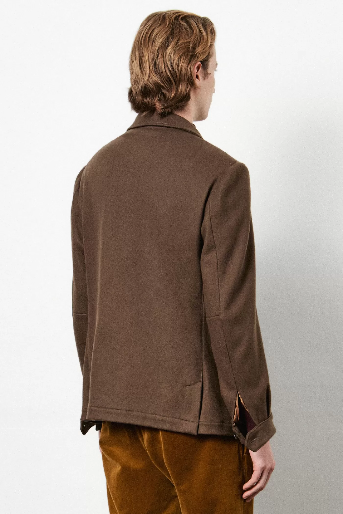 Deconstructed and unlined single-breasted jacket with military-inspired flap pockets, shirt cuffs, dark horn buttons, made of pure cashmere.