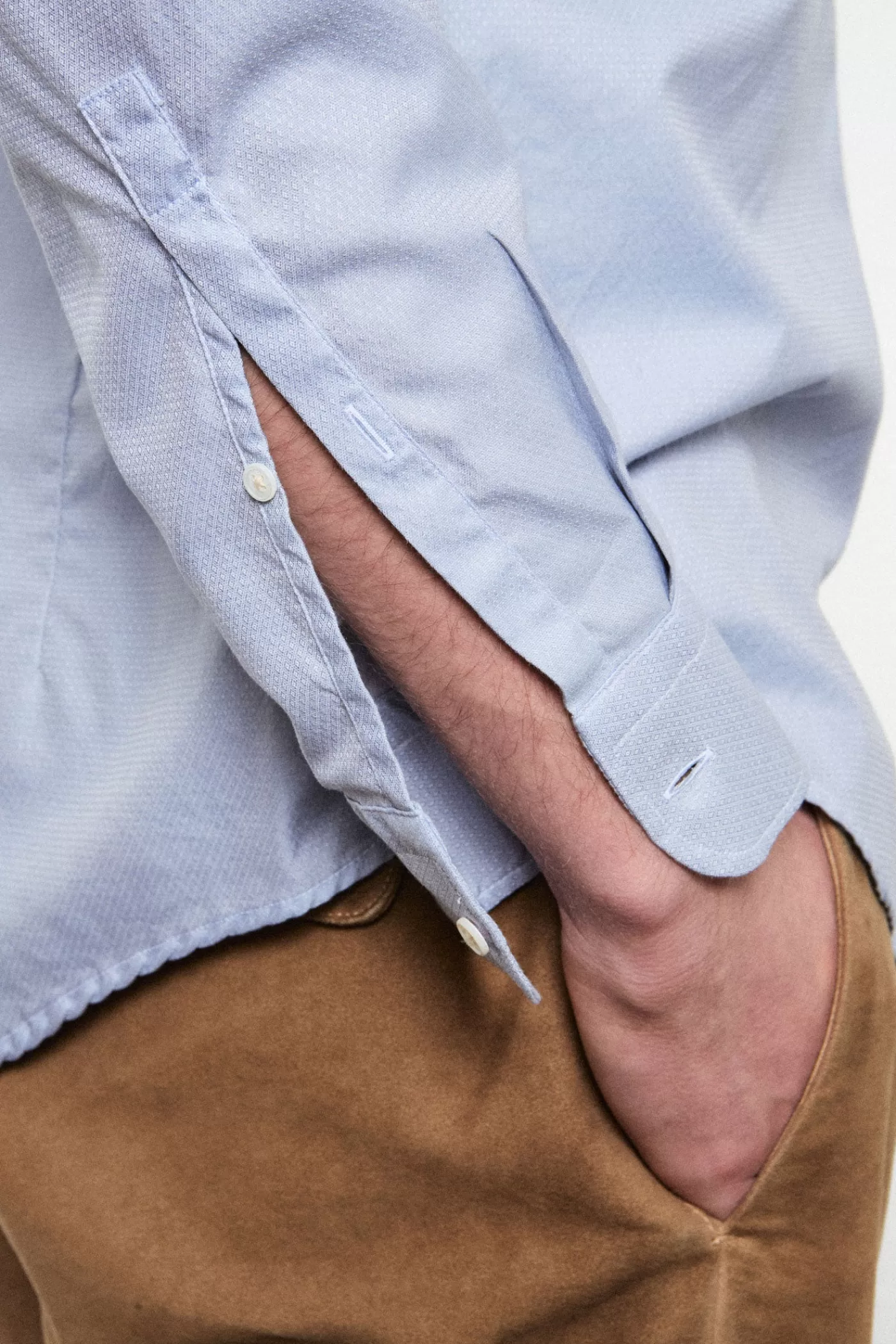 A regular fit shirt with a pointed collar, featuring a classic soft front placket, a cotton voile inner bib, badge embroidery for the customers initials, and a pointed rear yoke.