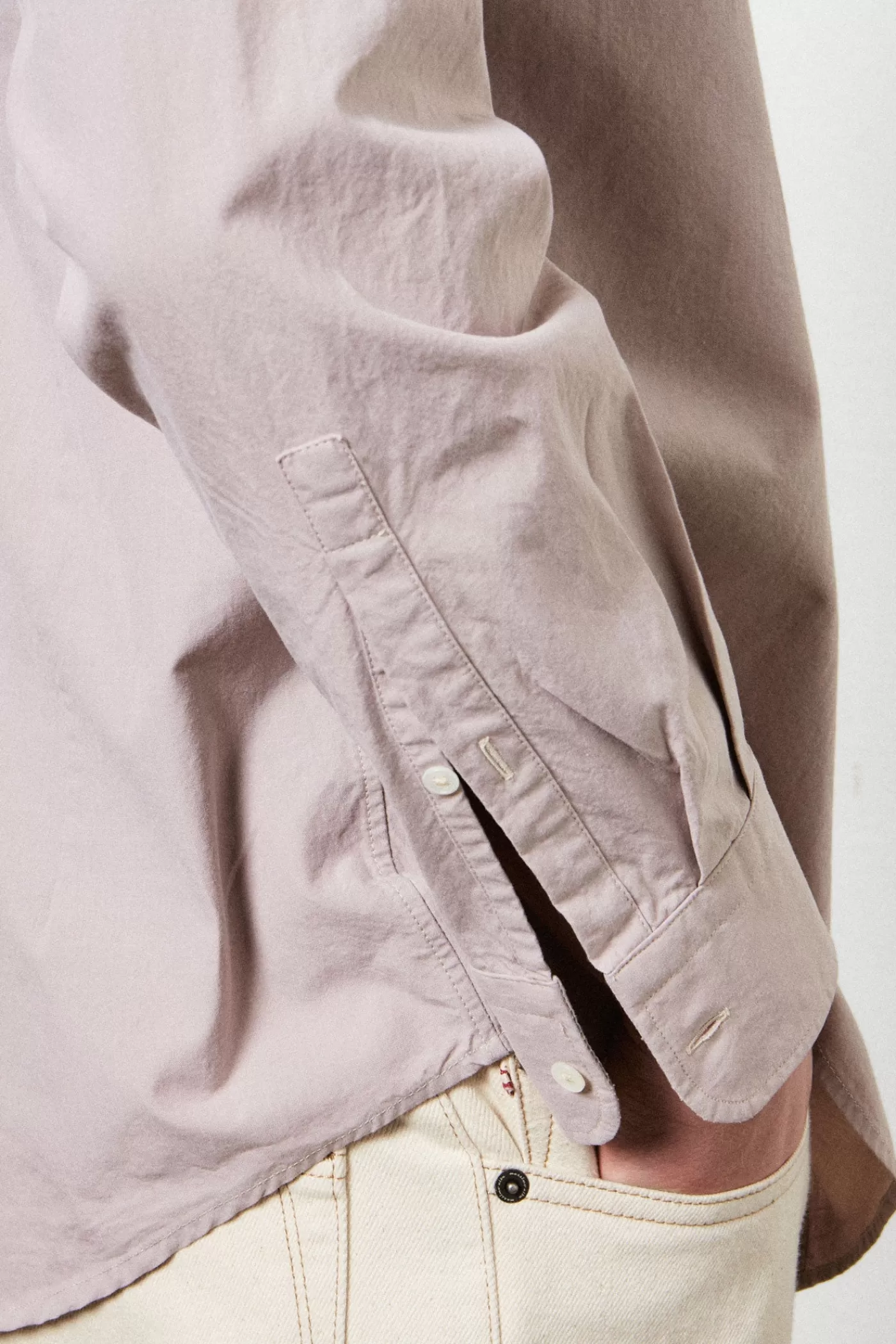 A regular fit shirt with a pointed collar, featuring a classic soft front placket, a cotton voile inner bib, badge embroidery for the customers initials, and a pointed rear yoke.