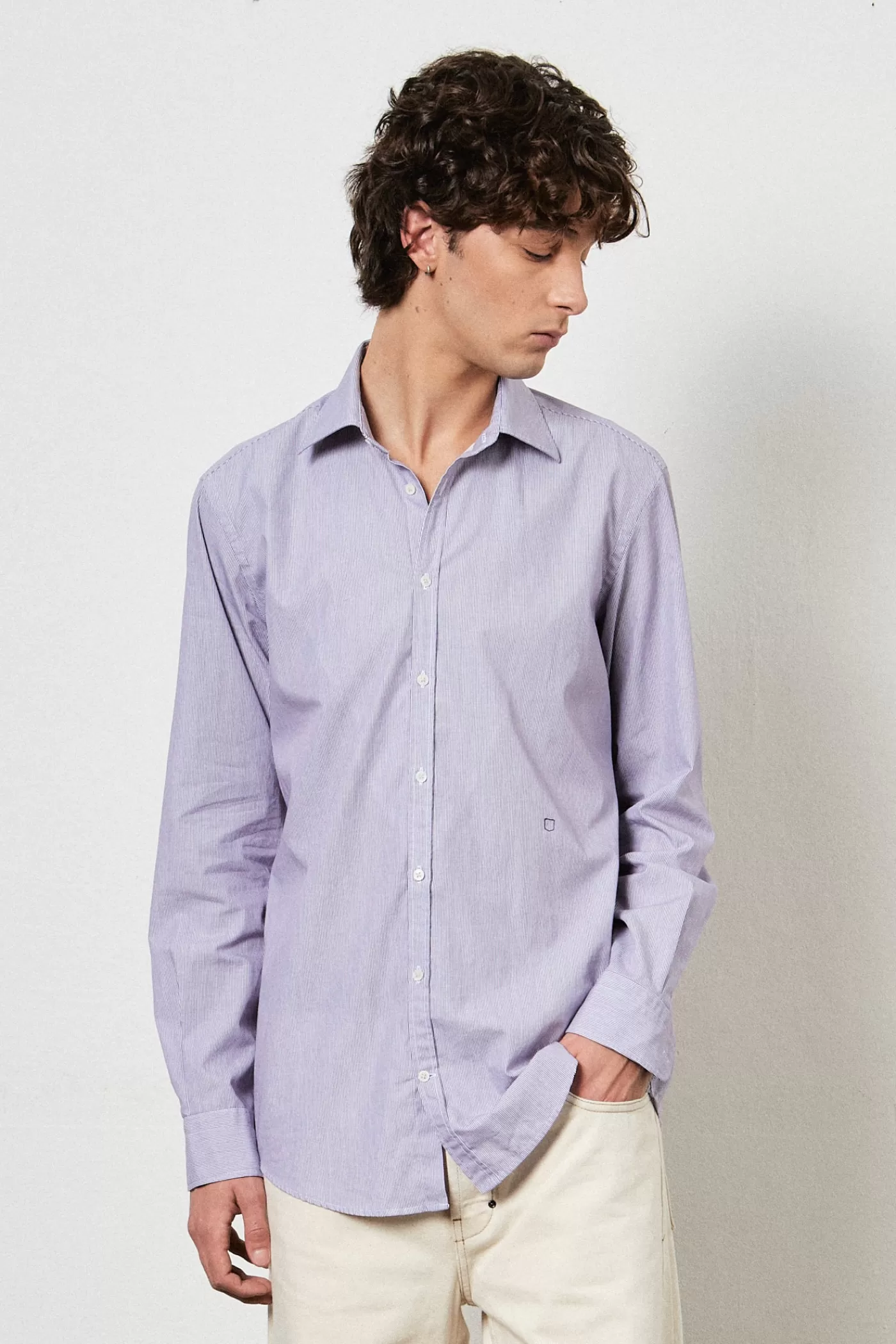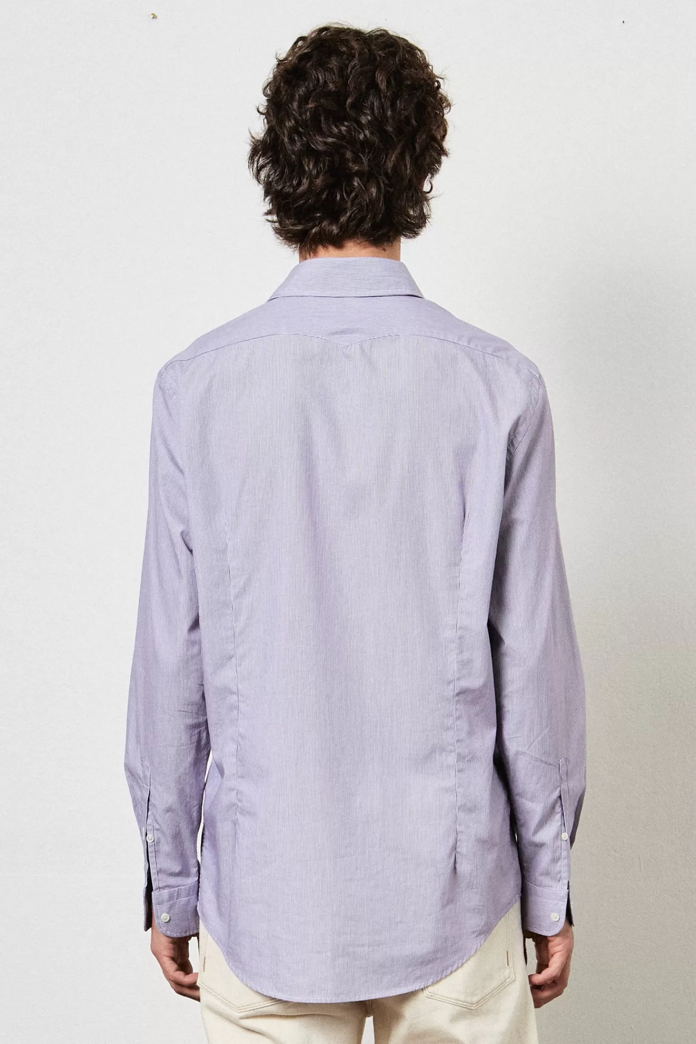 A regular fit shirt with a pointed collar, featuring a classic soft front placket, a cotton voile inner bib, badge embroidery for the customers initials, and a pointed rear yoke.