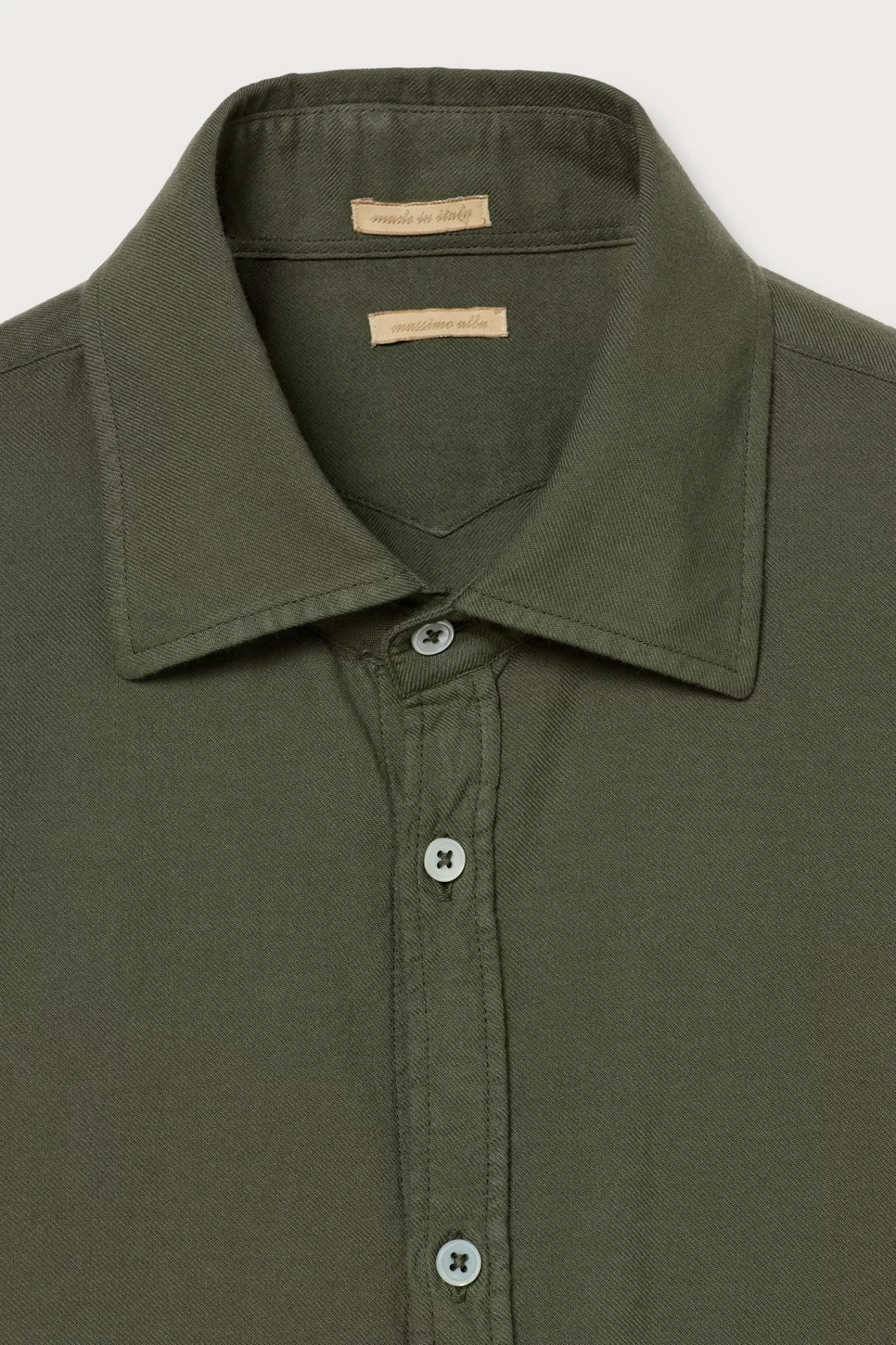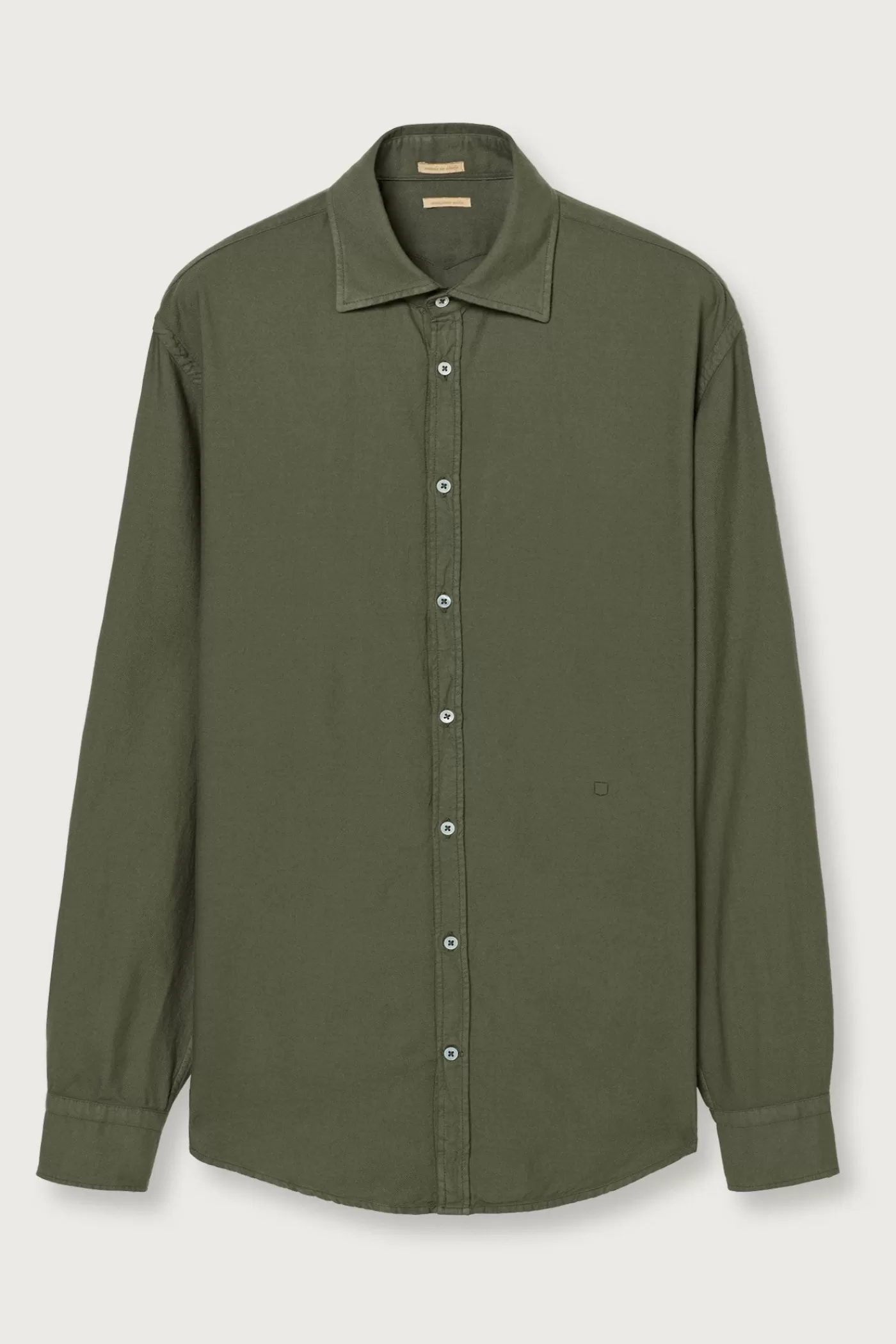Regular fit shirt with a pointed collar. Features a classic soft front placket, cotton voile inner bib, badge embroidery for customer initials, and pointed rear yoke. Crafted from viscose-cotton Vajella.