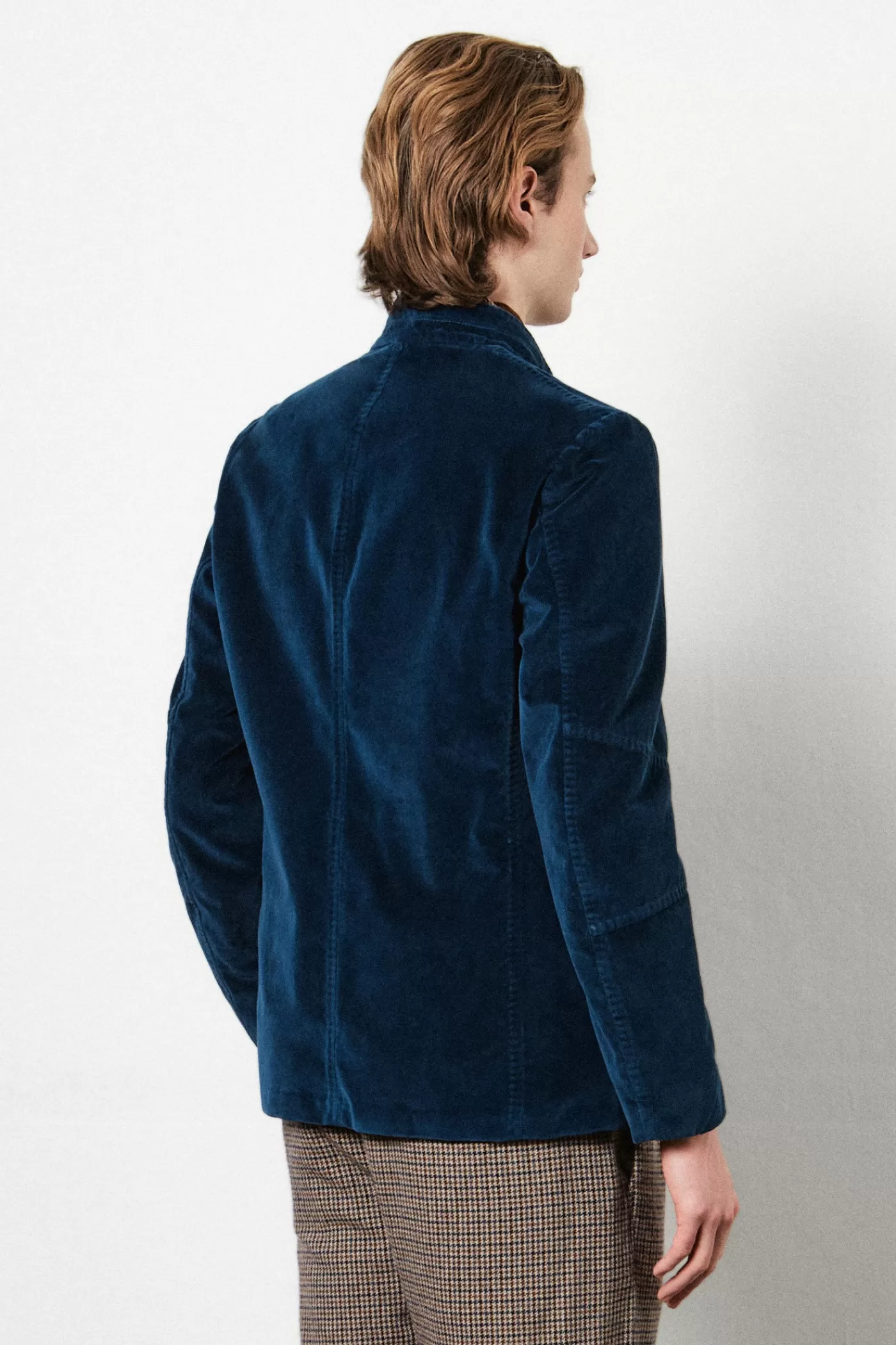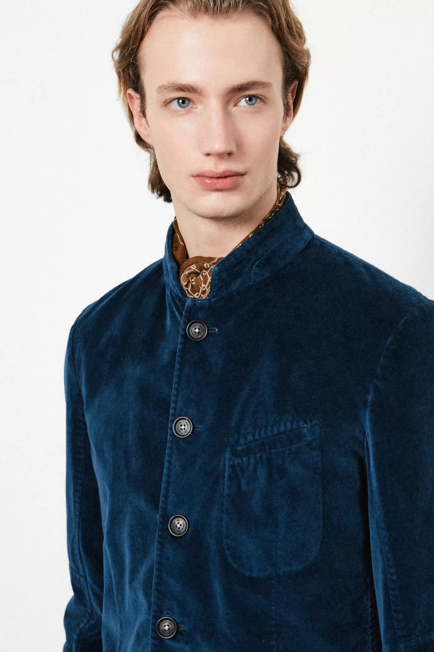 Military-inspired jacket with guru collar, single-breasted, deconstructed and unlined, with patch pockets, dark horn buttons, made of pure cotton velveteen.