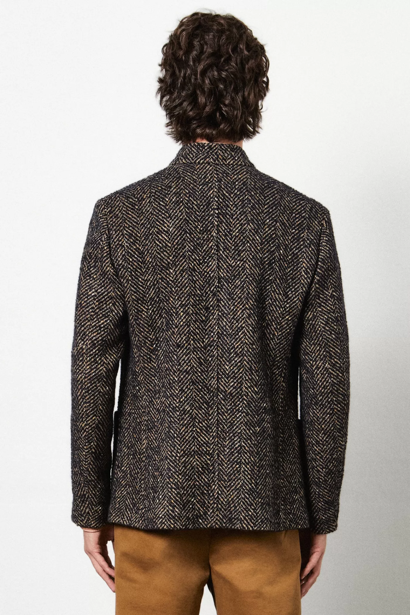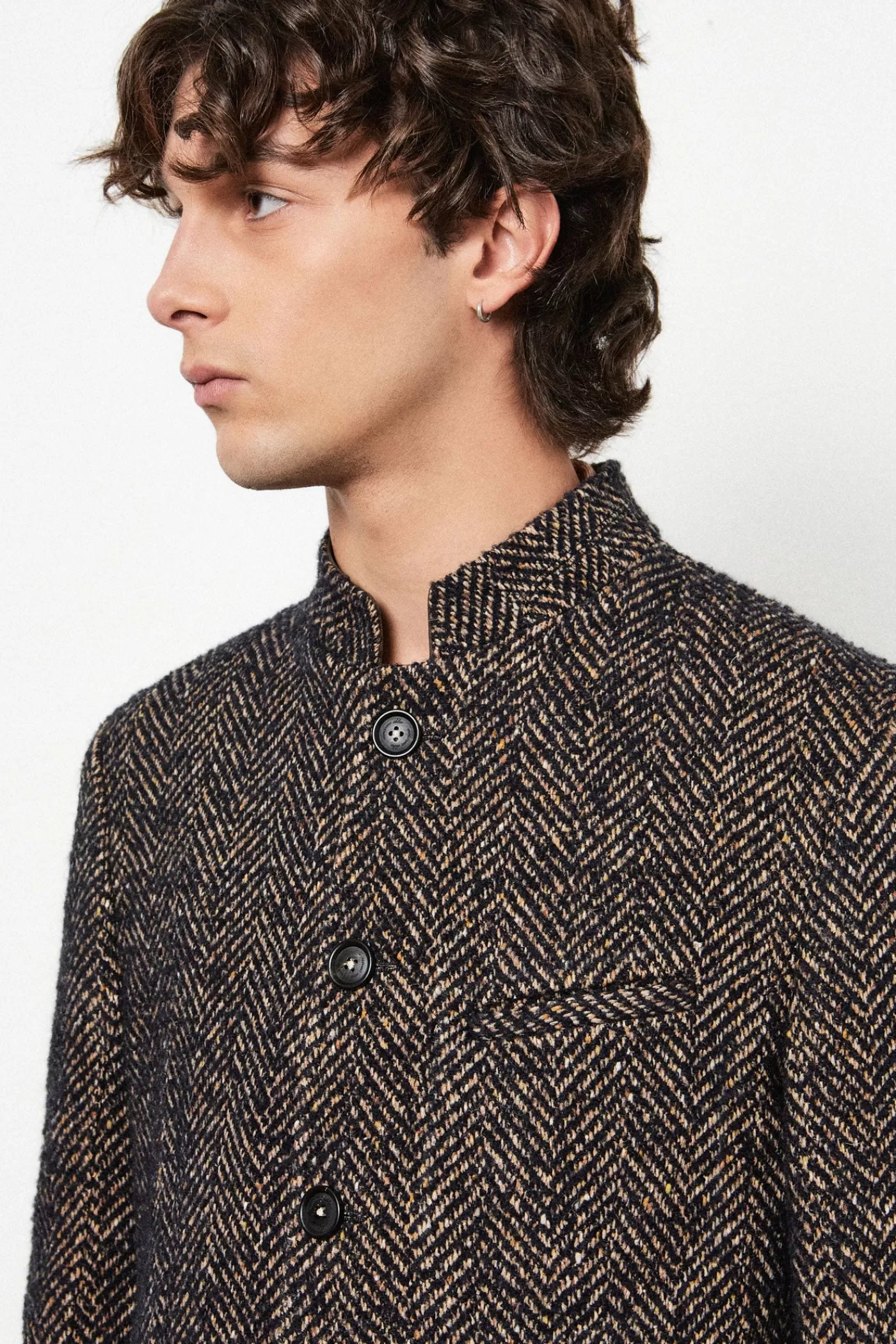A regular fit military-inspired jacket, single-breasted with a stand-up collar and patch pockets. Crafted from a wool silk blend with horn buttons.