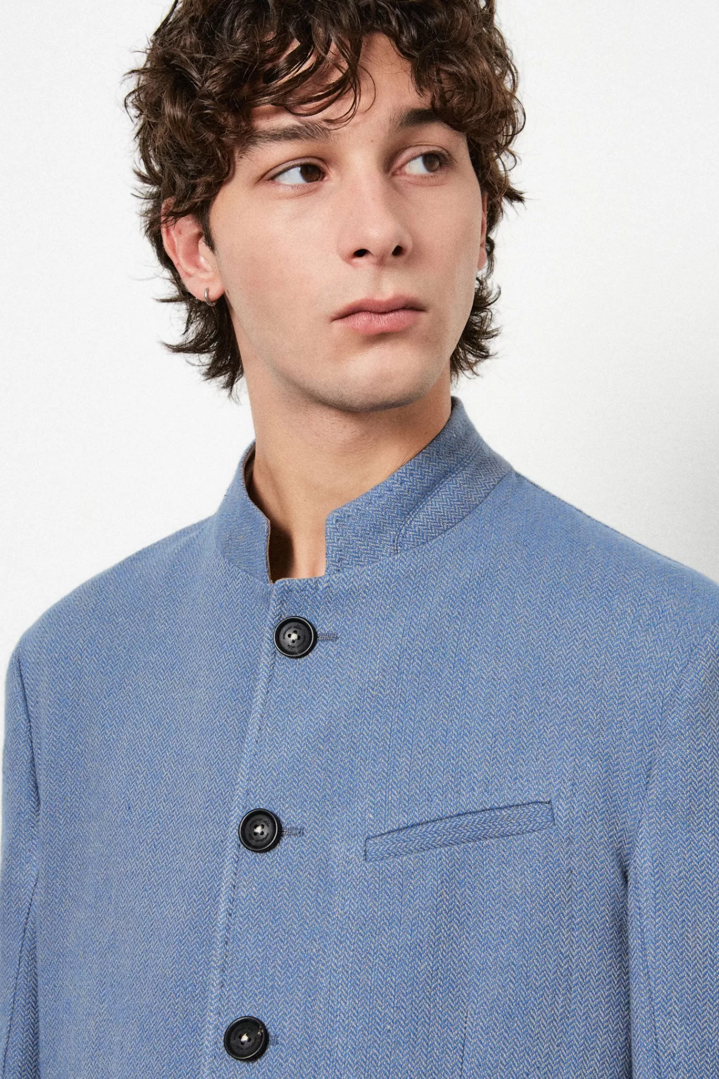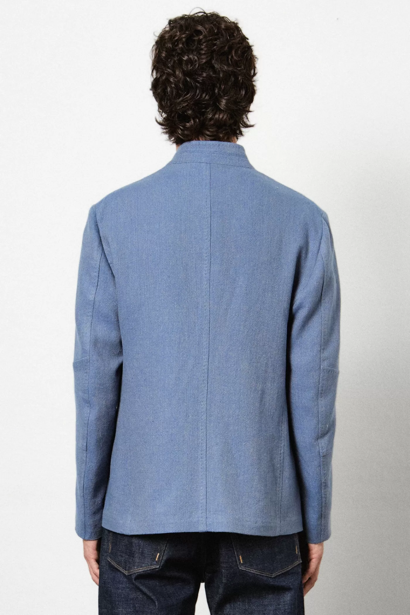 A regular fit military-inspired jacket, single-breasted with a stand-up collar and patch pockets. Crafted from a wool linen blend with horn buttons.