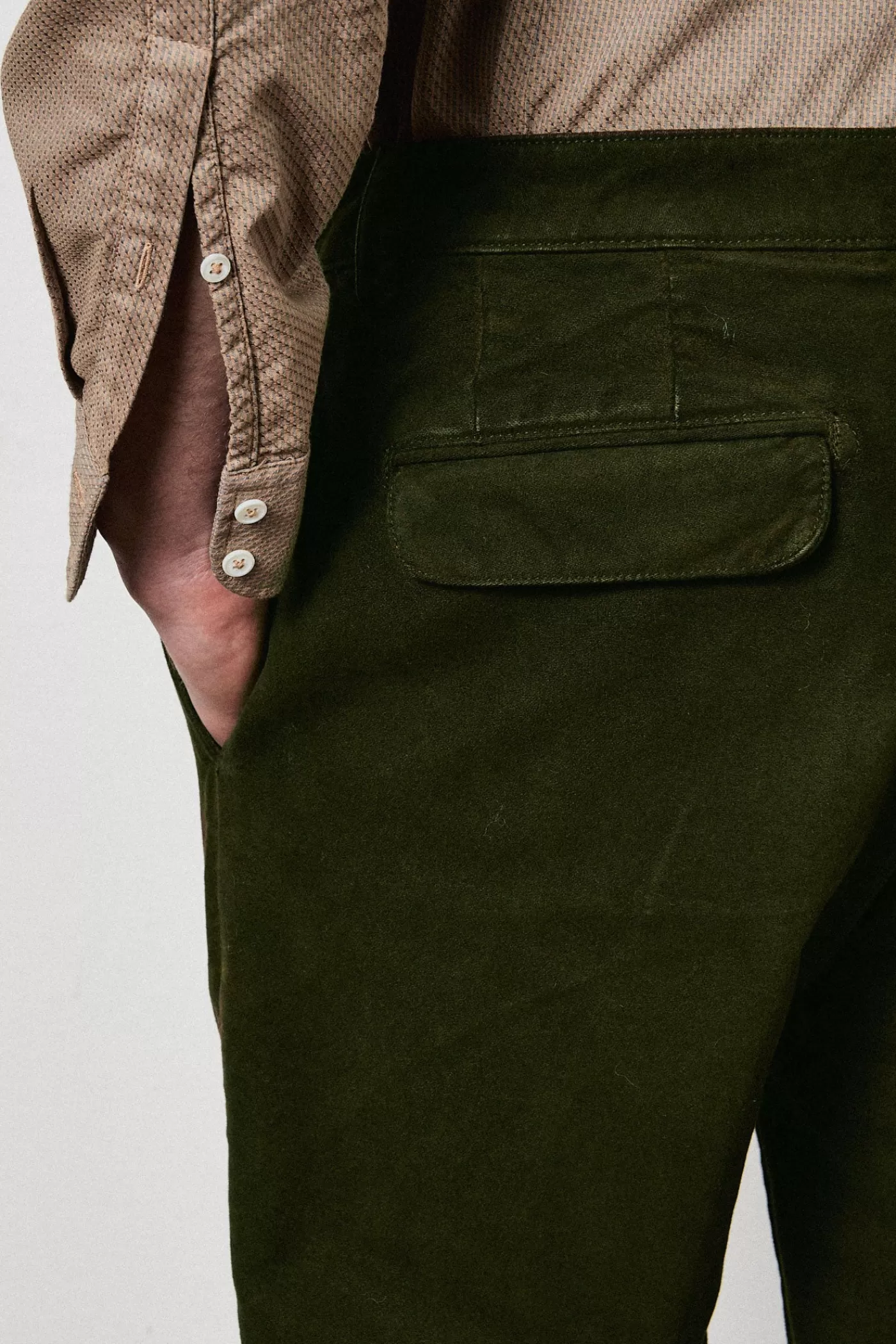 Soft fit pants with stitched pleats, French pockets, front closure with tab, dark horn button, hidden zipper, flap pockets at the back, belt loops, made of cotton corduroy.