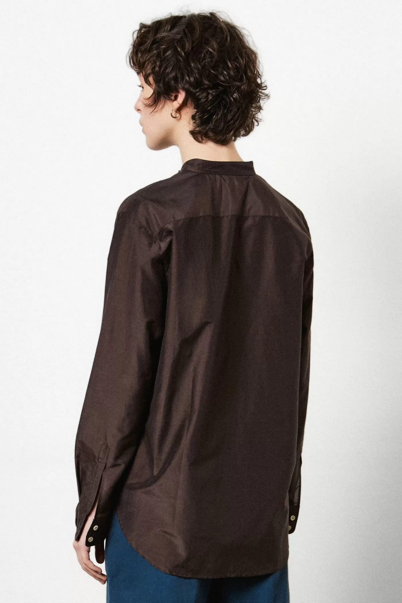 Shirt with korean collar, pointed yoke, front plastron, made of cotton silk.