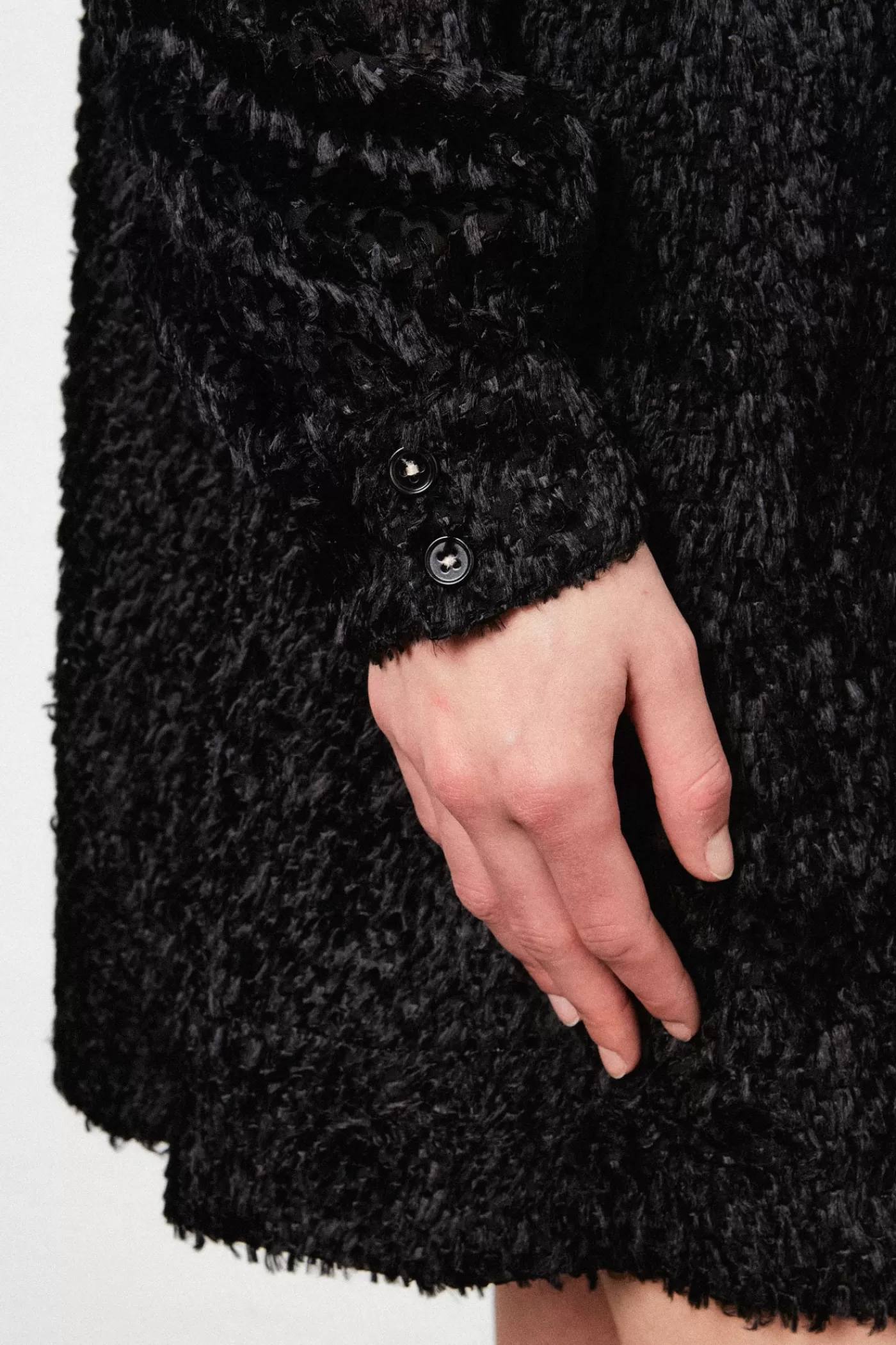 Short dress with high collar and back closure, high cuffs, made of viscose silk.