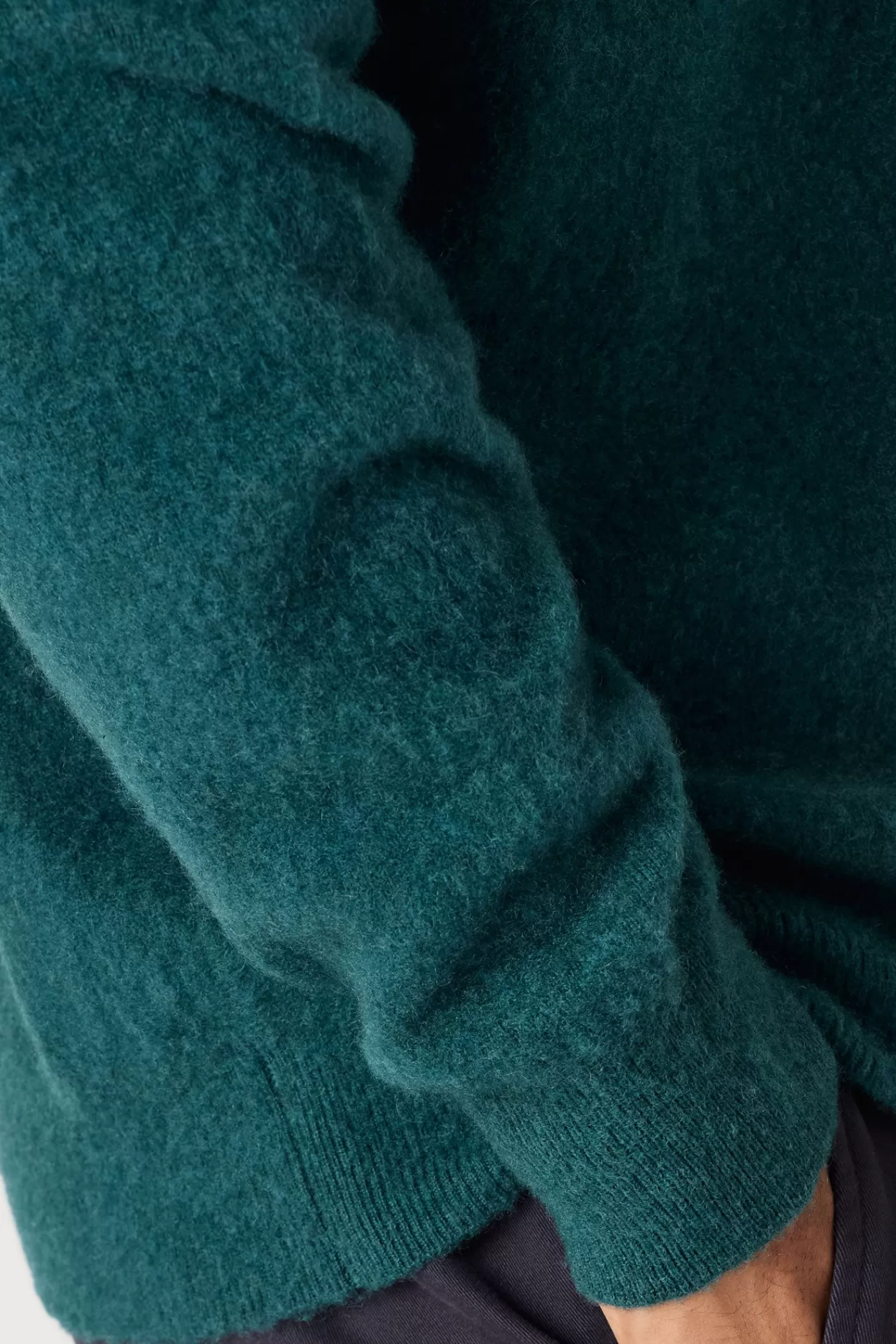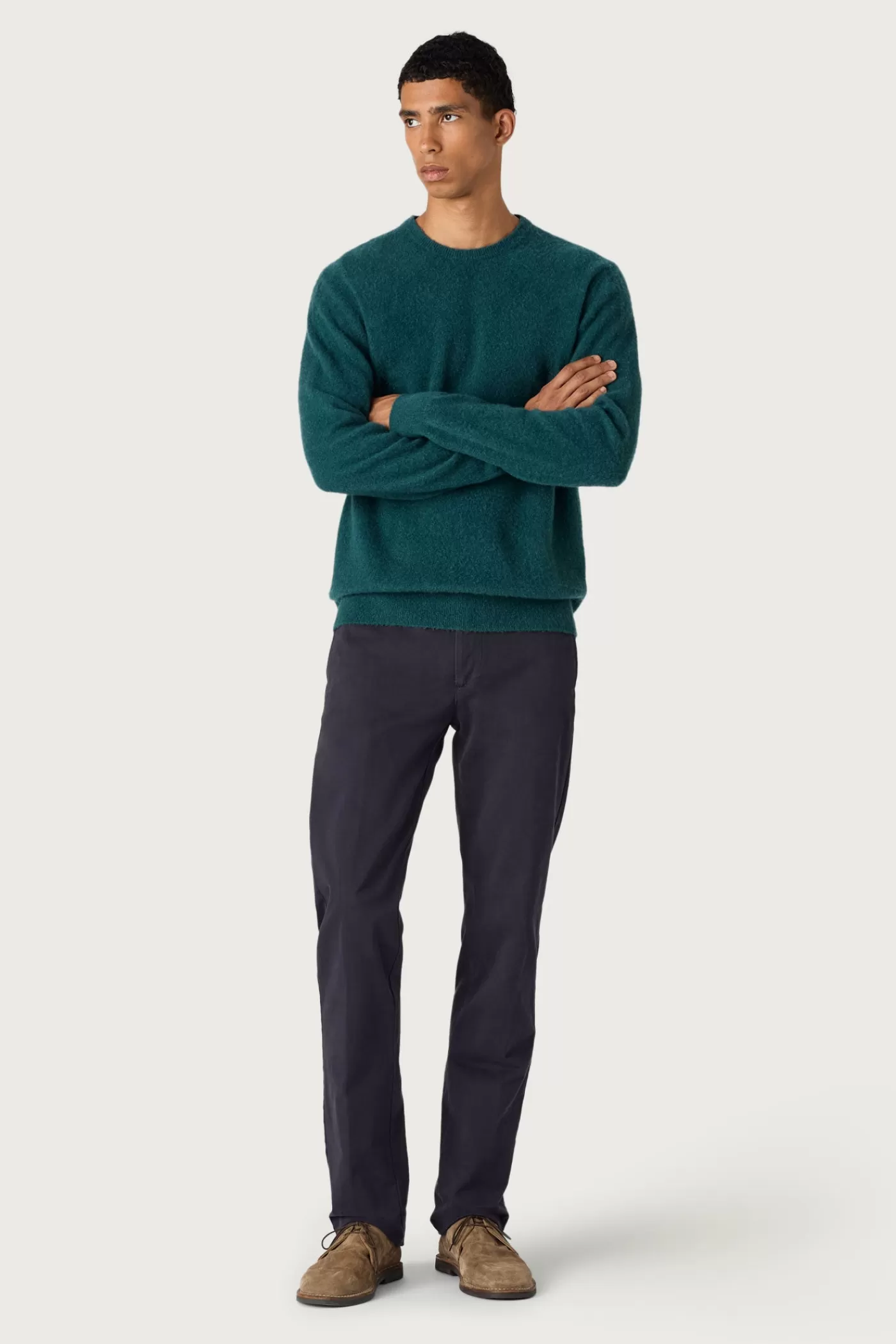 Ribbed knit crew neck with ribbed borders, classic fit, made of dyed pure cashmere with hand-brushed natural carded yarn.