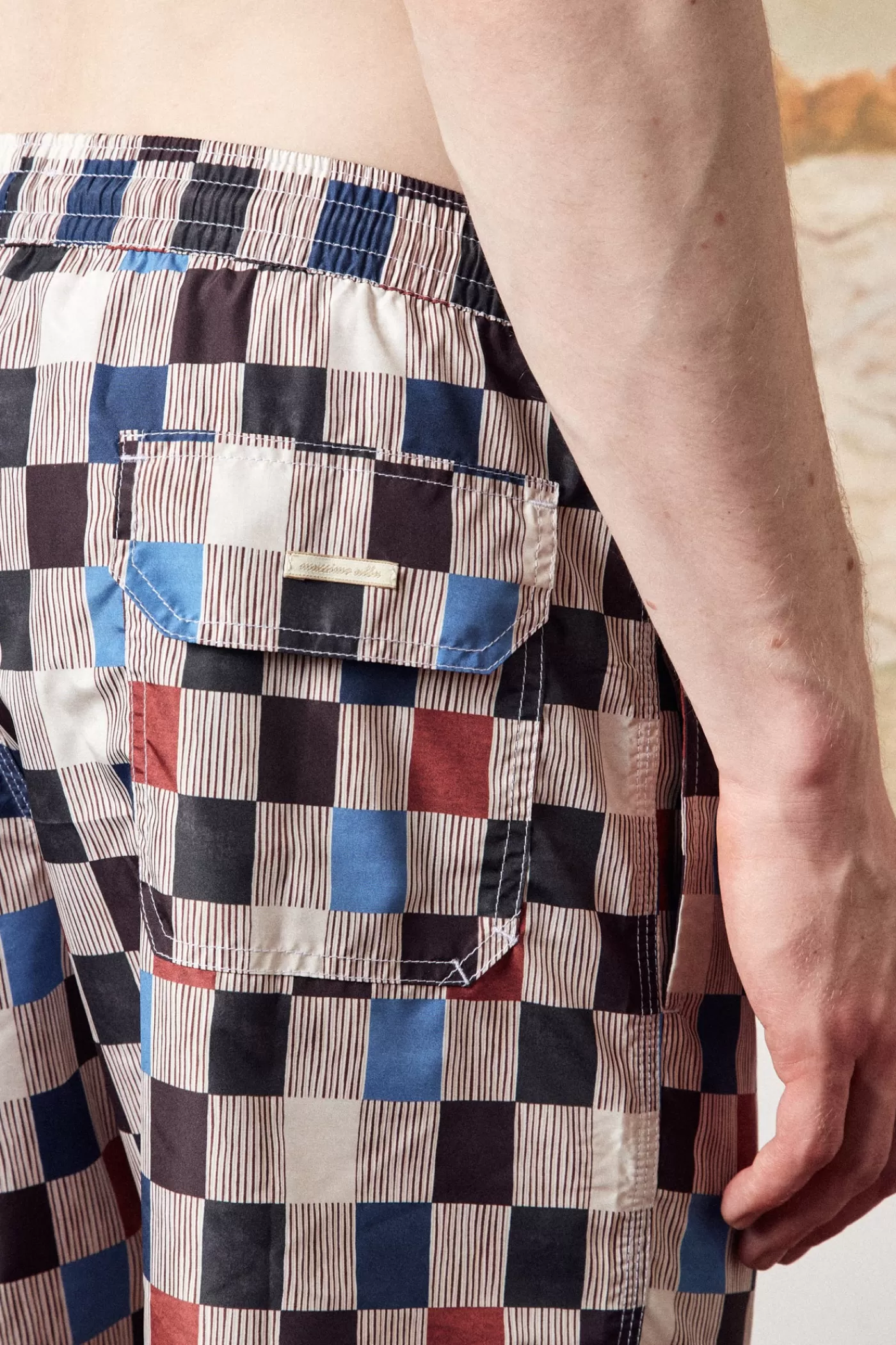 Classic fit swim shorts with drawstrings waistband, pockets and mesh slip lining.Made in an exclusive geometric print.