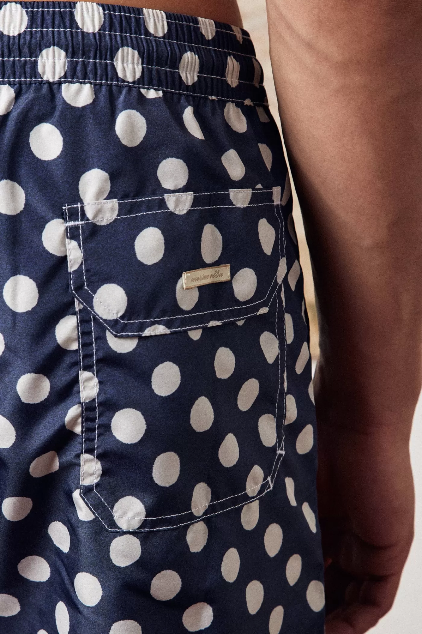 Classic fit swim shorts with drawstrings waistband, pockets and mesh slip lining. Made in an exclusive pois print.