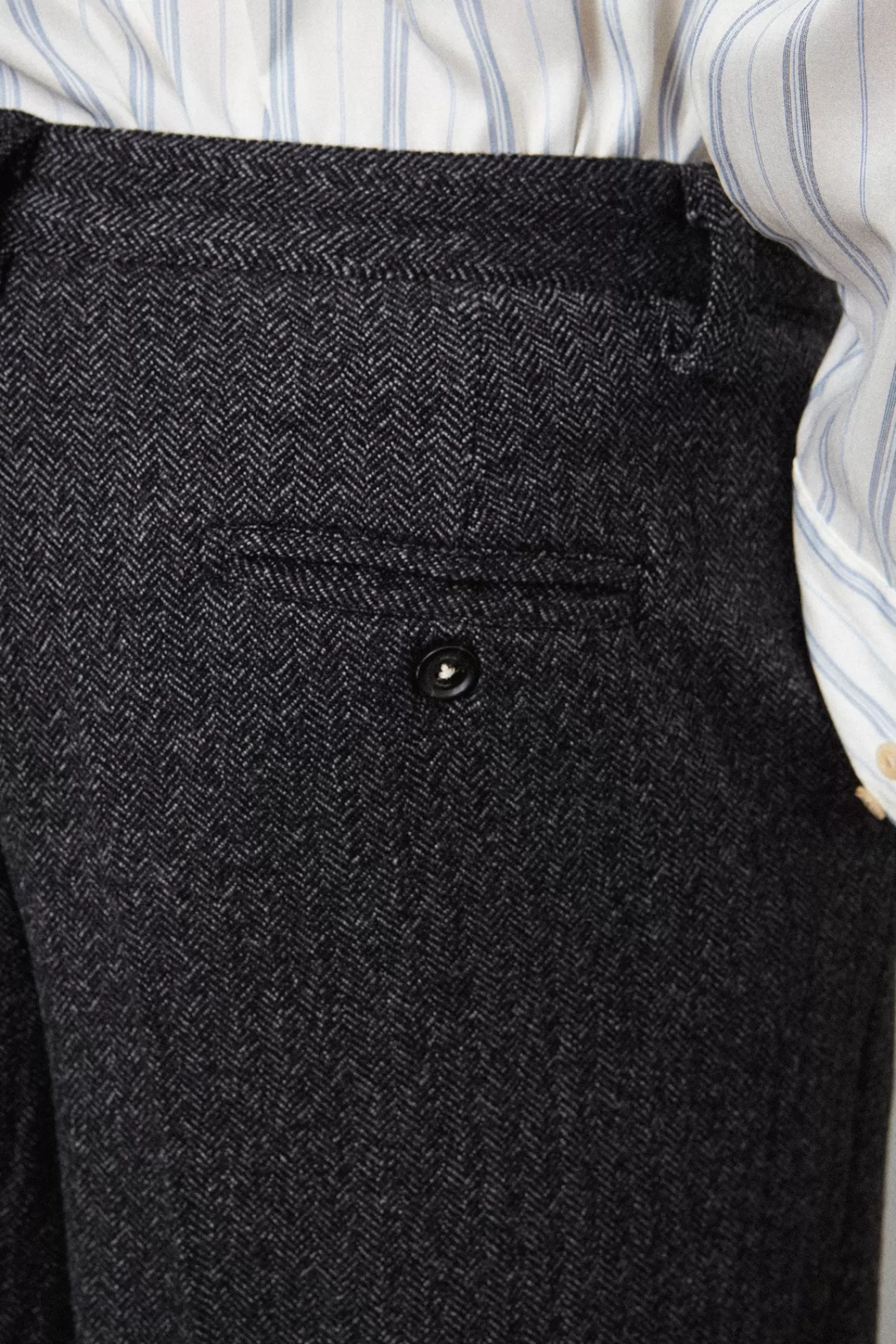 Boy pants with welt pockets, zip closure and side buckle, made of cashmere wool.