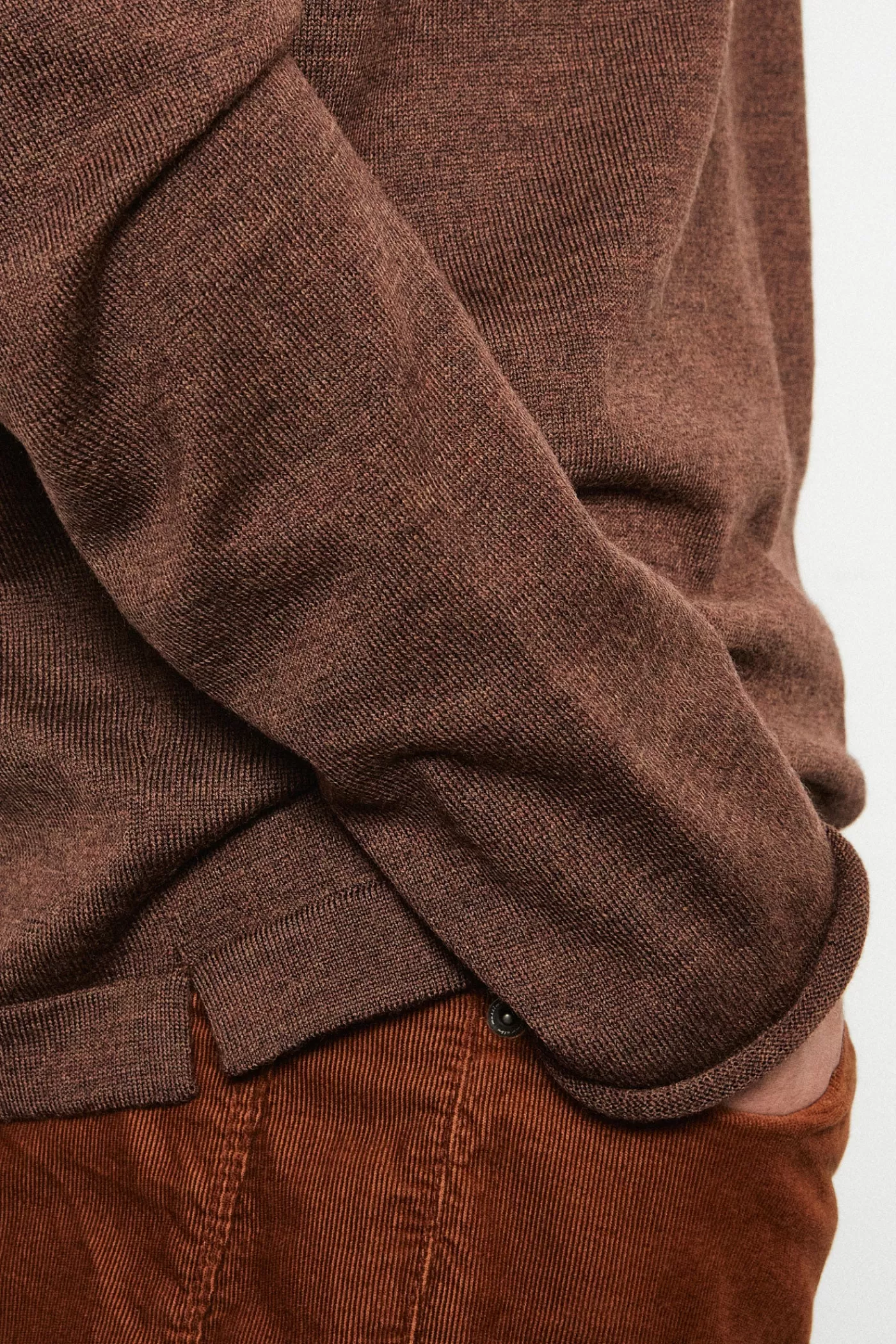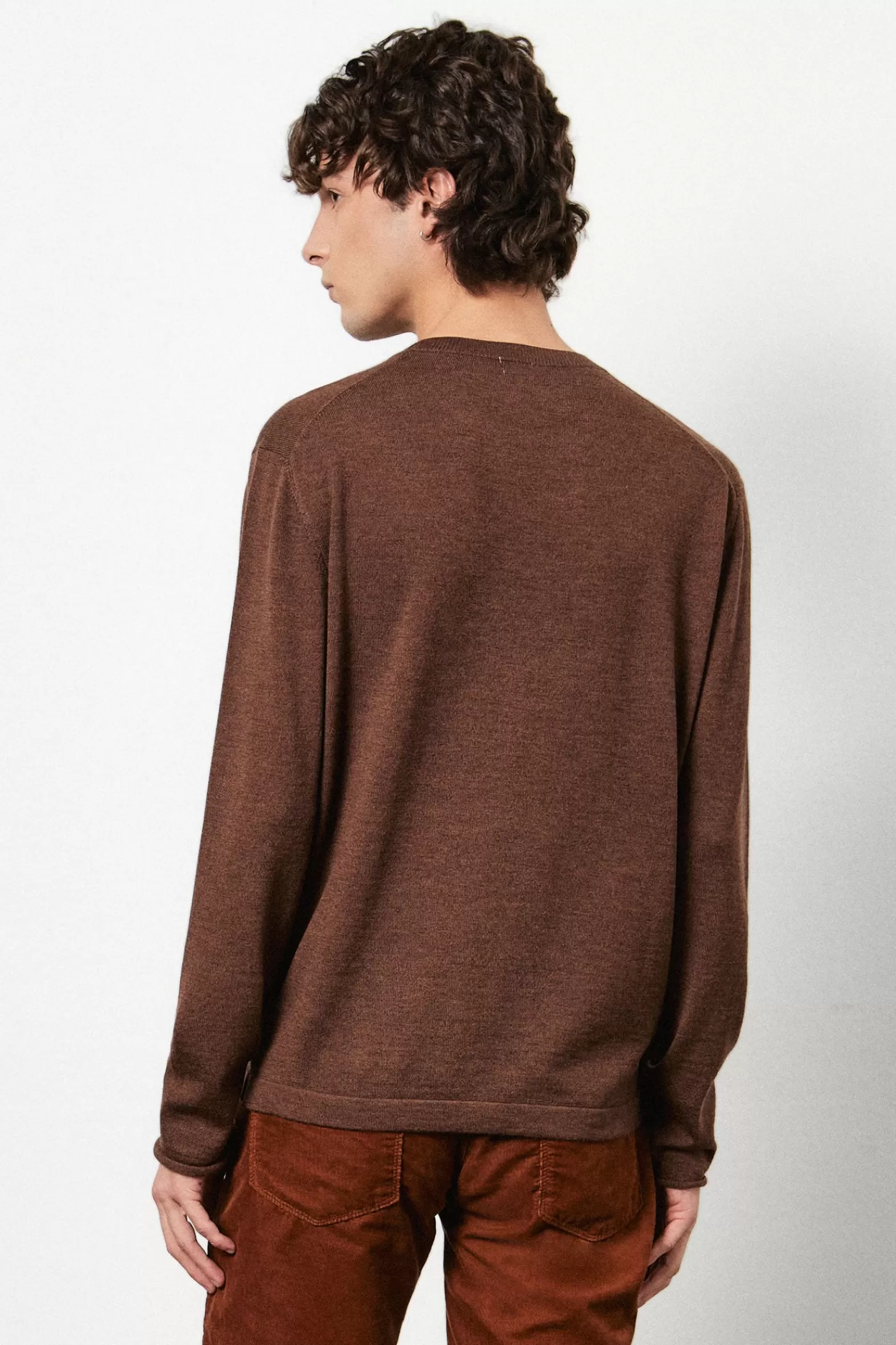 A regular fit crewneck sweater in worsted pure extra fine merino wool. It features a dropped shoulder and unfinished cuffs, knitted in G15 stocking stitch.