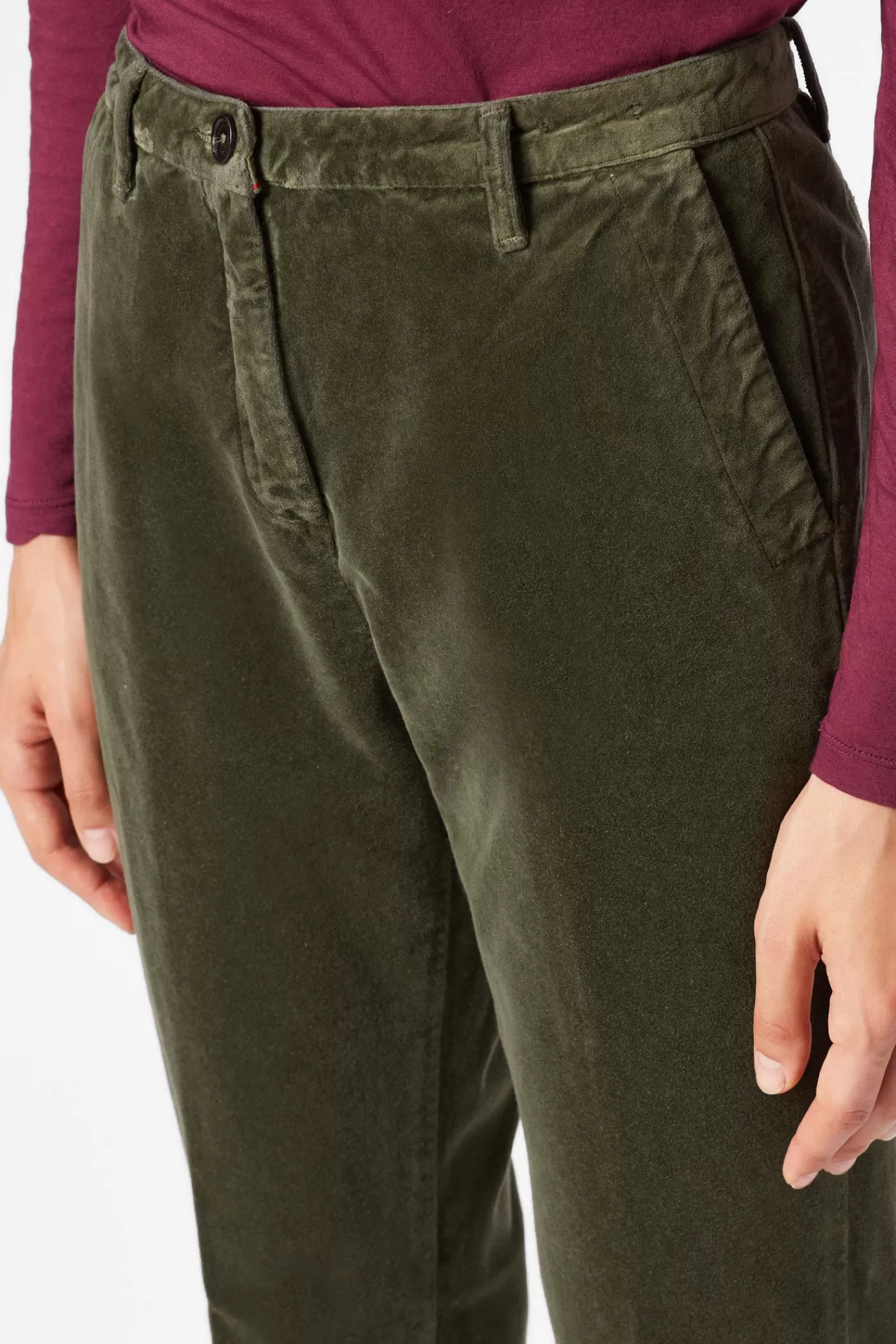 Medium rise pants, classic fit, flat front, slim leg that slightly flares at the bottom, slanted pockets, zip and button closure, made of pure cotton velveteen.
