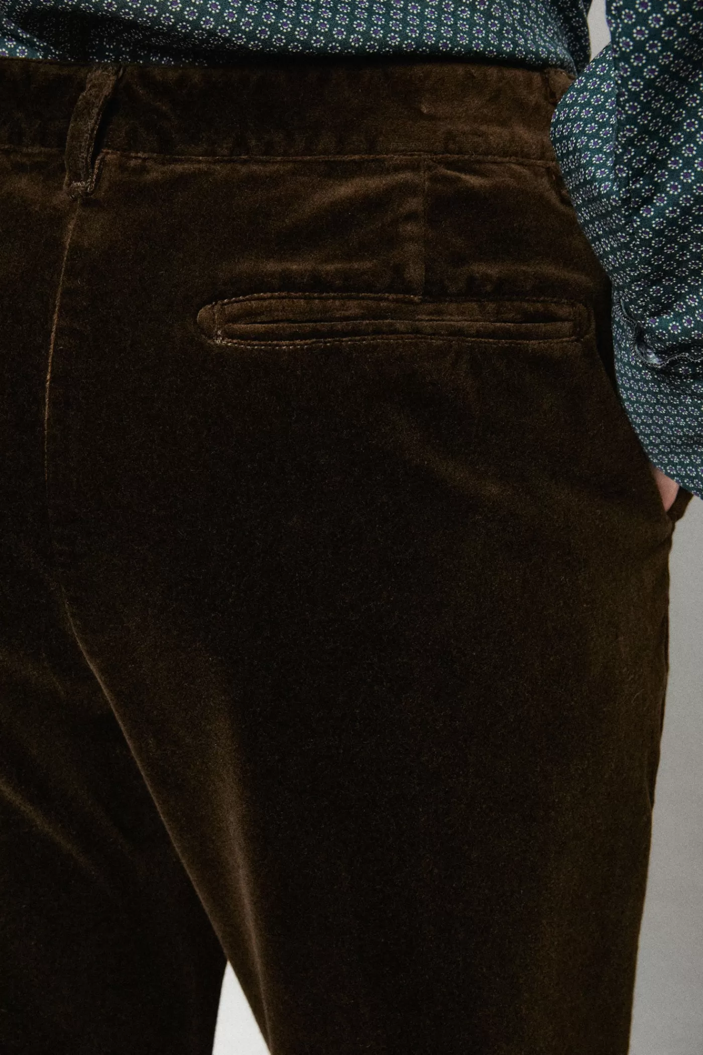 Medium rise pants, classic fit, flat front, slim leg that slightly flares at the bottom, slanted pockets, zip and button closure, made of pure cotton velveteen.