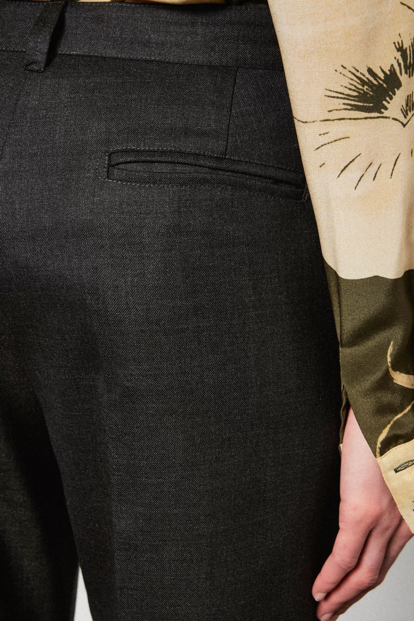 Medium rise pants, classic fit, flat front, slim leg that slightly flares at the bottom, slanted pockets, zip and button closure, made of comfort wool twill.