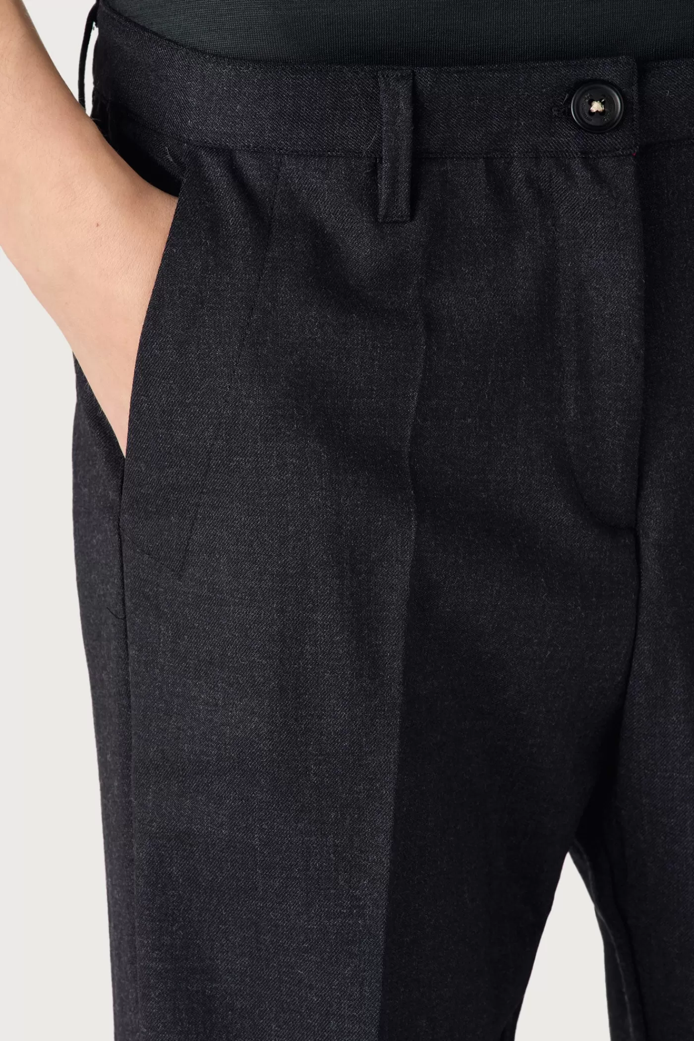Medium rise pants, classic fit, flat front, slim leg that slightly flares at the bottom, slanted pockets, zip and button closure, made of comfort wool twill.