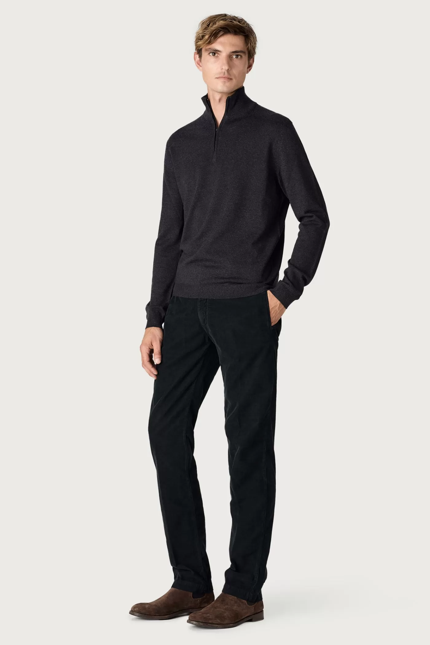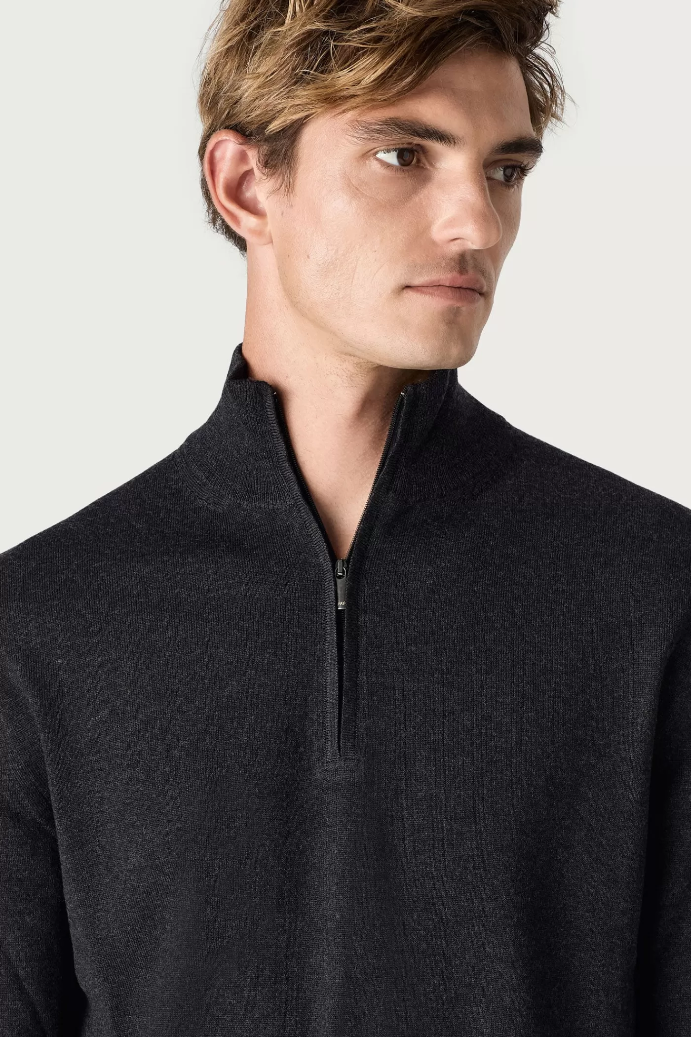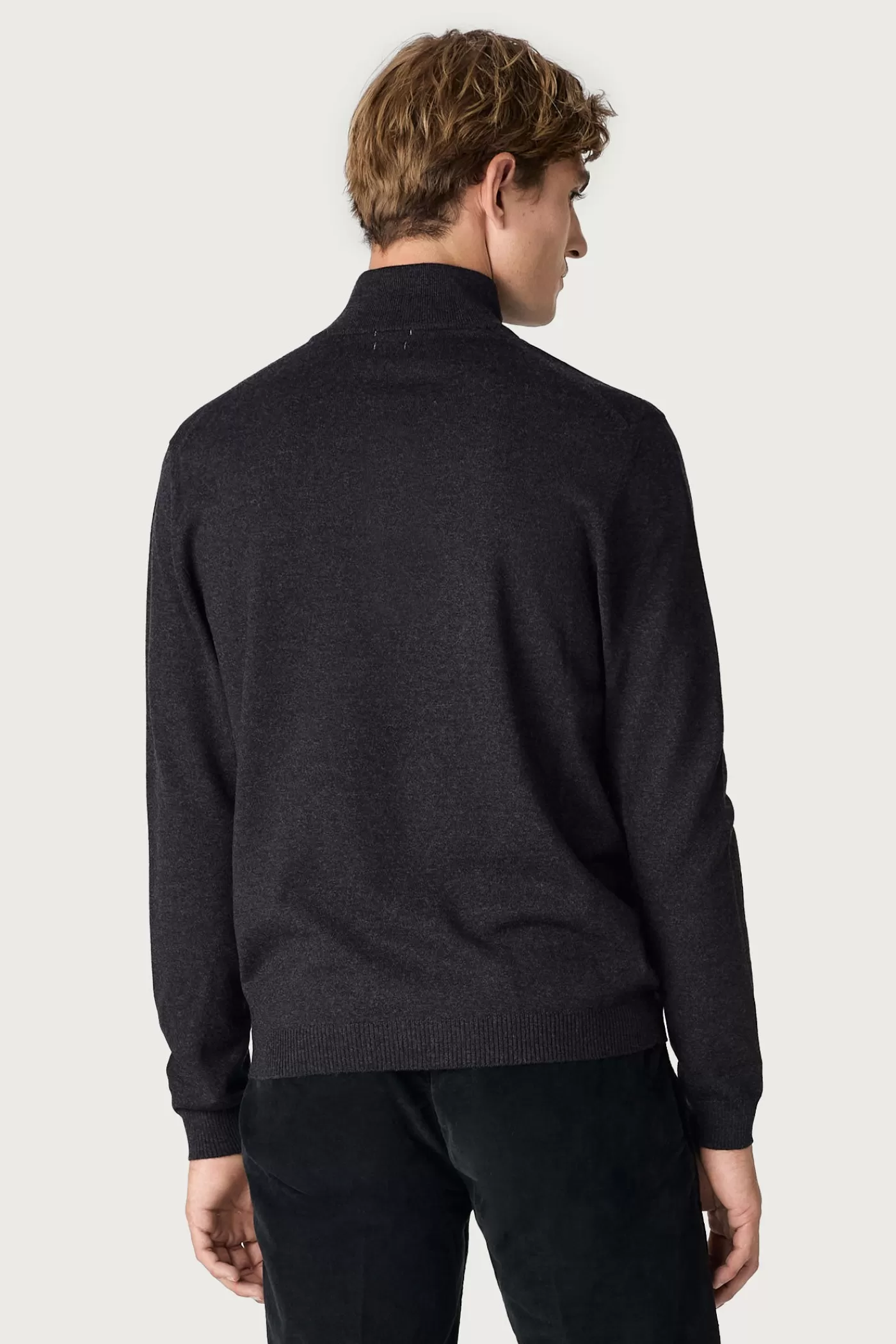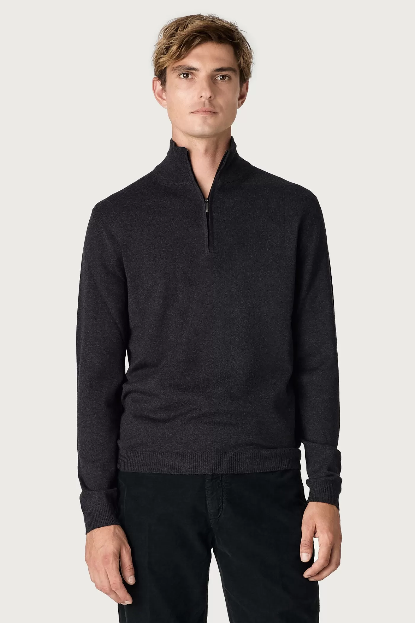 A regular fit high-neck half-zip sweater in pure cashmere, hand-brushed with natural thistles. Knitted in G12 stocking stitch.