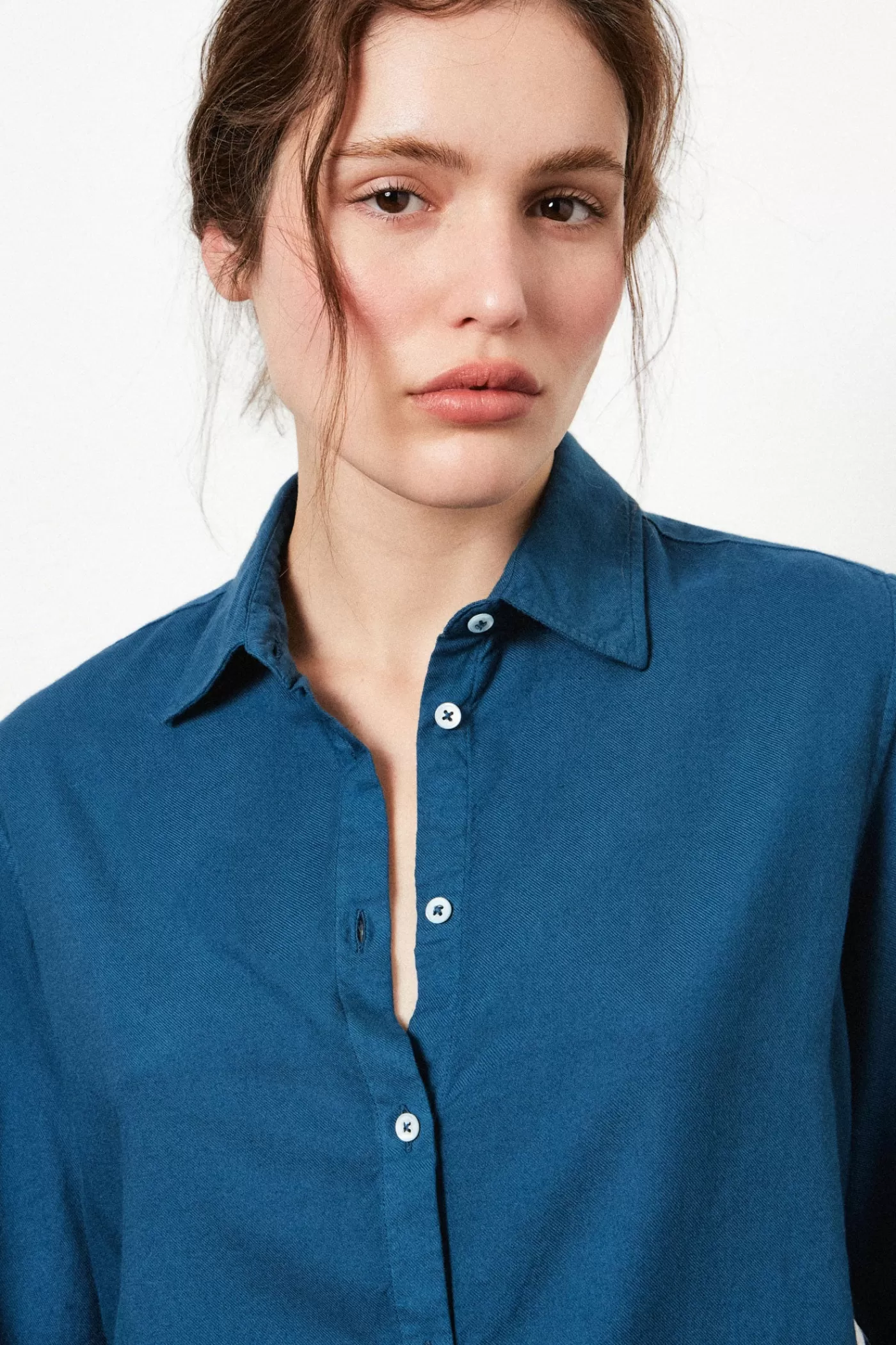 Slim-fit shirt with classic collar, pointed yoke, front placket with mother-of-pearl buttons, made of soft cotton voile.