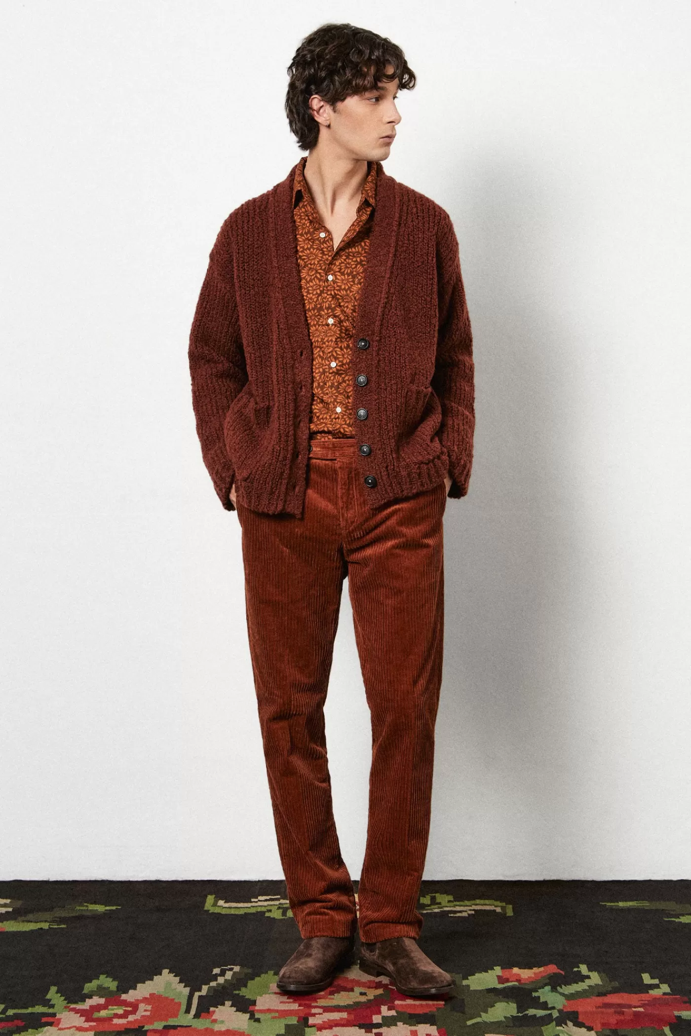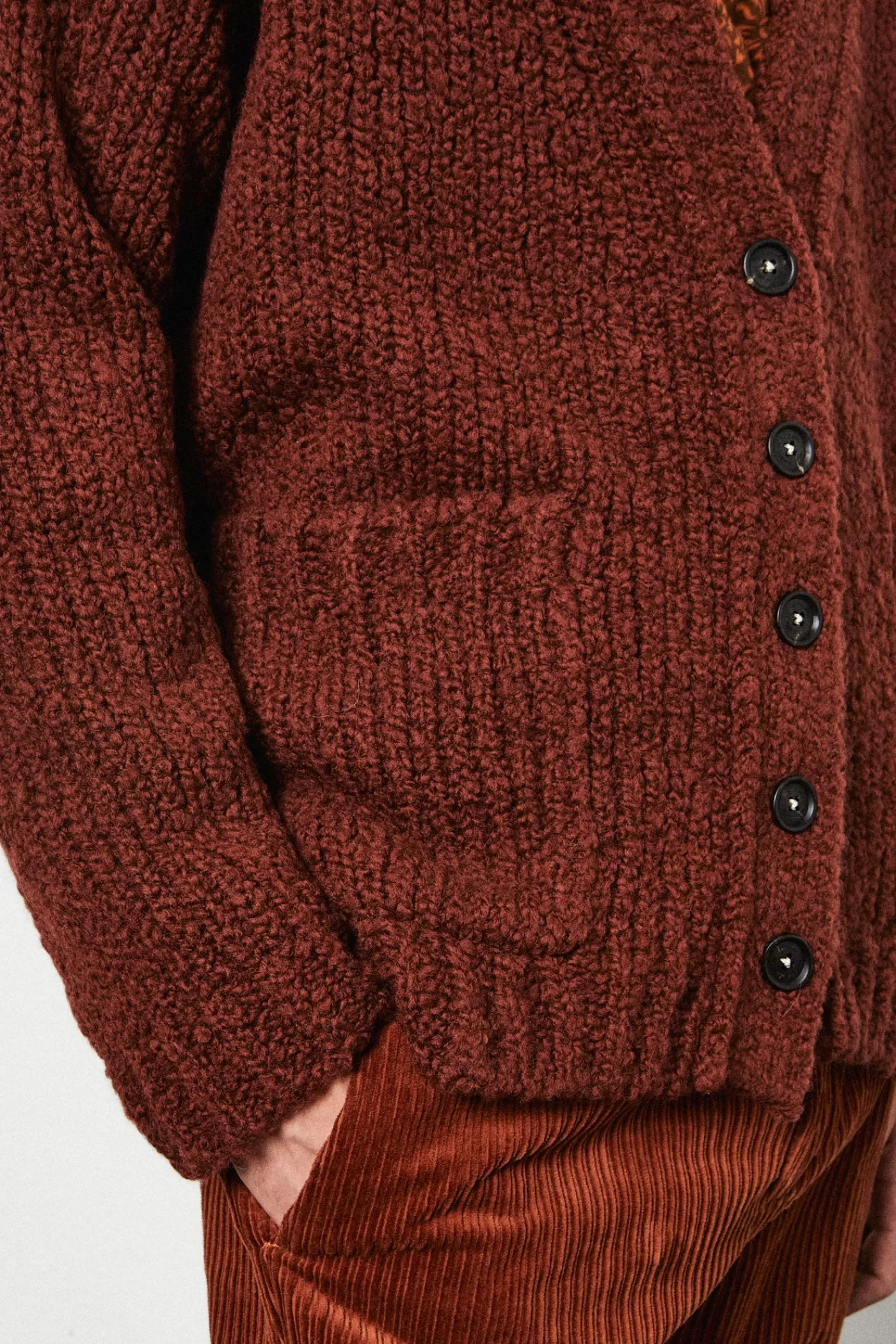 An oversized fit cardigan with buttons crafted from soft bio wool, knitted in G3 stocking stitch.