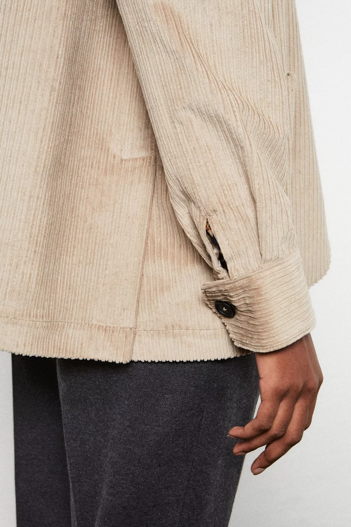Oversized fit caban jacket with dropped shoulders, sleeves with shirt cuffs, patch and high boat-cut pockets, and real horn buttons. Made of cotton comfort corduroy.