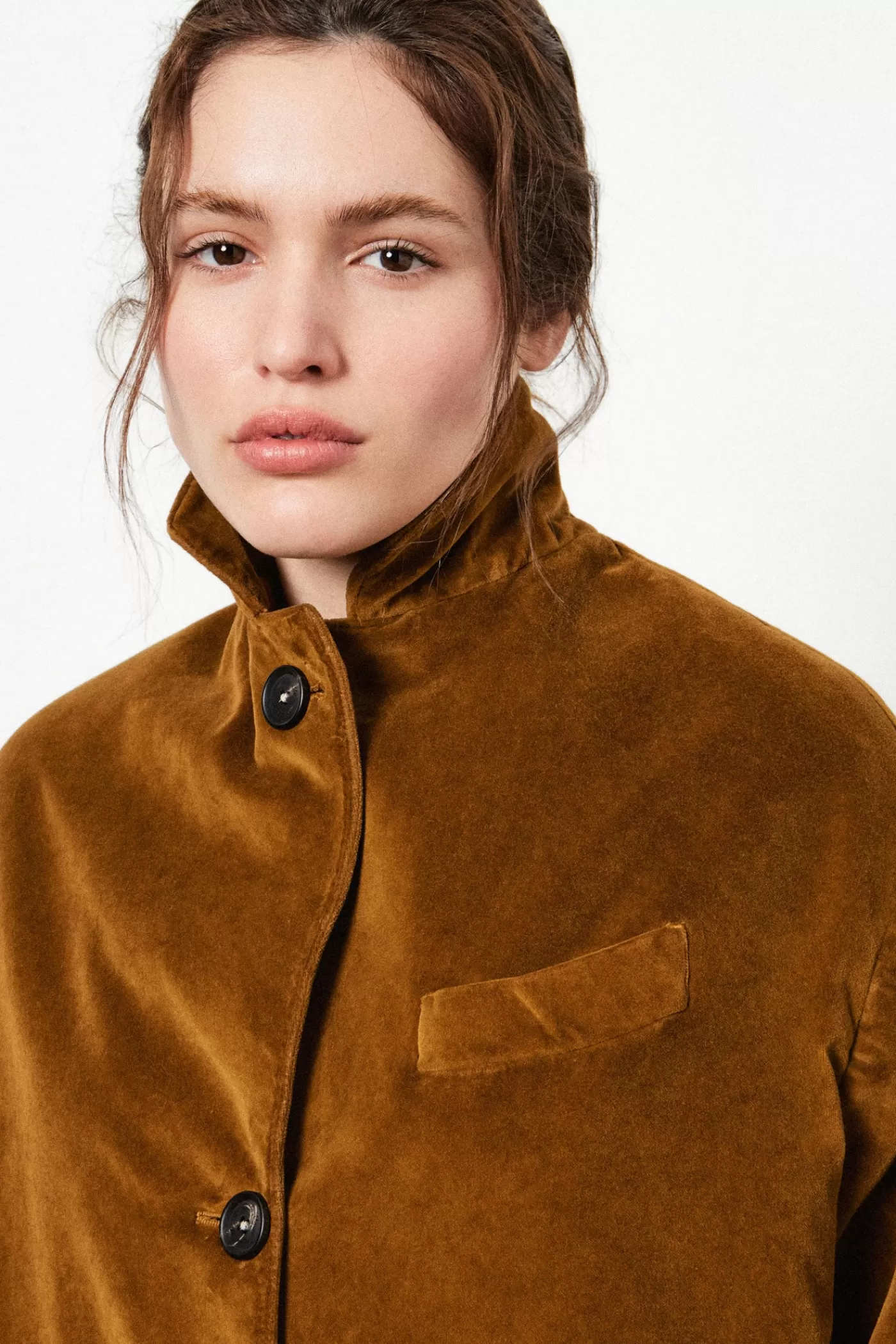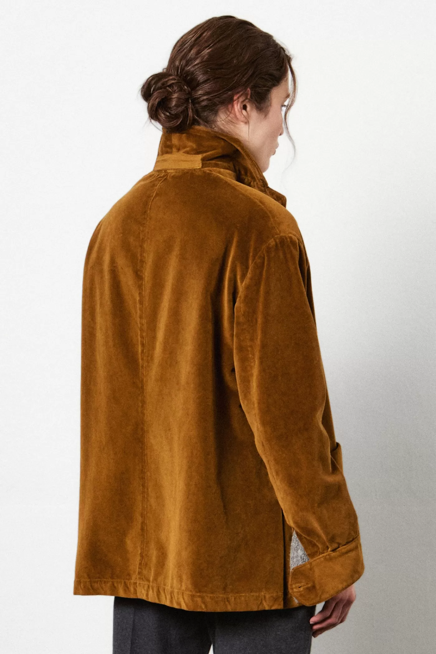 Oversized single-breasted caban with dropped shoulders, shirt cuffs, patch pockets and high boat-shaped pocket, genuine horn buttons, made of pure cotton velvet.