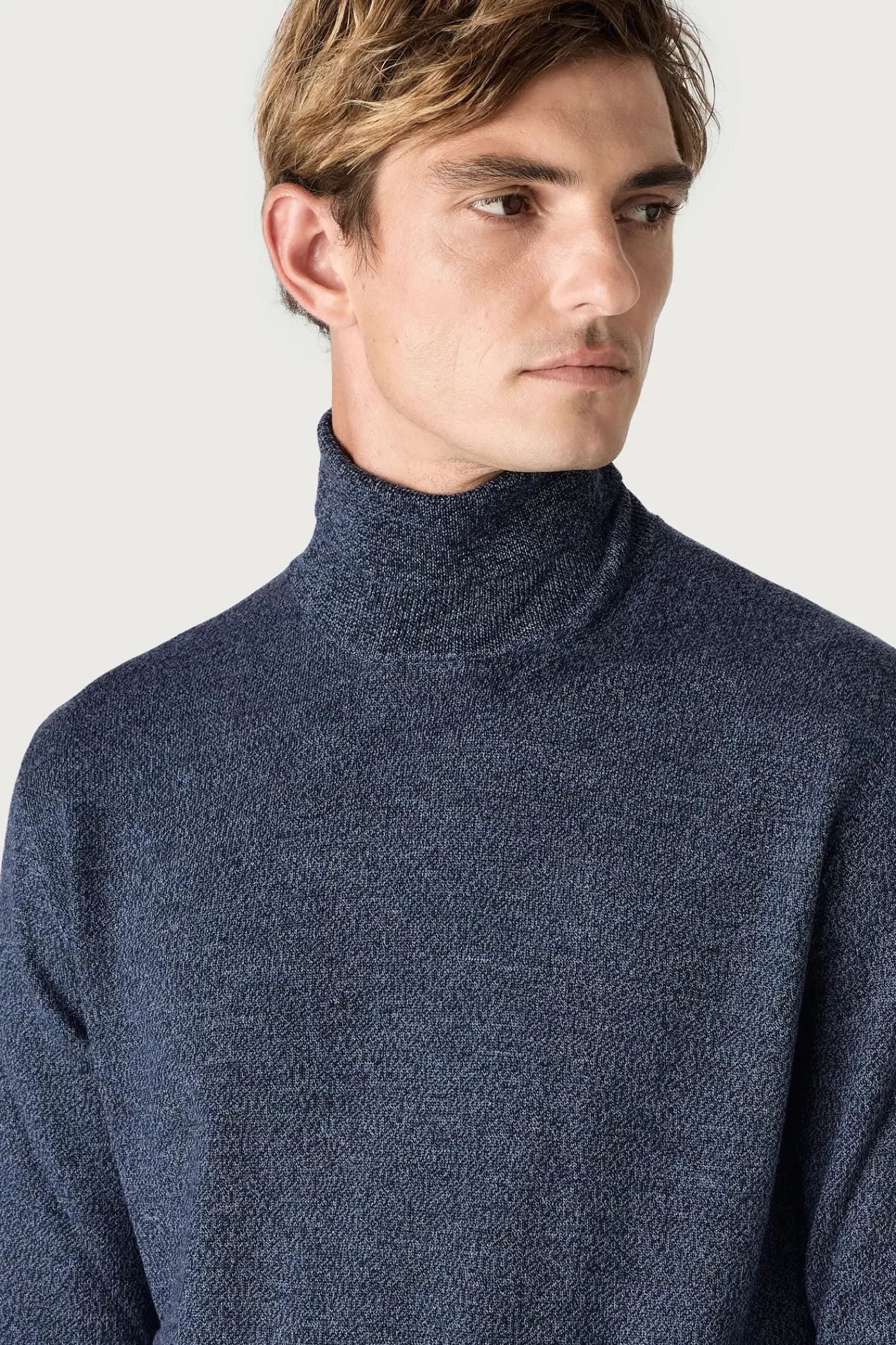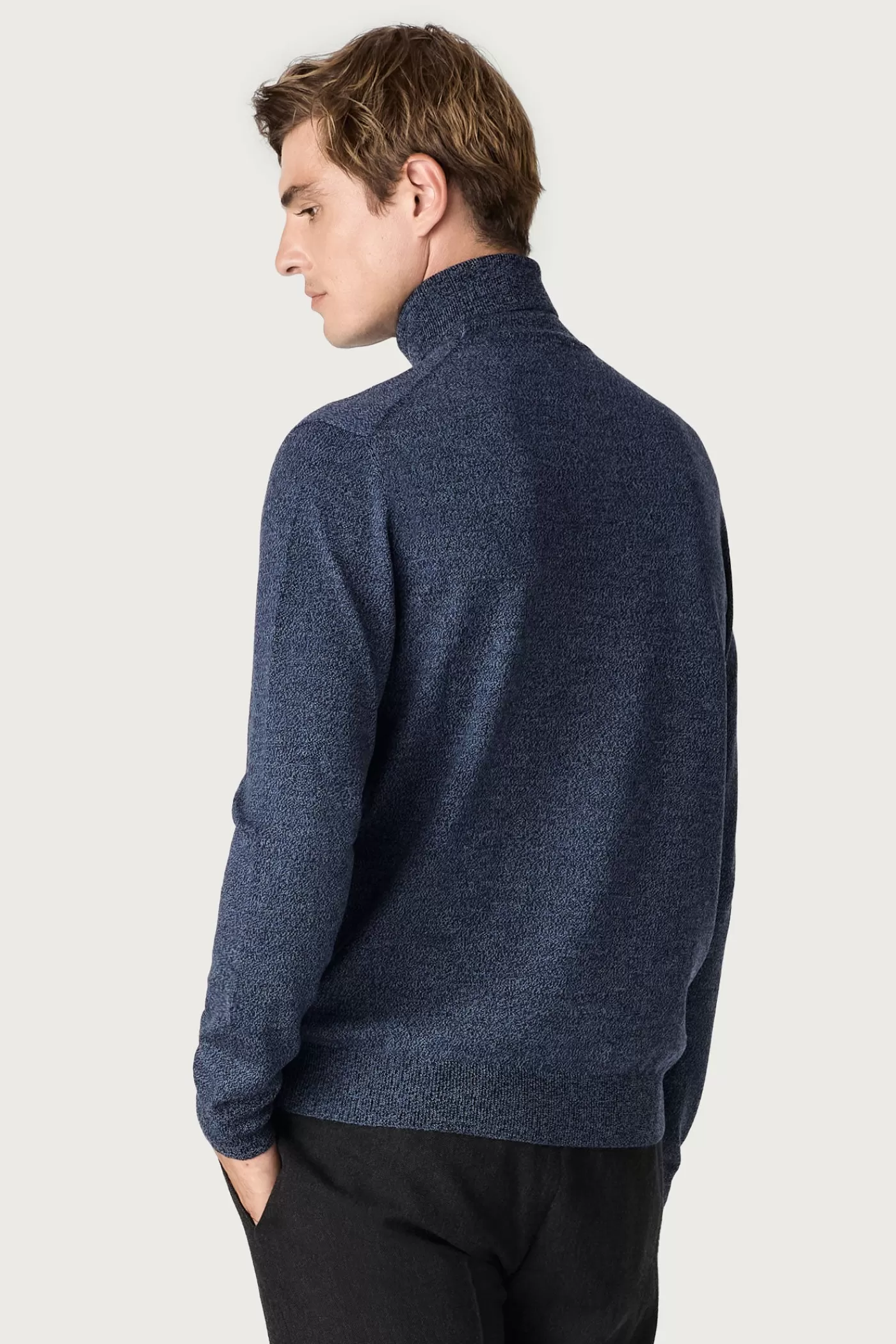 A regular fit turtleneck sweater in worsted pure extrafine merino wool, featuring dropped shoulders and ribbed borders. Knitted in G15 stocking stitch.