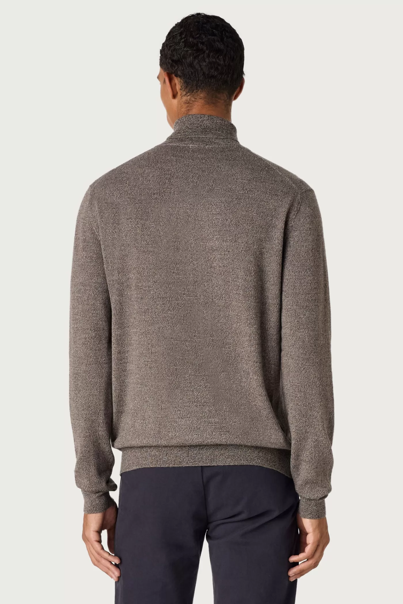 A regular fit turtleneck sweater in worsted pure extrafine merino wool, featuring dropped shoulders and ribbed borders. Knitted in G15 stocking stitch.