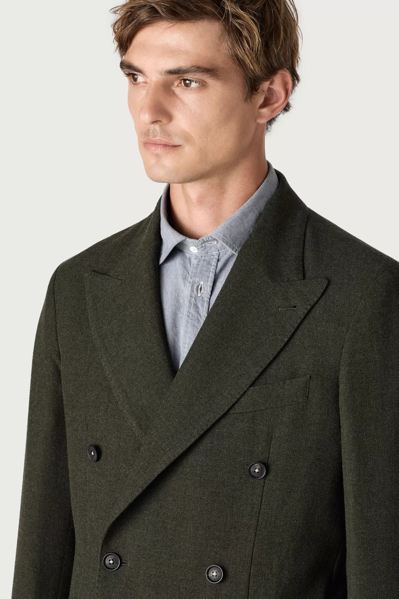 A regular fit 6-button double-breasted jacket with a peak lapel, flap pockets, and a double back vent. Crafted from soft pure wool with horn buttons.