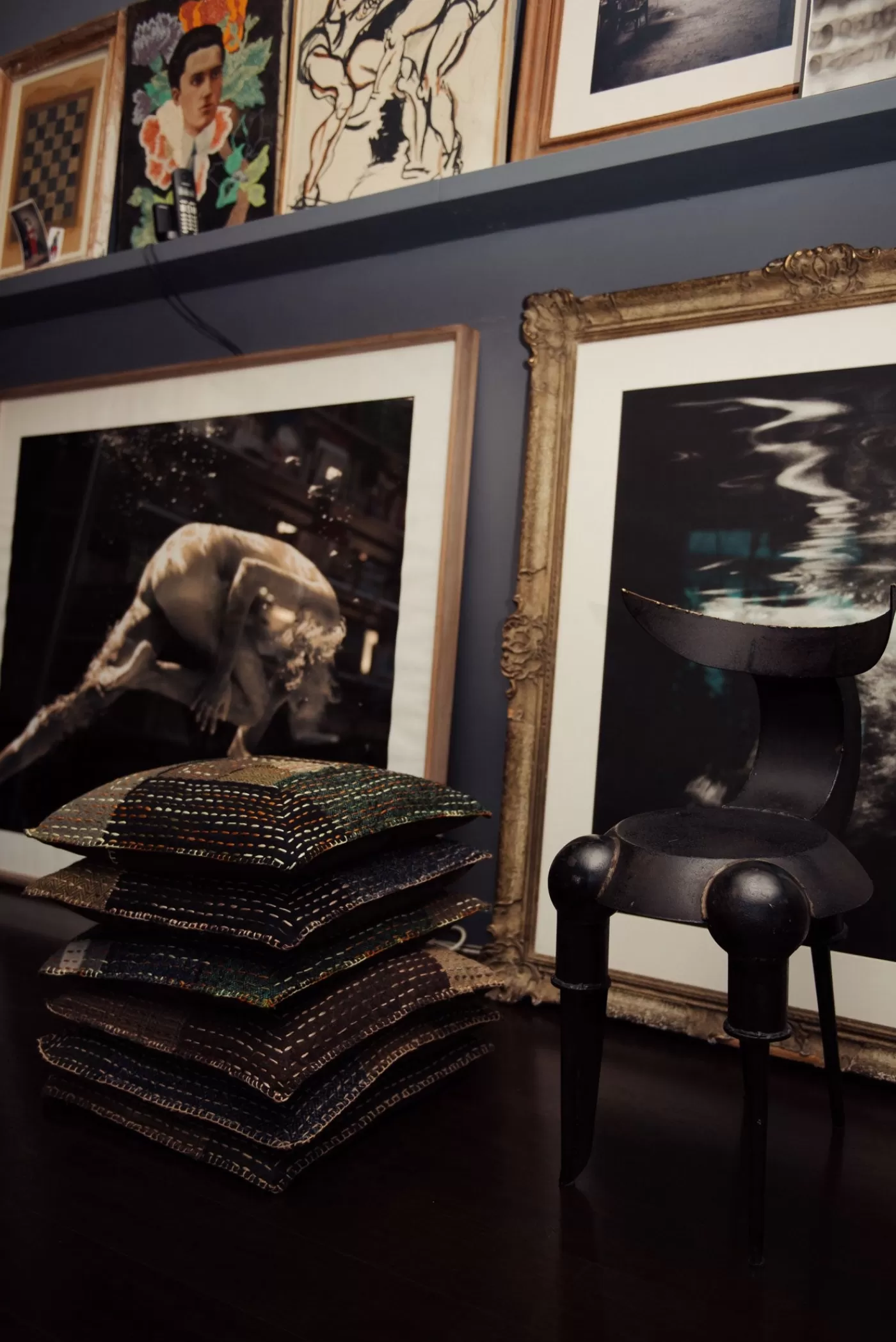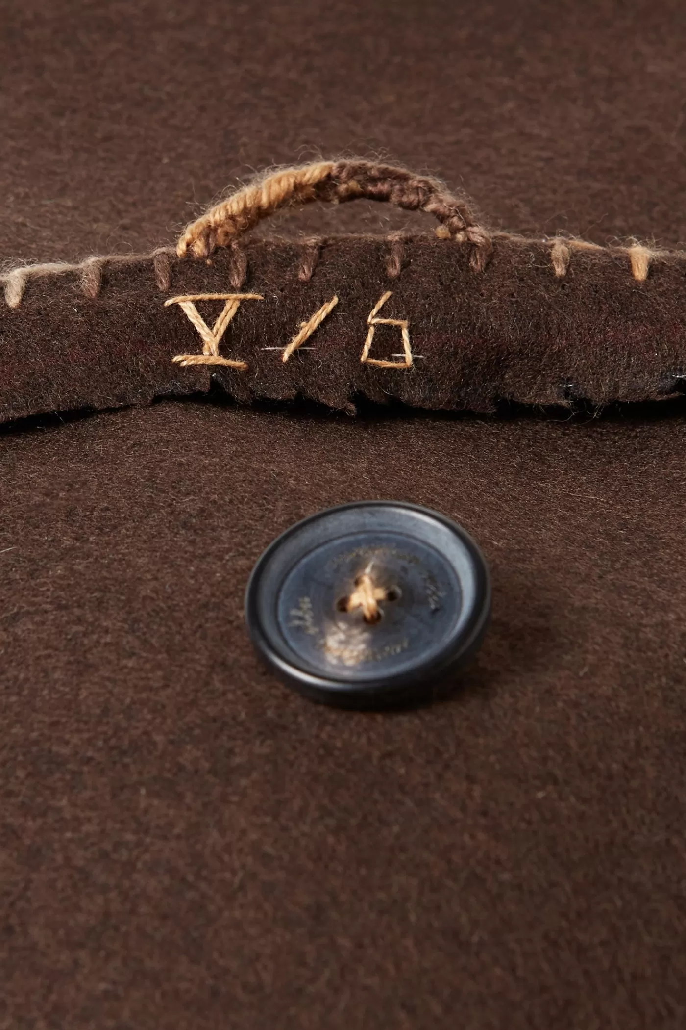 Multicoloured cushion featuring a patchwork design hand-sewn with leftover fabrics from the Fall/Winter 2021 collection, hand-finished edges, a squared shape and rear closure with one branded, horn button. Numbered on its inside: V / 6. Size: 50×50