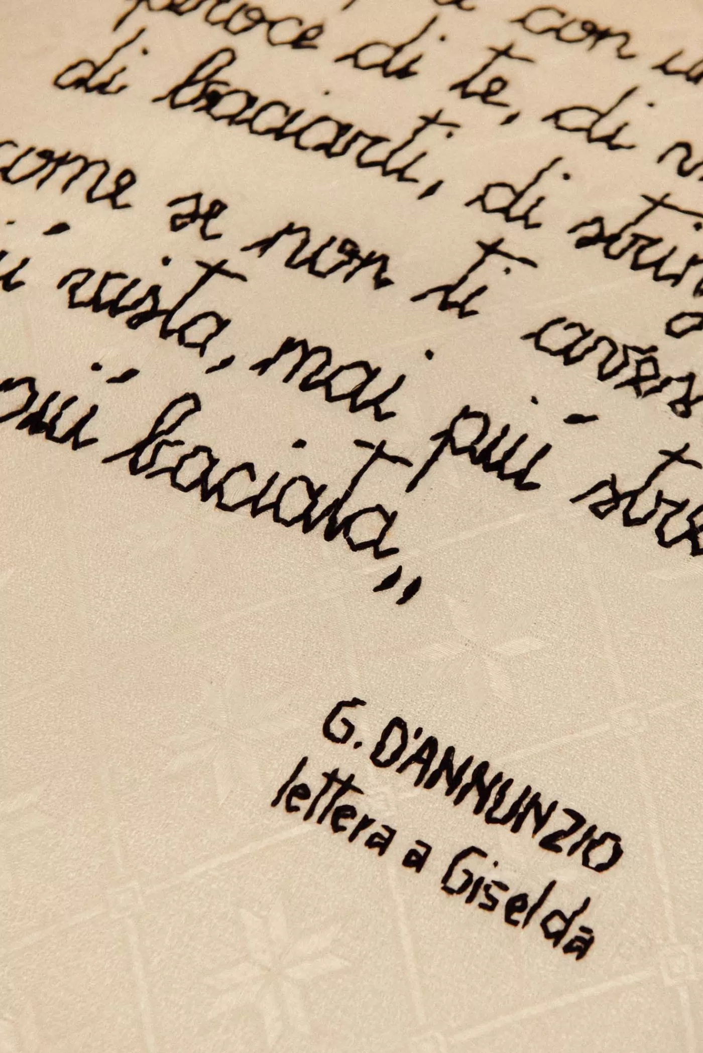 Cotton pillowcase with personalized hand-sewn embroidery. Gabriele D’Annunzio’s poem “Lettera a Giselda” is stitched across the surface of the pillow. Each piece is hand with high-quality yarn and is one-of-a-kind. The padding comes with the product.