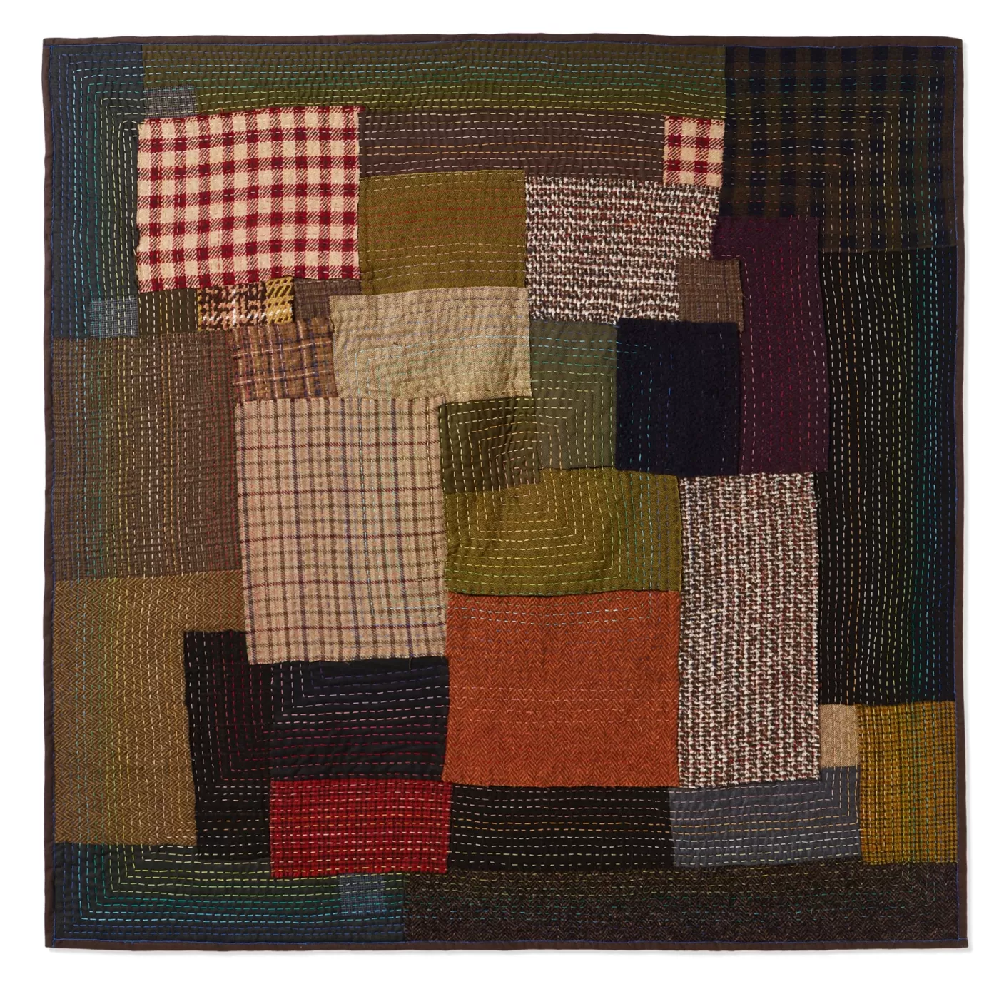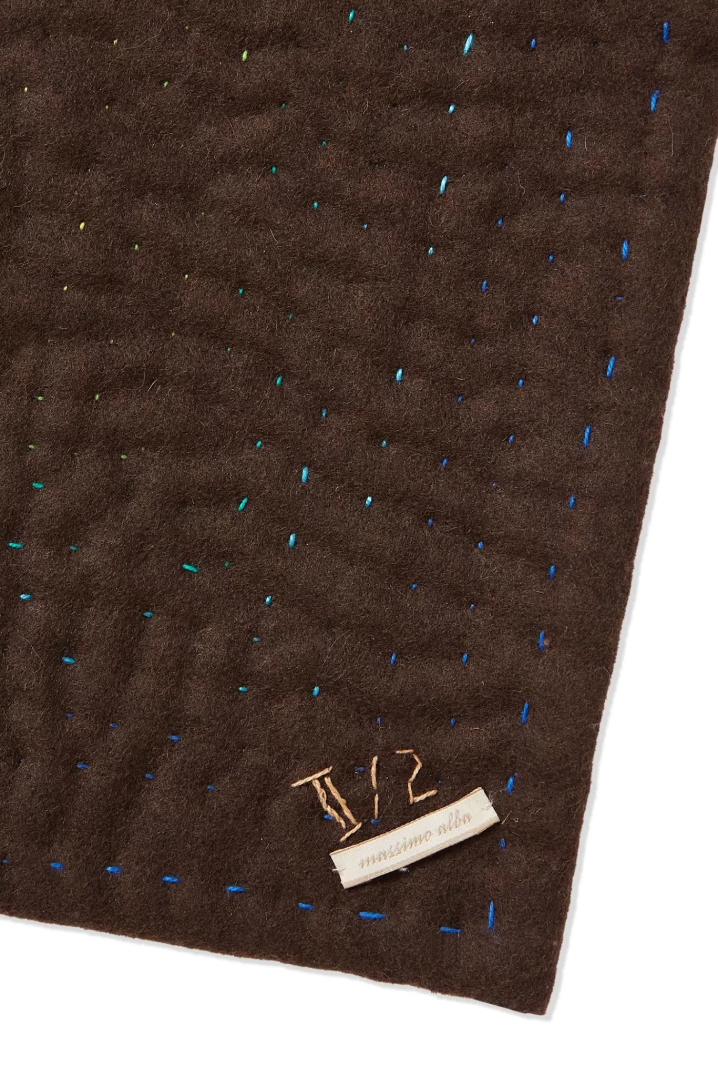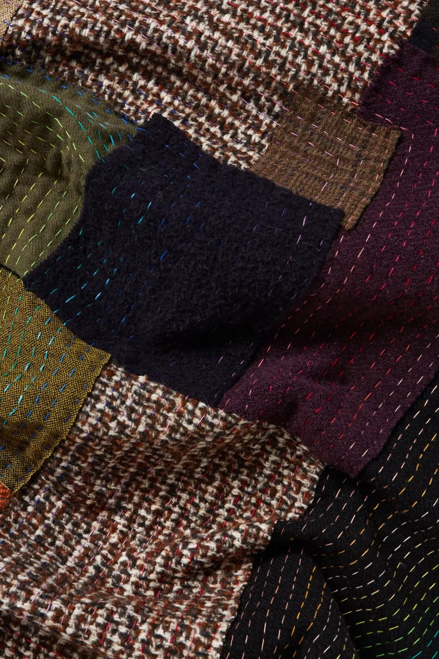 Multicoloured, double-face plaid featuring a patchwork design hand-sewn with leftover fabrics from the Fall/Winter 2021 collection, hand-finished edges and a squared shape. Numbered on its inside: II / 2 Size: 140×140.