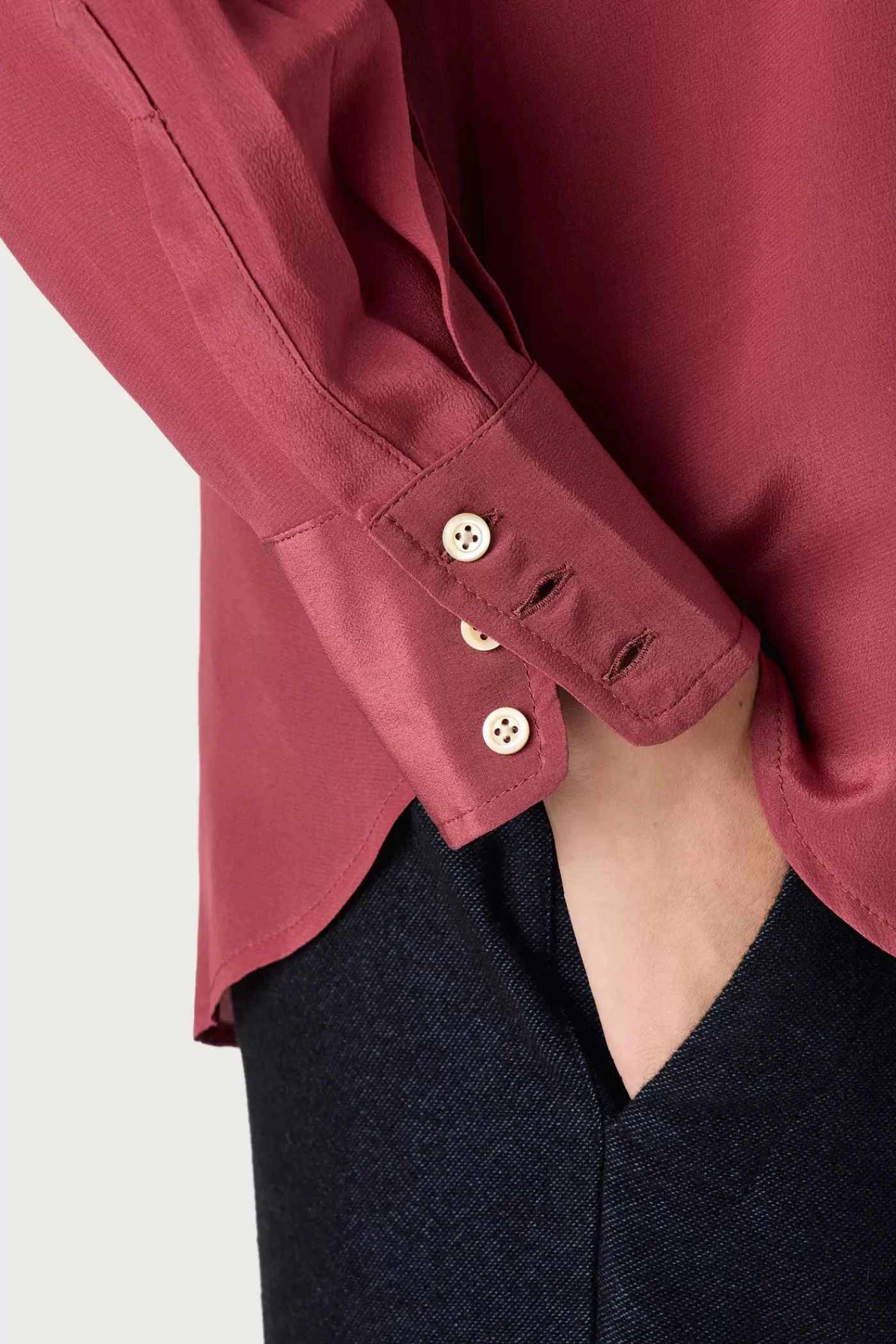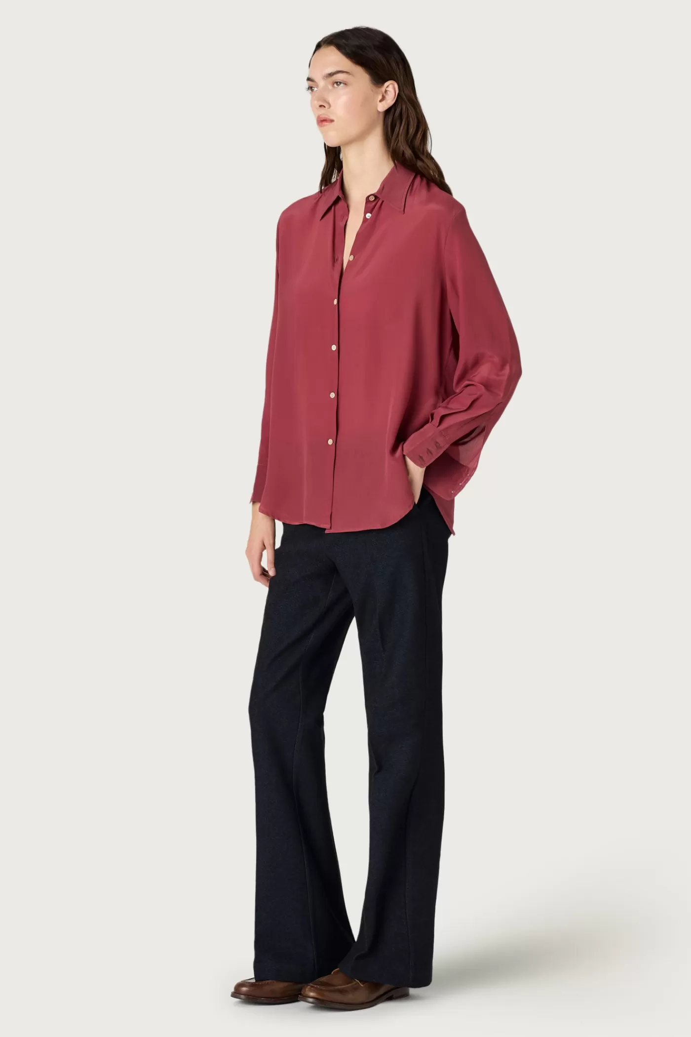 Shirt with pointed collar, relaxed fit, pointed yoke, without front placket, made of crepe de chine.