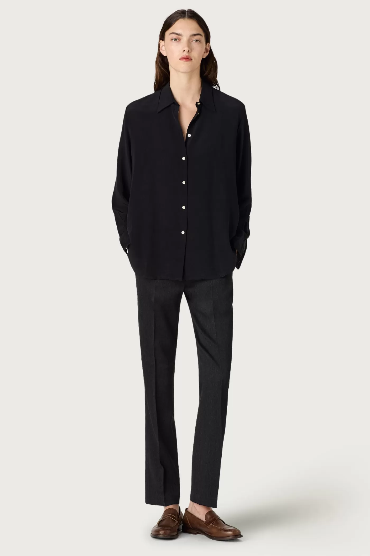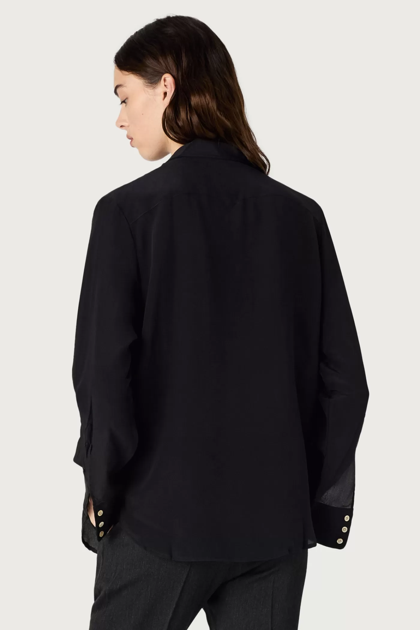 Shirt with pointed collar, relaxed fit, pointed yoke, without front placket, made of crepe de chine silk.
