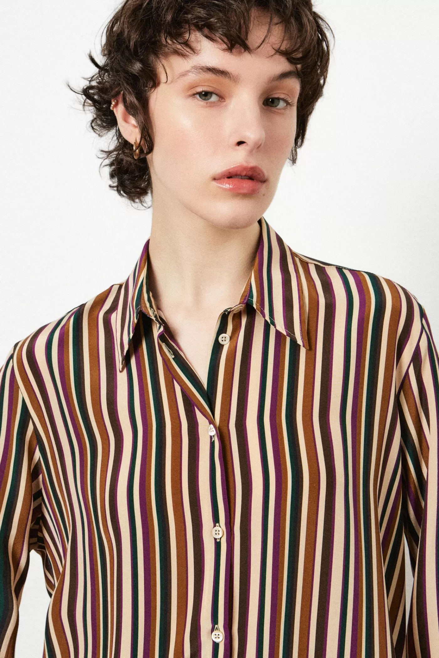Shirt with pointed collar, soft fit, pointed yoke, without front placket, made of printed crepe de chine.