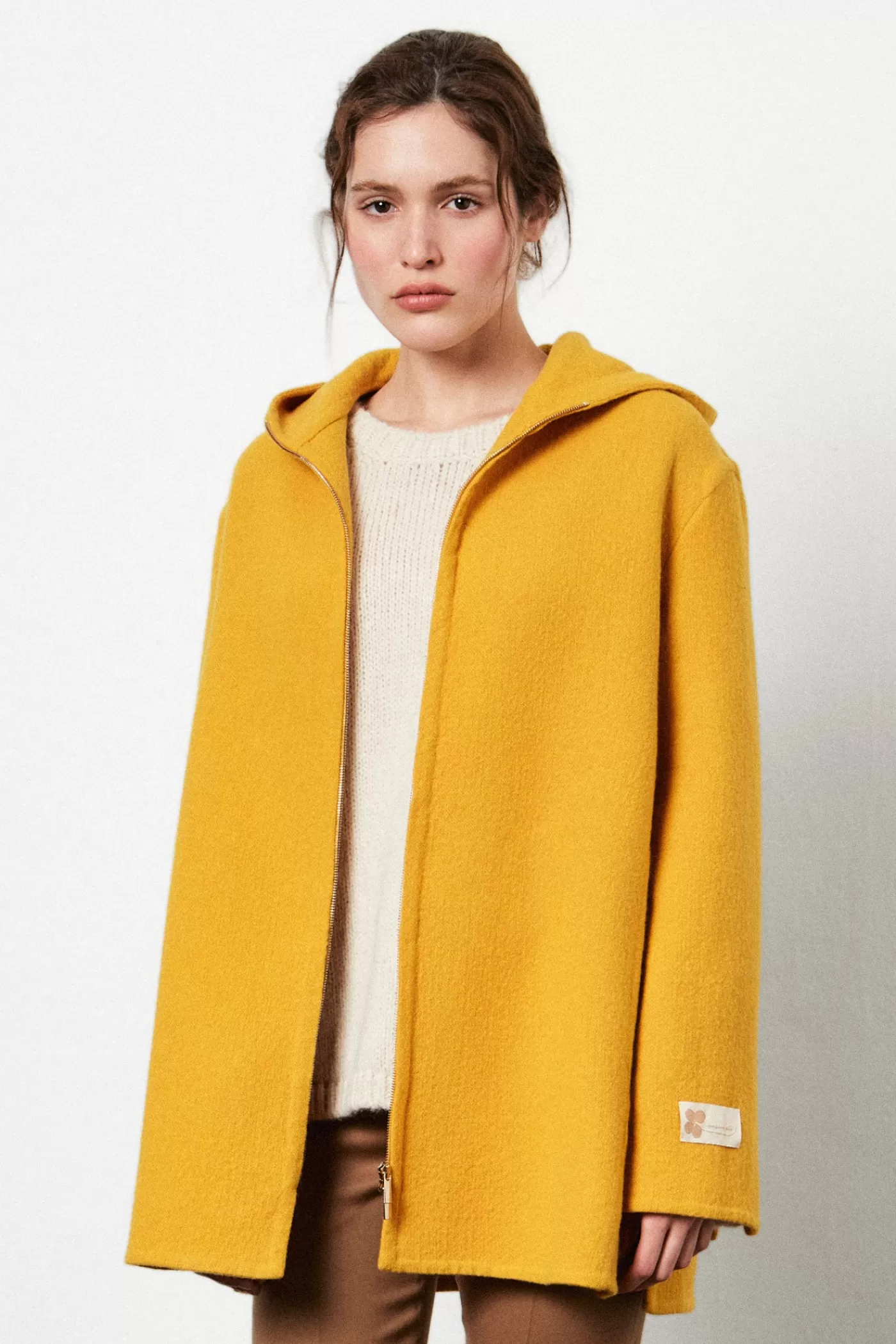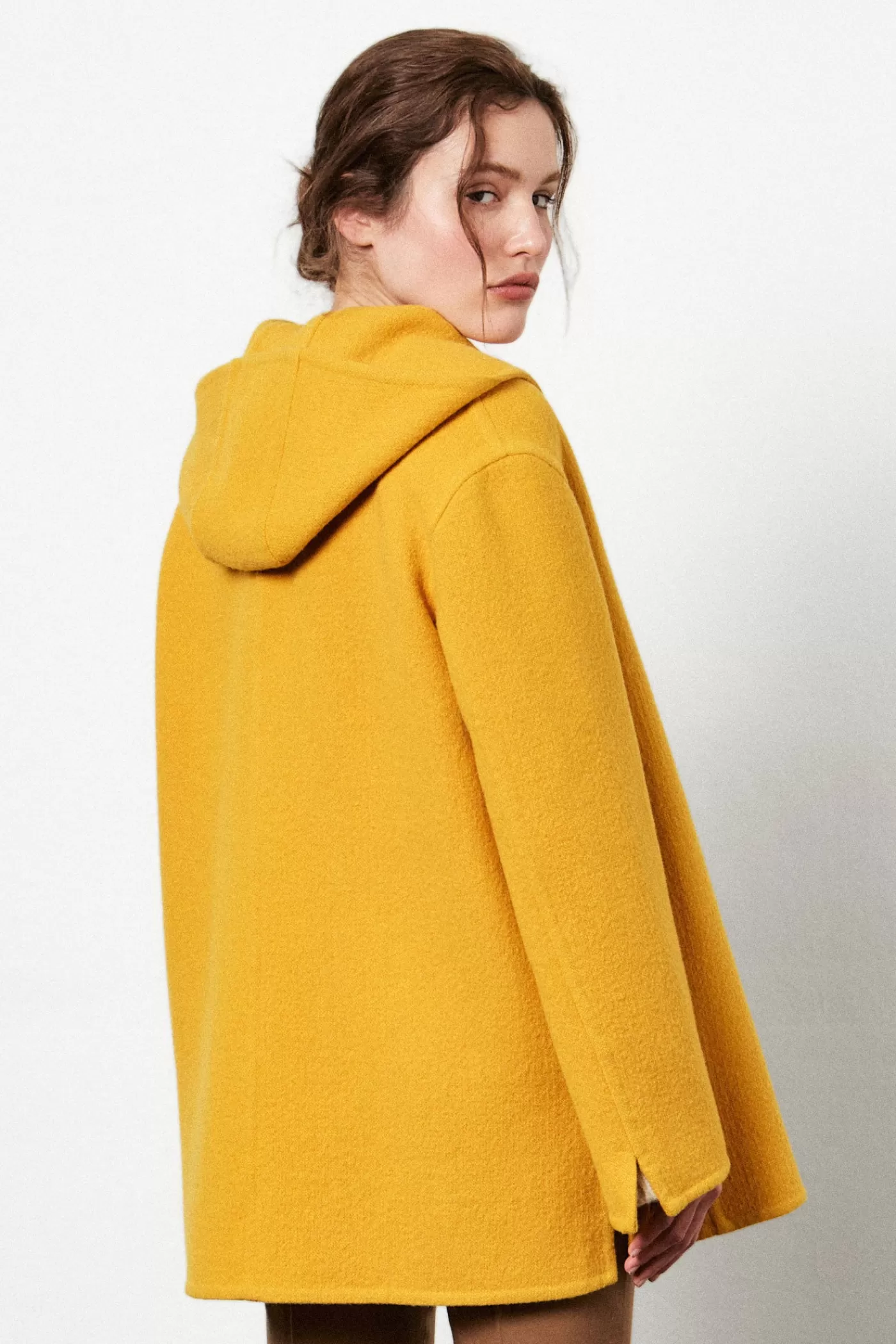 Single-breasted caban with hood and front zipper, two welt pockets, made of soft pure wool double-faced and hand-finished.