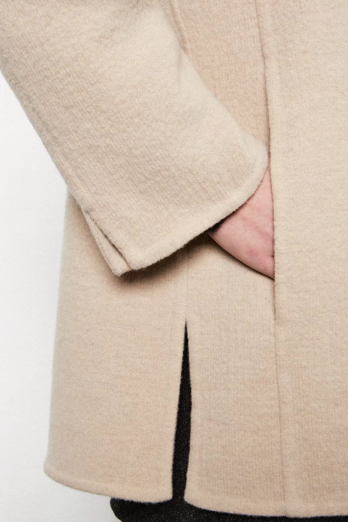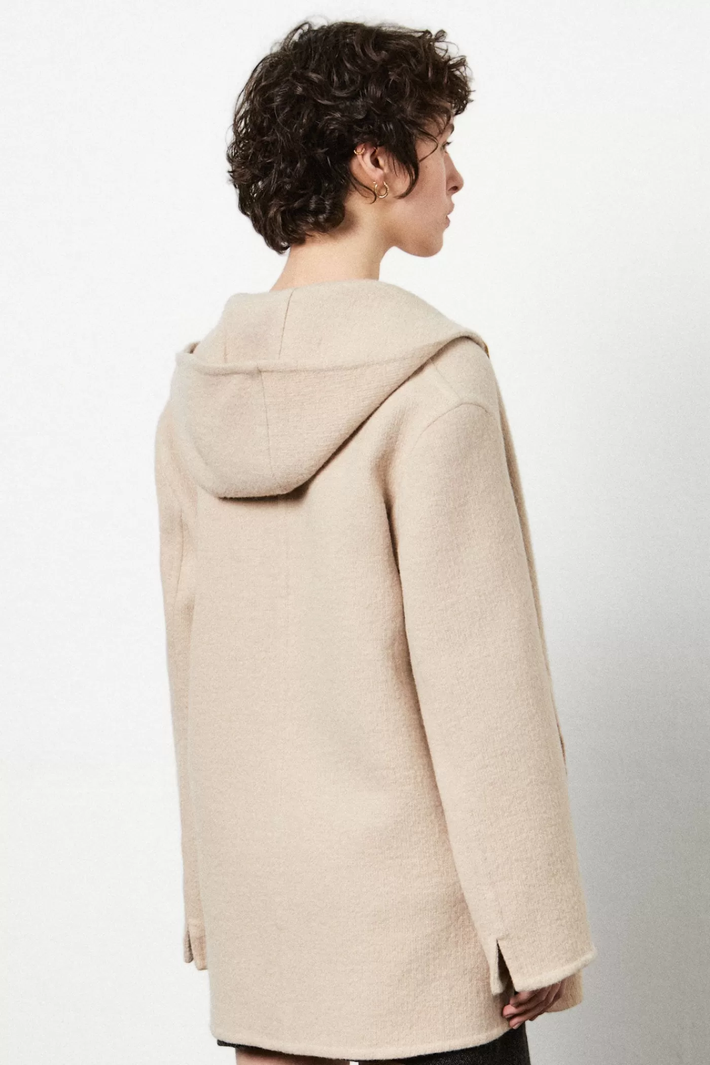 Single-breasted caban with hood and front zipper, two welt pockets, made of soft pure wool double-faced and hand-finished.