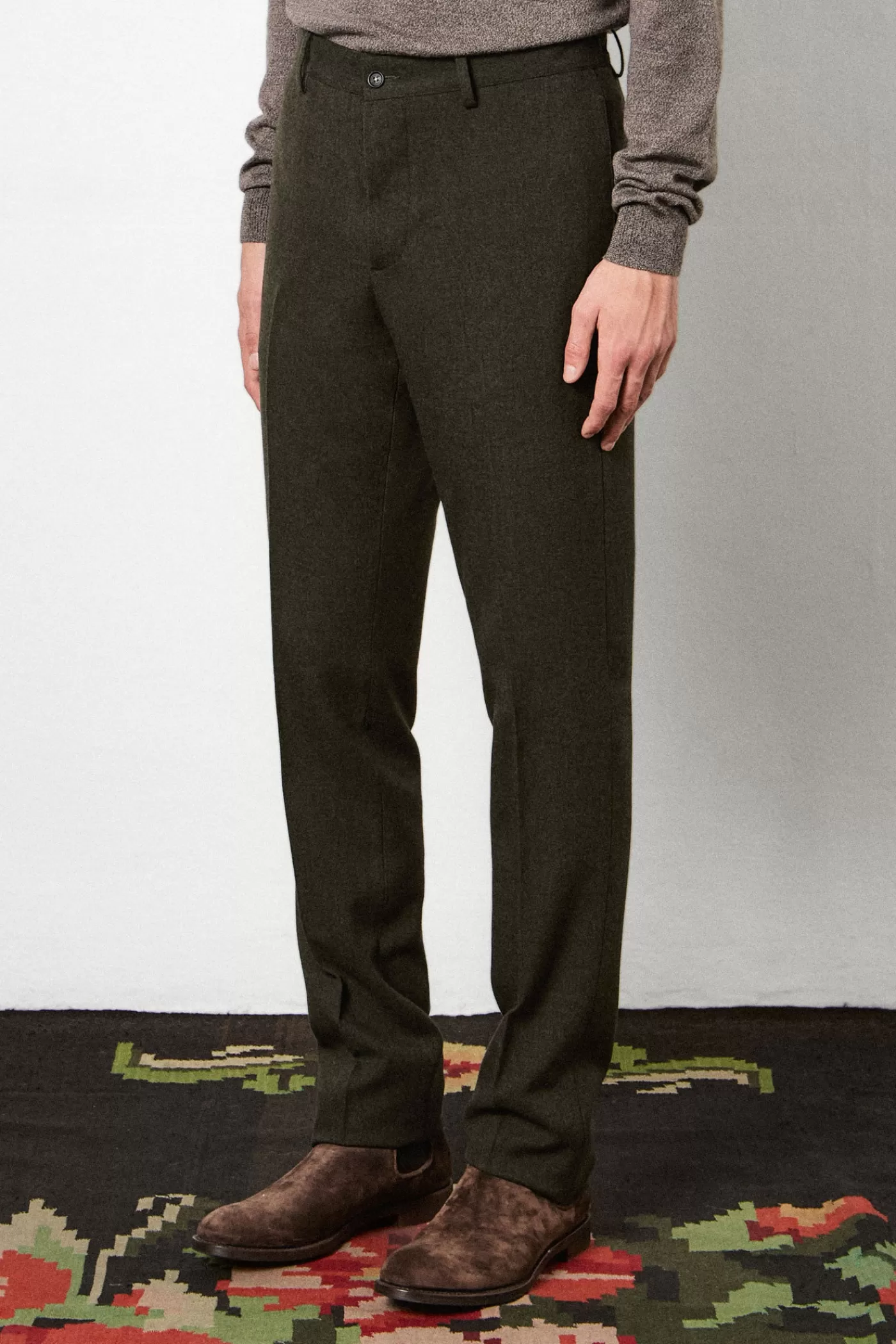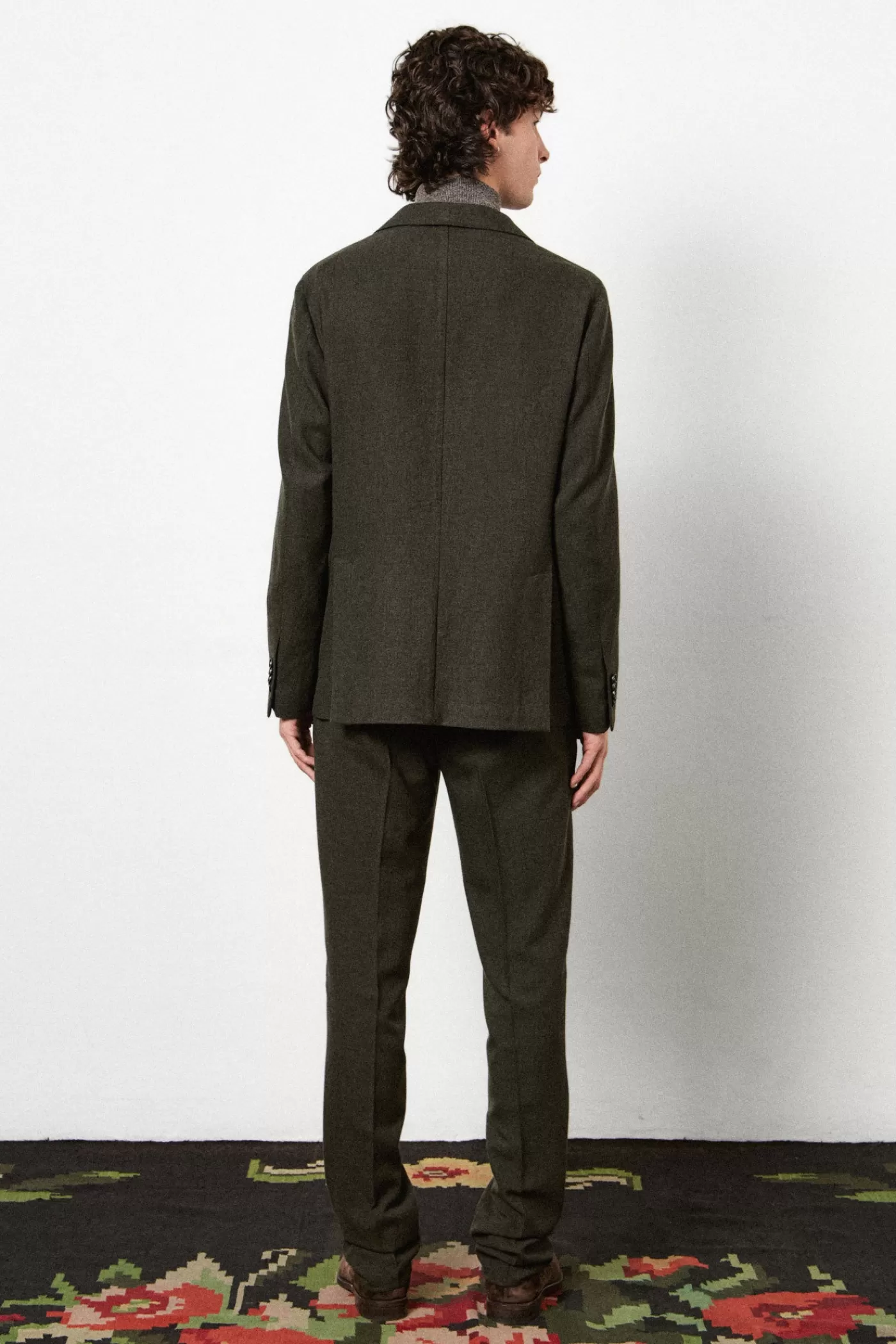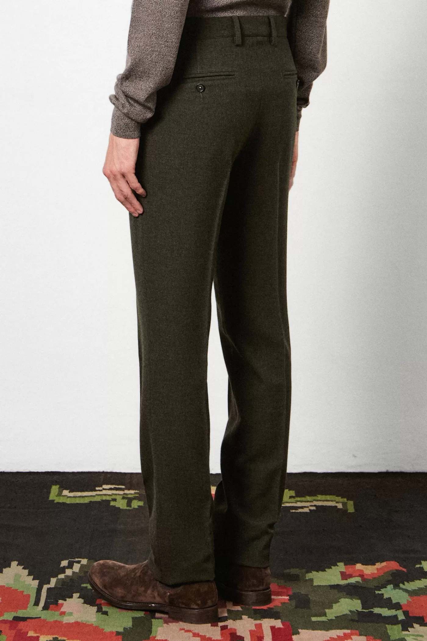 A regular fit suit consisting of a single-breasted jacket with a notch lapel, flap and ticket pockets, and a double back vent. Paired with regular/slim fit flat front trousers featuring a button closure, rear fillet pockets with buttons on the back, and a straight leg. Crafted from soft pure wool with horn buttons.