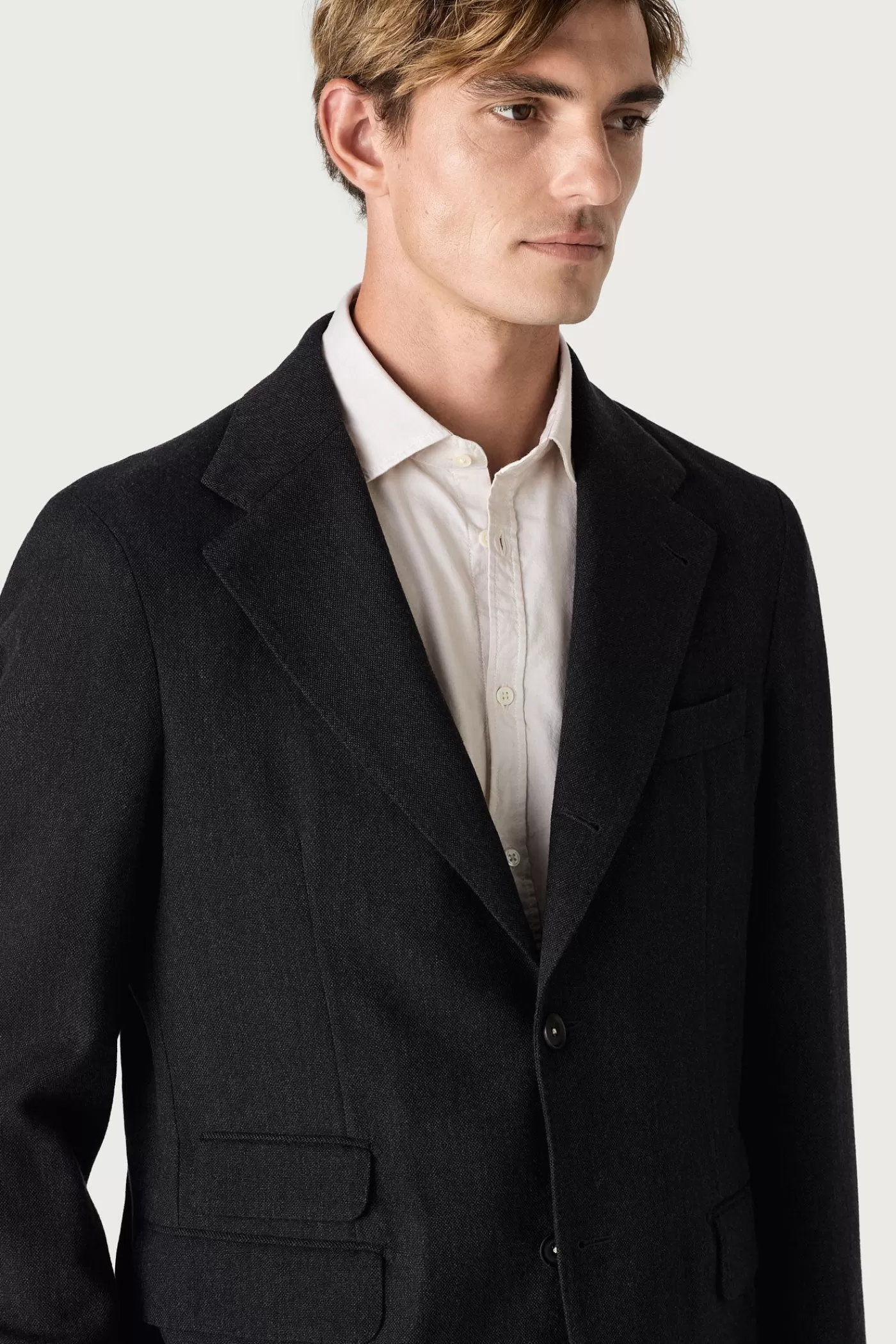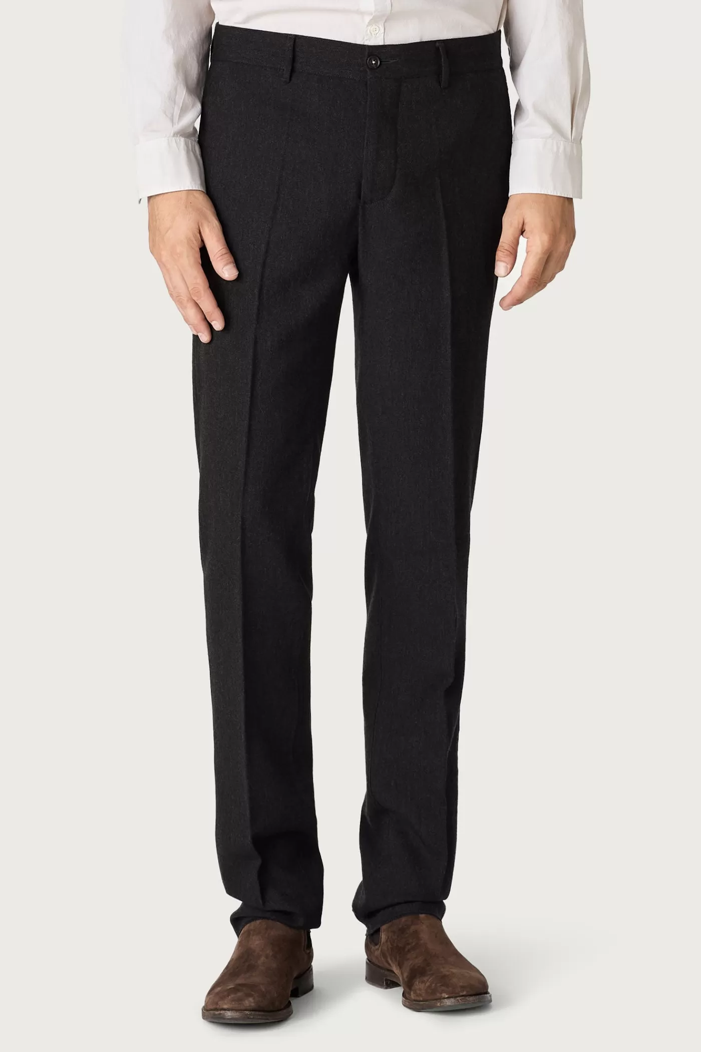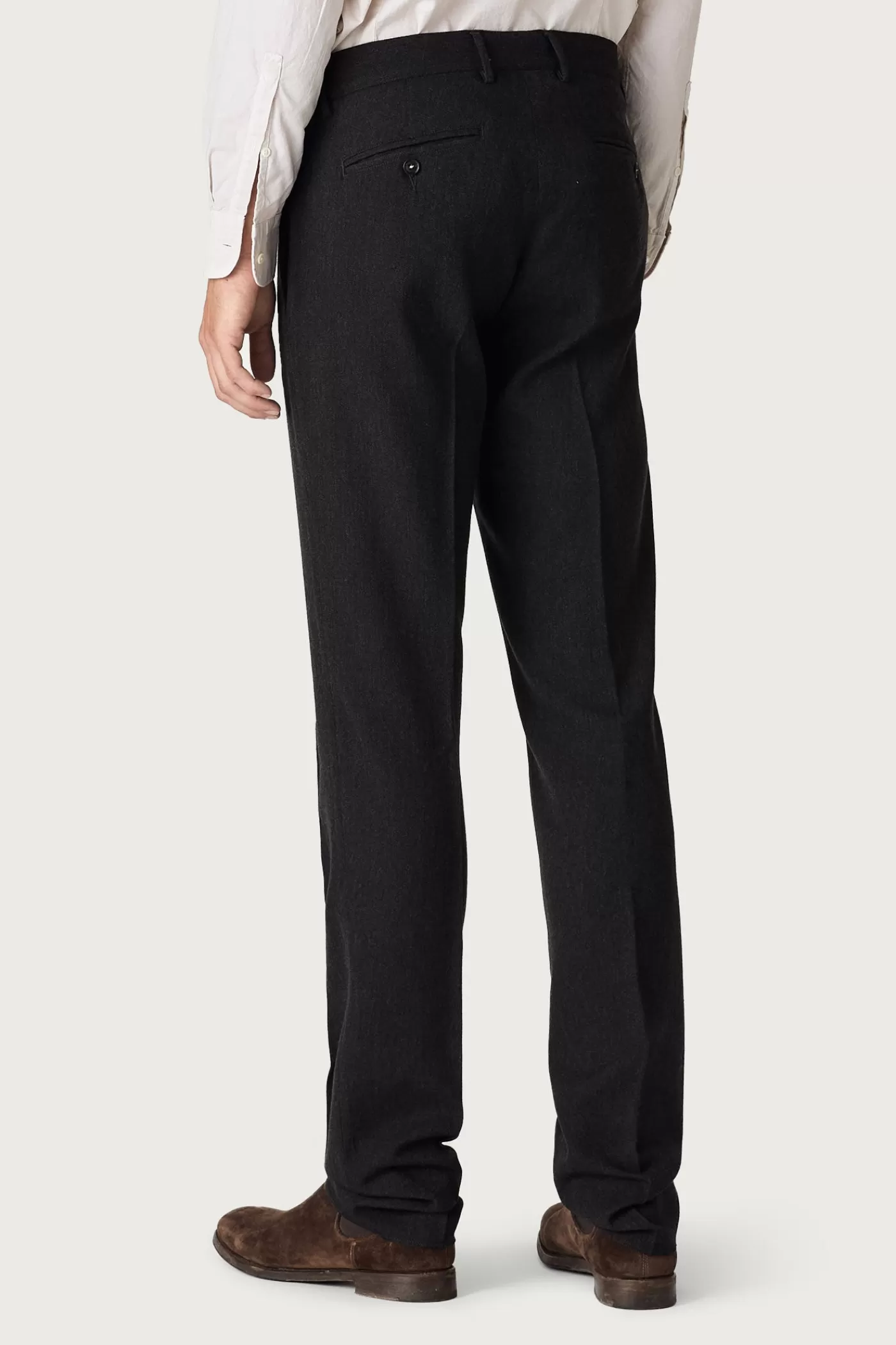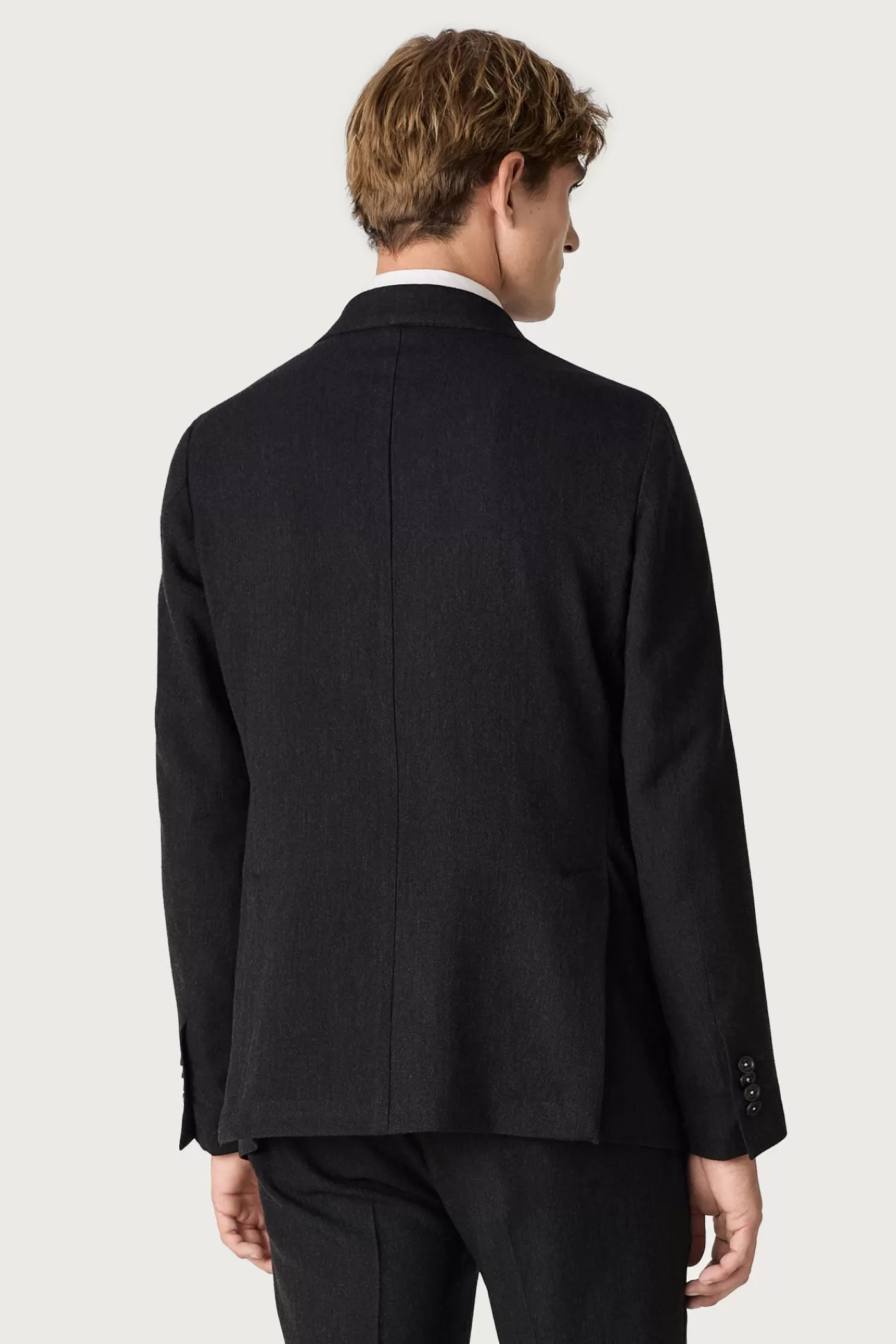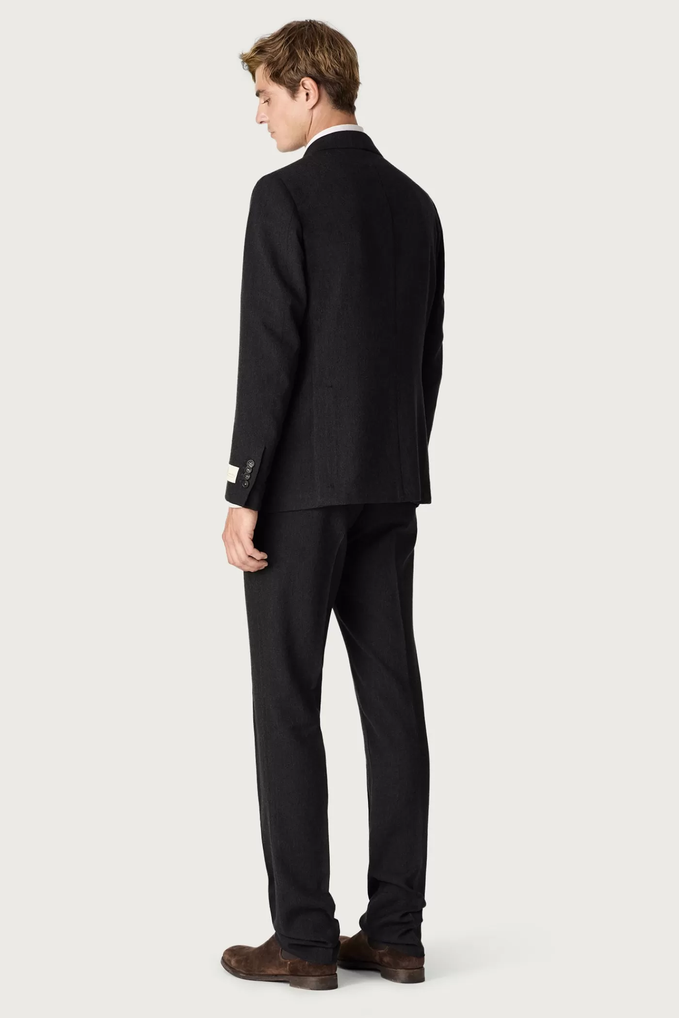 A regular fit suit consisting of a single-breasted jacket with a notch lapel, flap and ticket pockets, and a double back vent. Paired with regular/slim fit flat front trousers featuring a button closure, rear fillet pockets with buttons on the back, and a straight leg. Crafted from soft pure wool with horn buttons.