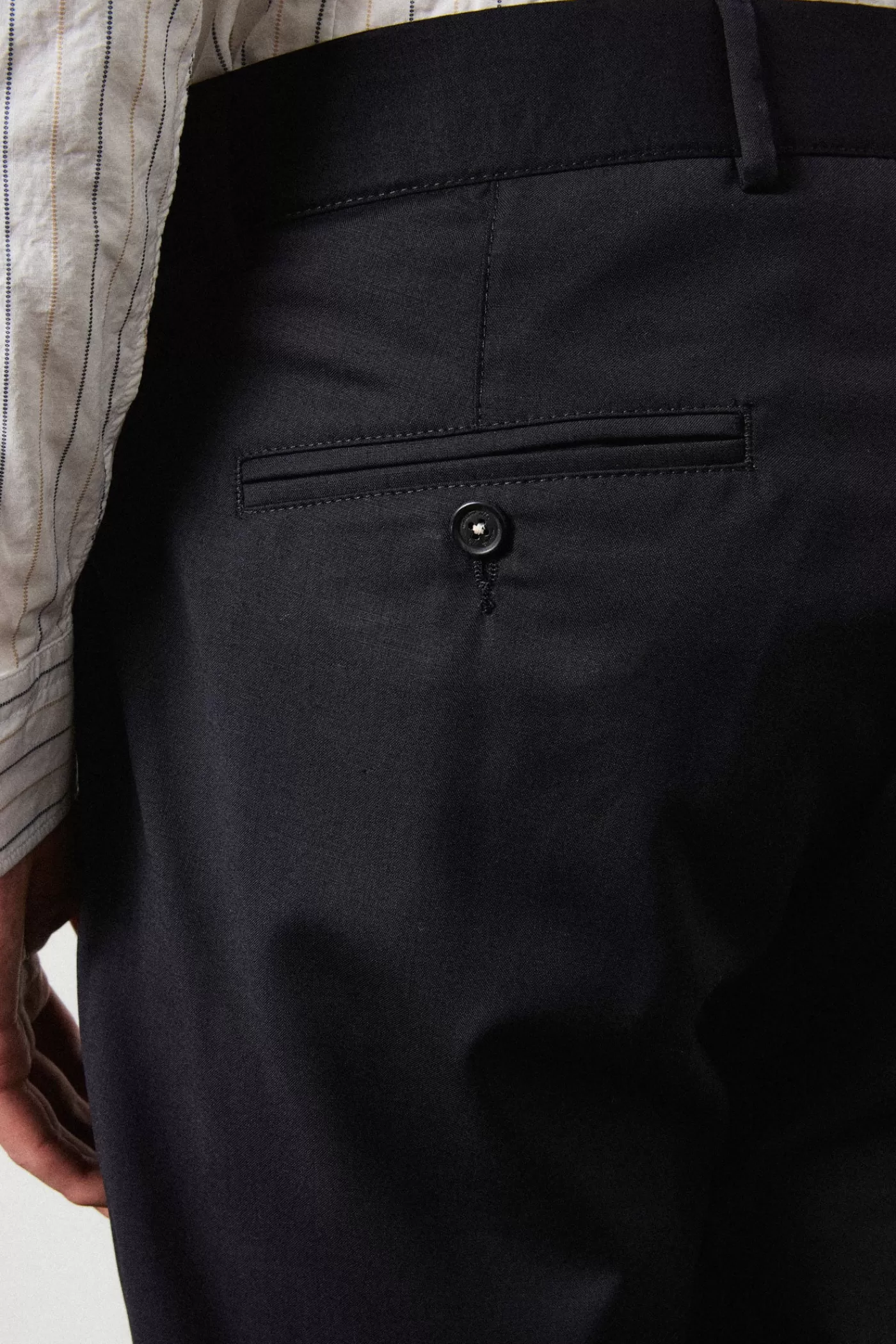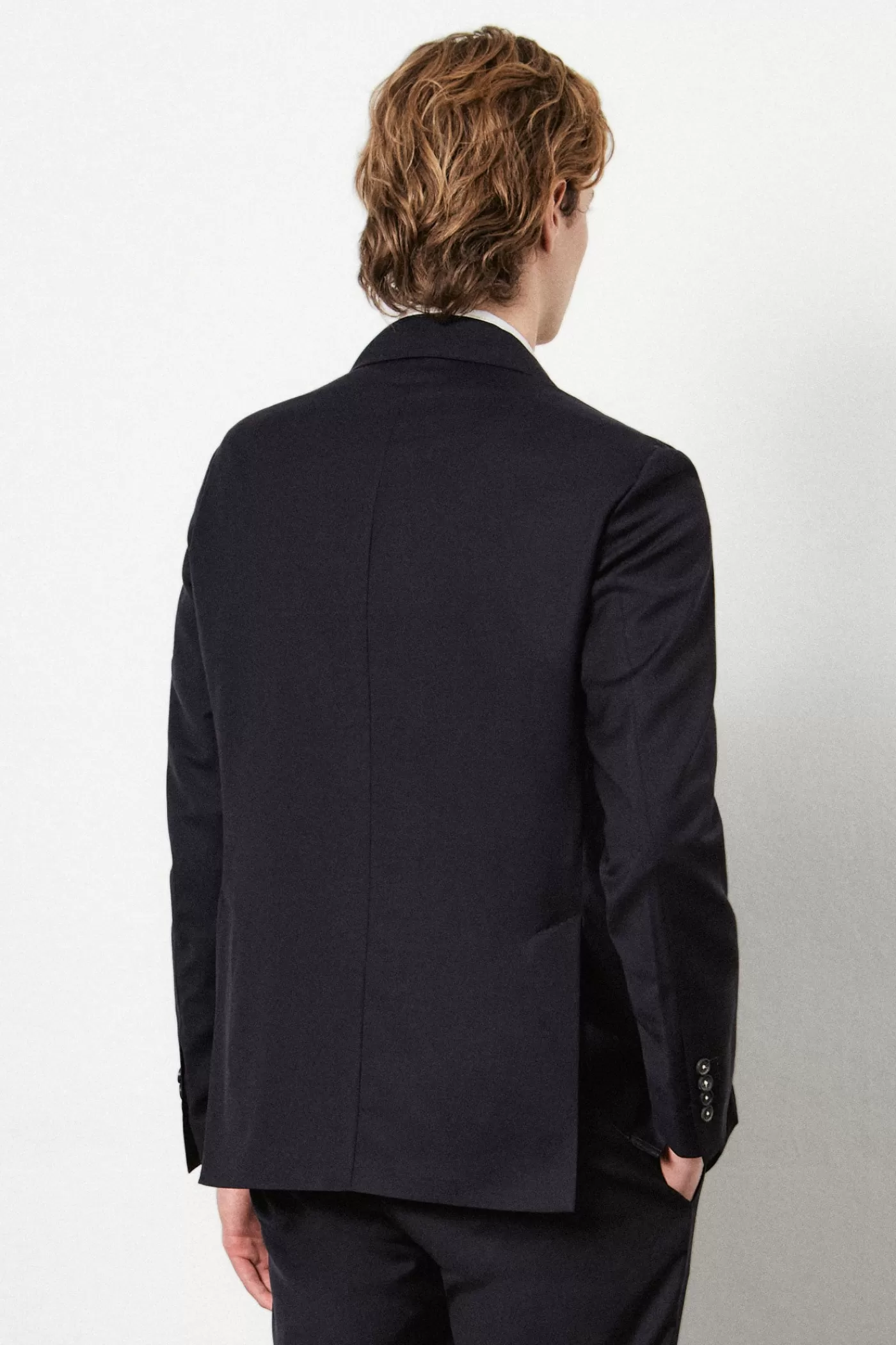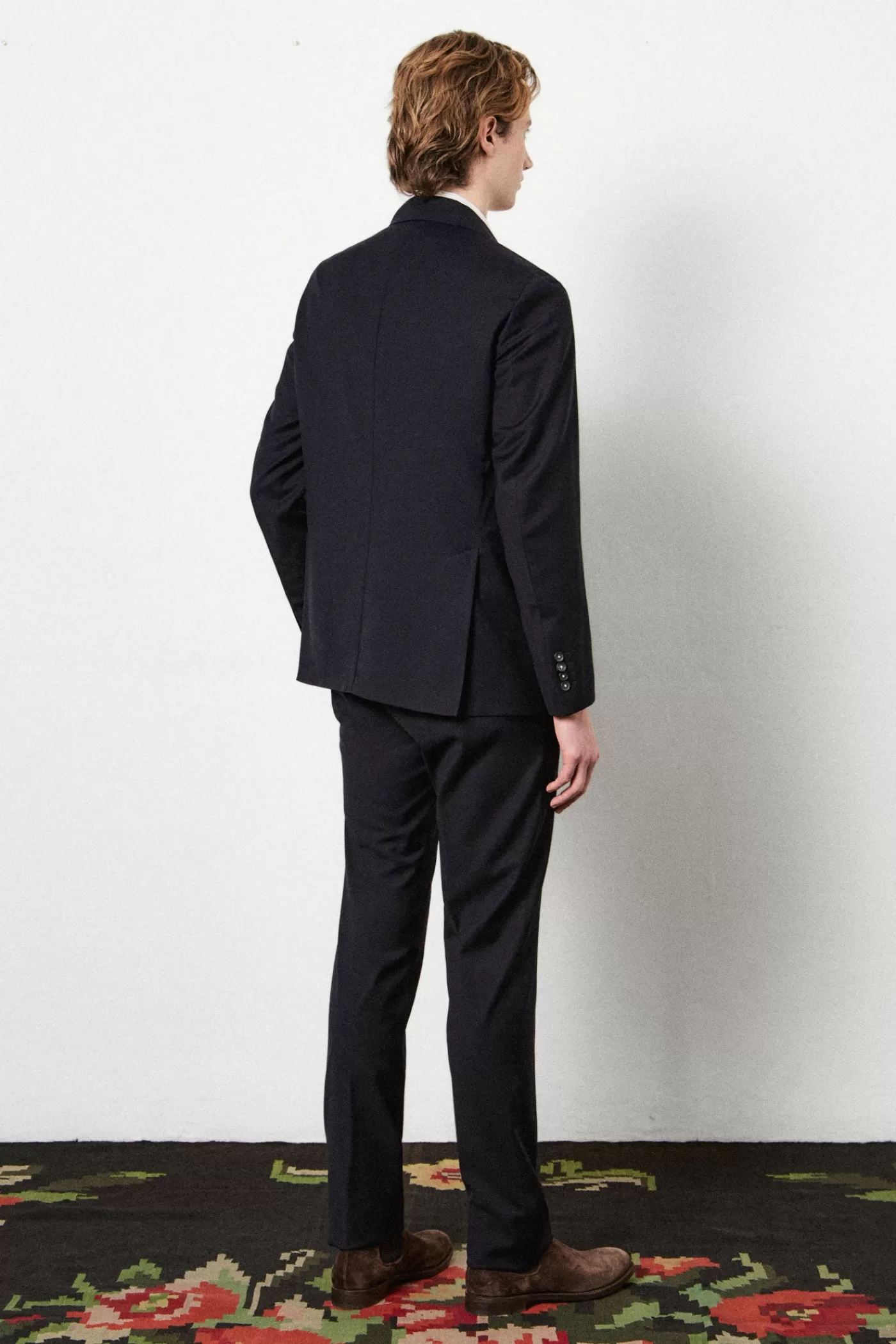 A regular fit suit consisting of a single-breasted jacket with a notch lapel, flap and ticket pockets, and a double back vent. Paired with regular/slim fit flat front trousers featuring a button closure, rear fillet pockets with buttons on the back, and a straight leg. Crafted from soft pure wool with horn buttons.