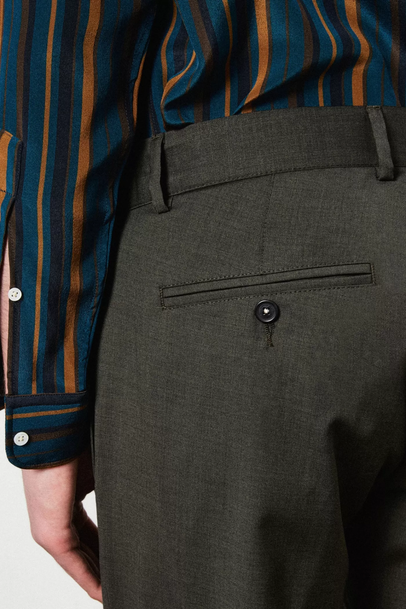 A regular fit suit consisting of a single-breasted jacket with a notch lapel, flap and ticket pockets, and a double back vent. Paired with regular/slim fit flat front trousers featuring a button closure, rear fillet pockets with buttons on the back, and a straight leg. Crafted from soft pure wool with horn buttons.