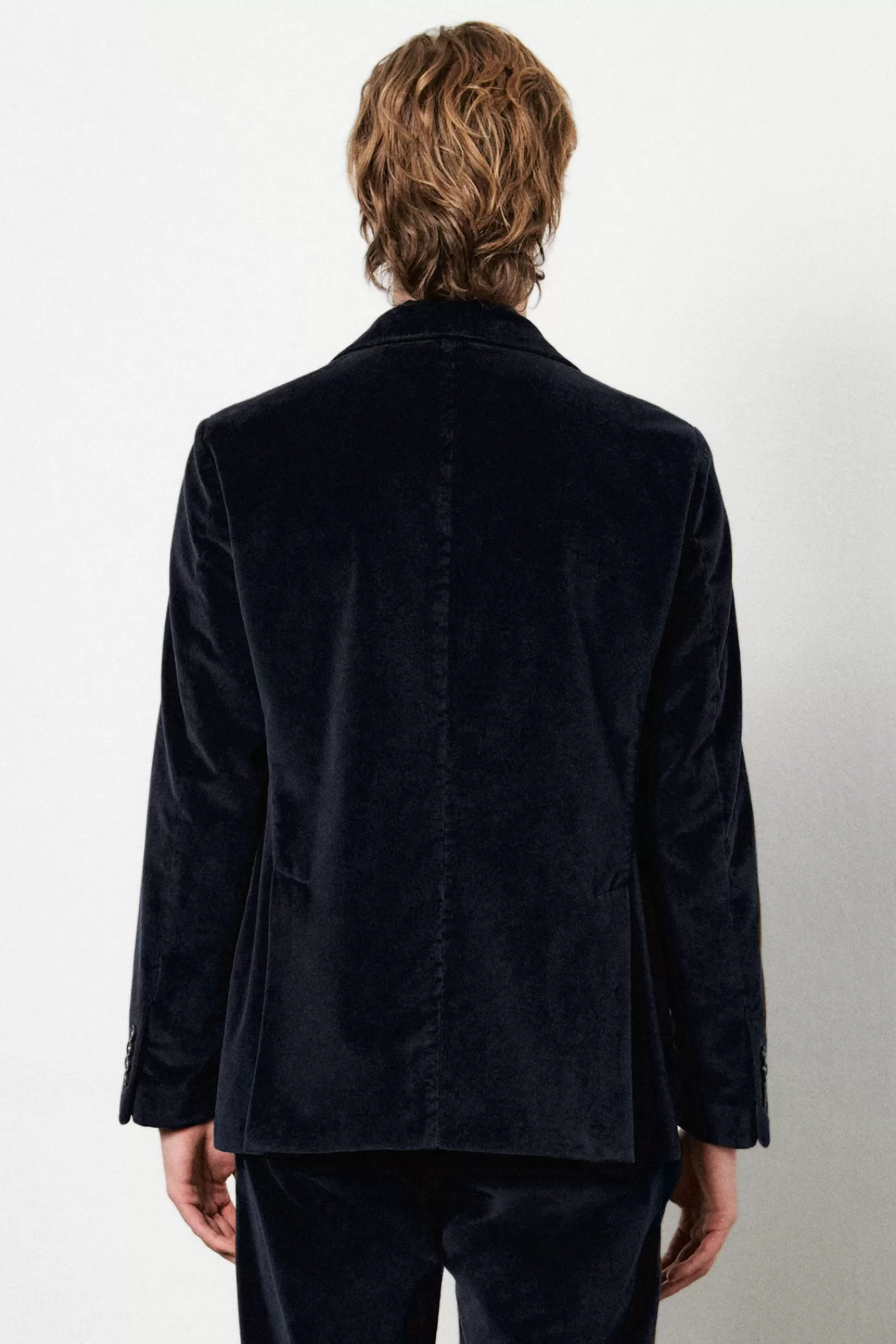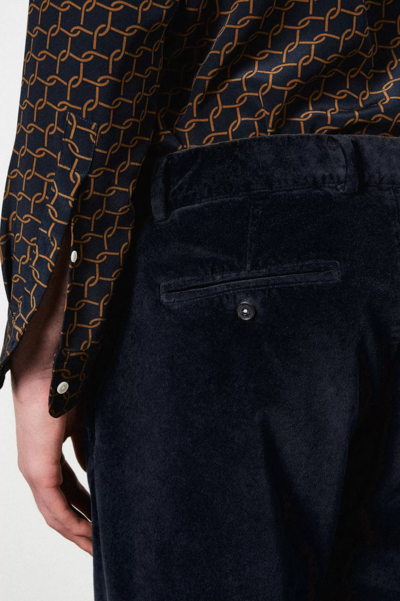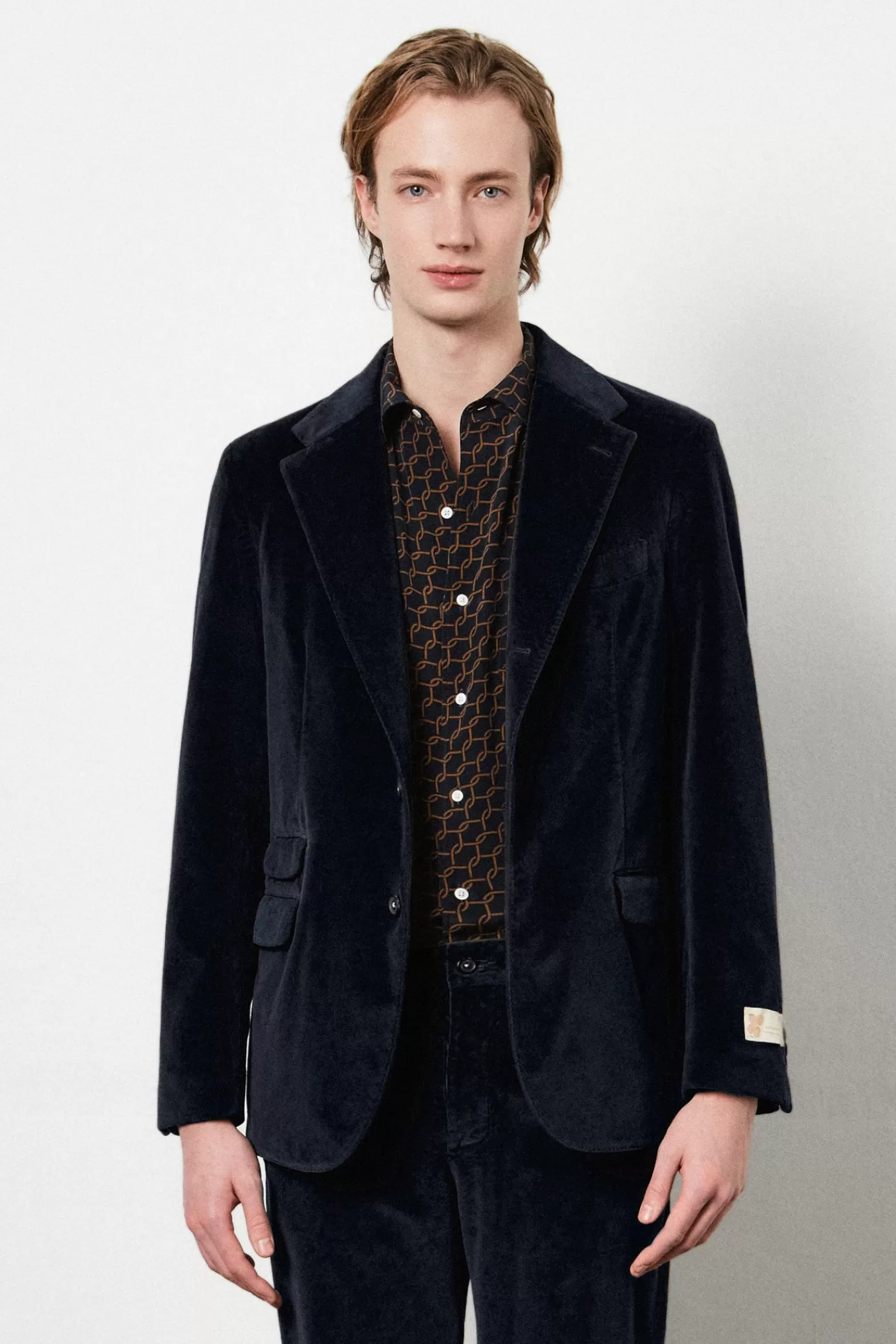 Deconstructed informal suit, with three-button jacket, regular fit, classic stitched lapel, flap pockets, dark horn buttons, two back vents, flat-front pants, slim fit, straight leg, made of pure cotton velvet.